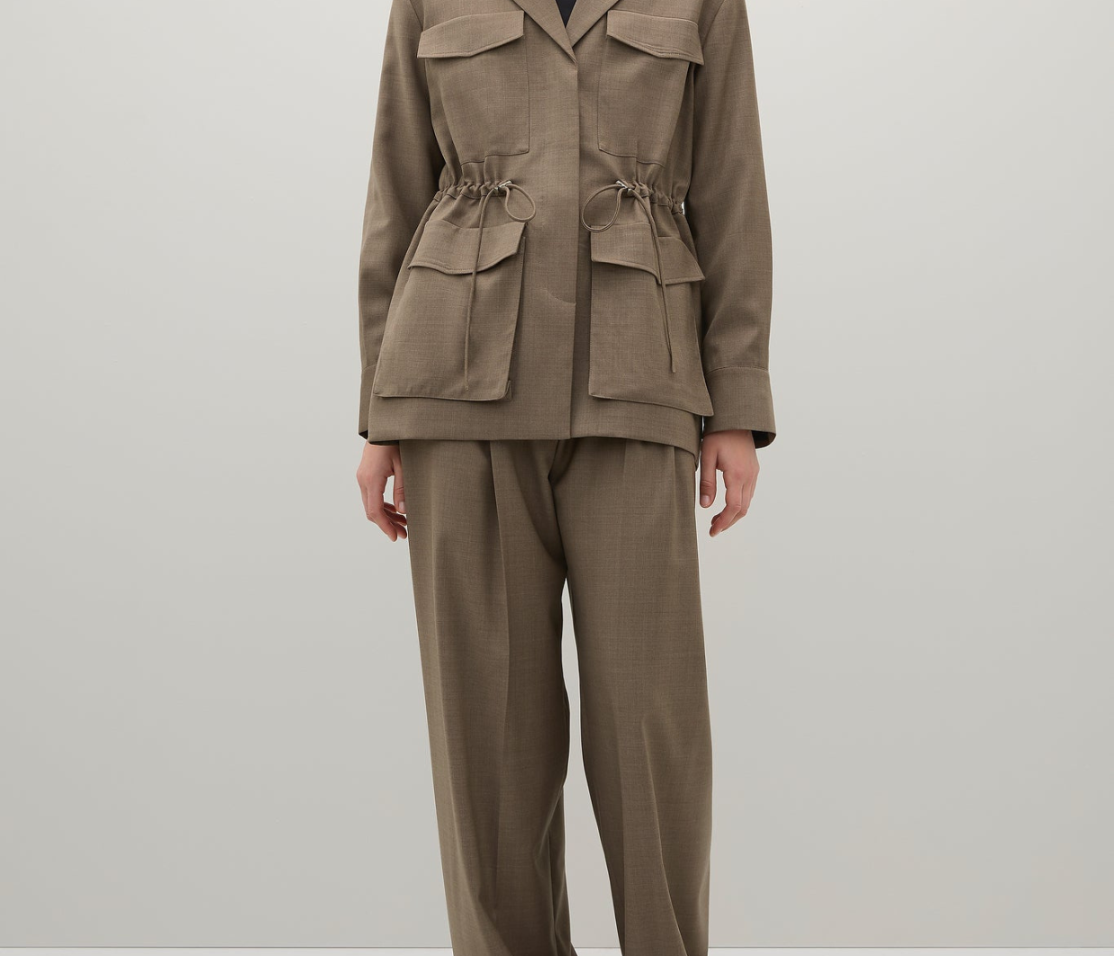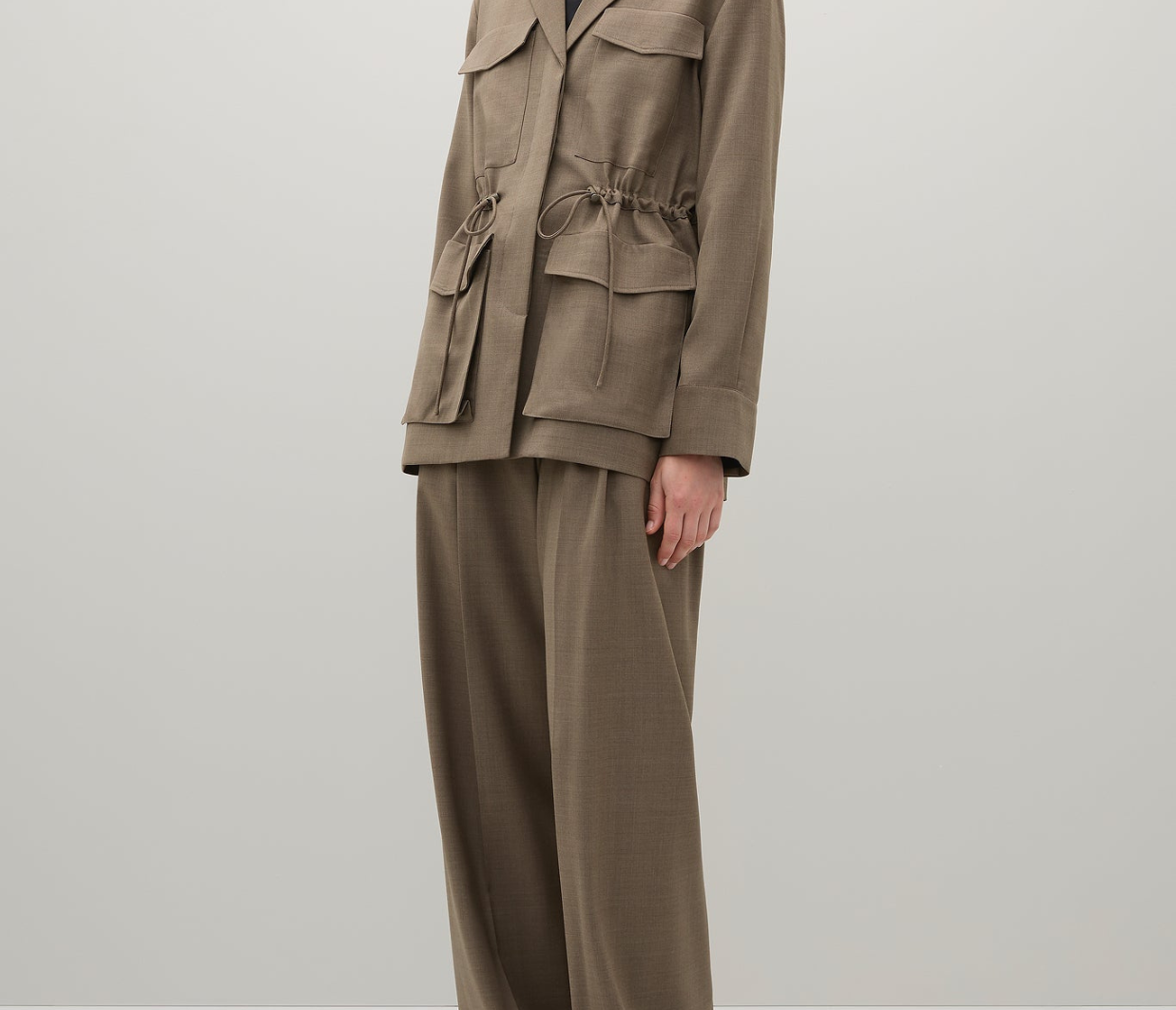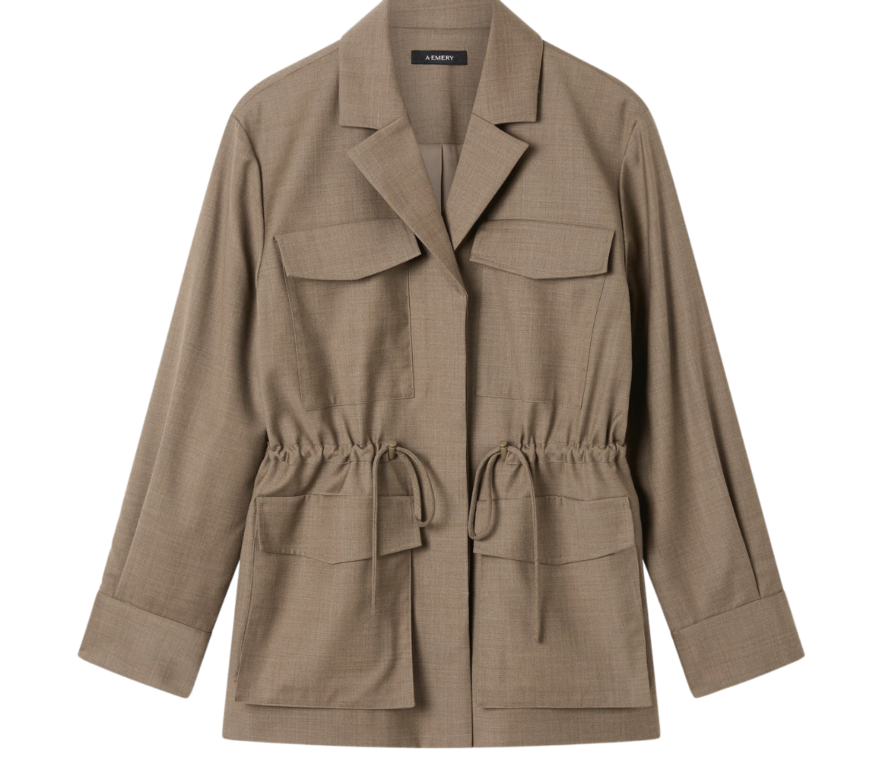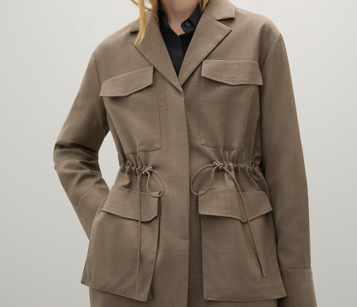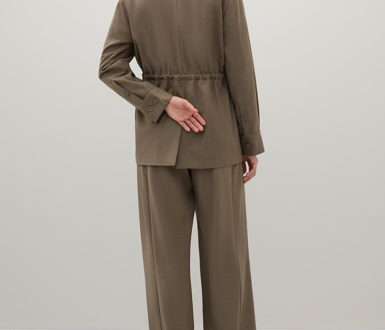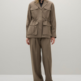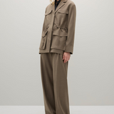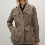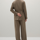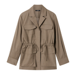 Introducing the Bennett Jacket in Flax Melange, crafted from 100% tropical wool and features a crisp lapel, four front facing pockets, two inseam pockets and a draw string waist for variety when styling.