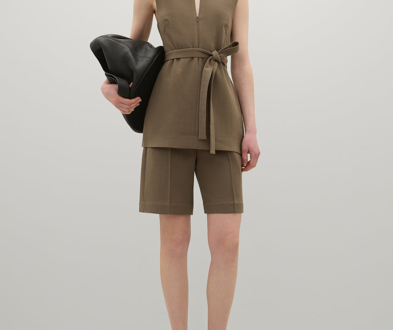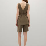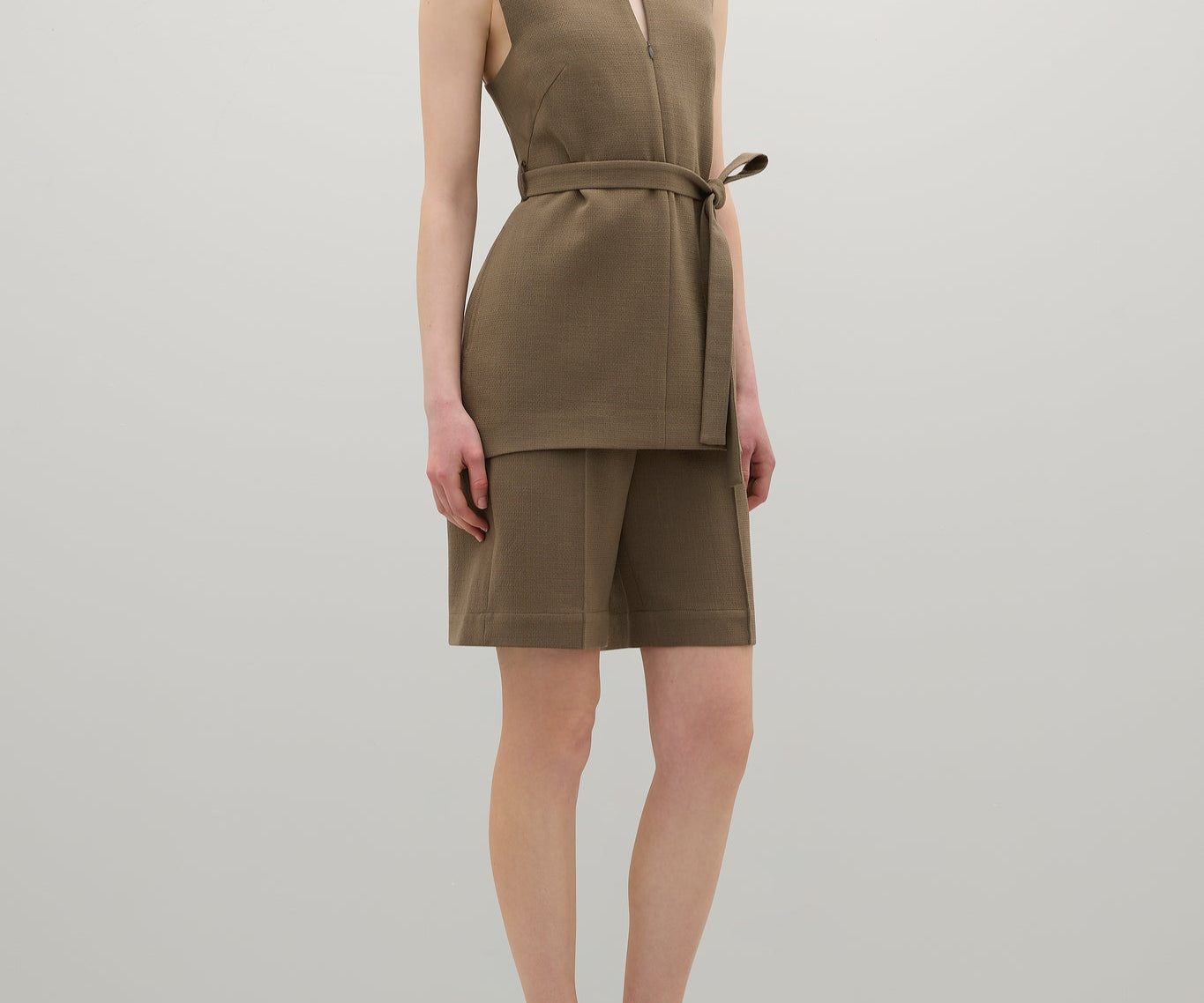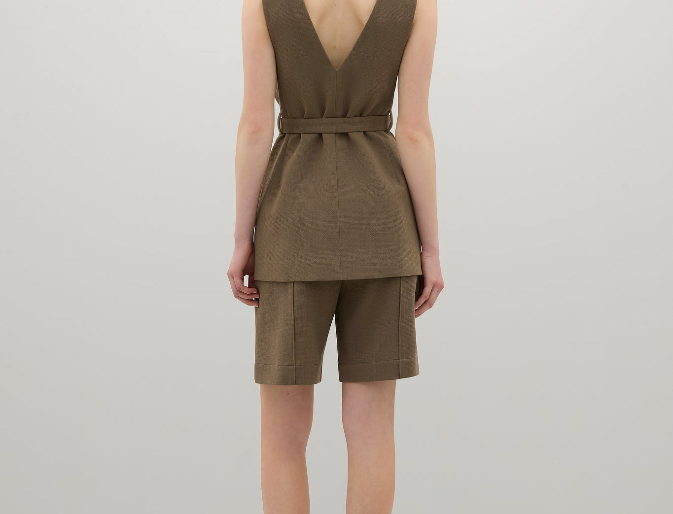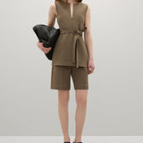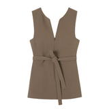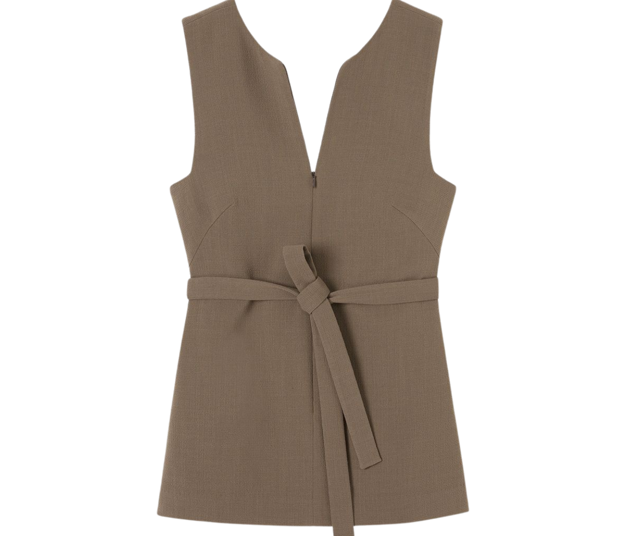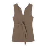 Introducing A.Emery’s Emille Tunic Top in Sable, a structured, tailored vest tunic top silhouette in the colour espresso brown hue. Designed from luxurious Turkish wool featuring a deep V-neckline with an invisible front zip that can be adjusted for versatile styling. The matching waist tie cinches the silhouette, while the clean lines and longline cut create an effortlessly polished finish.