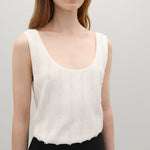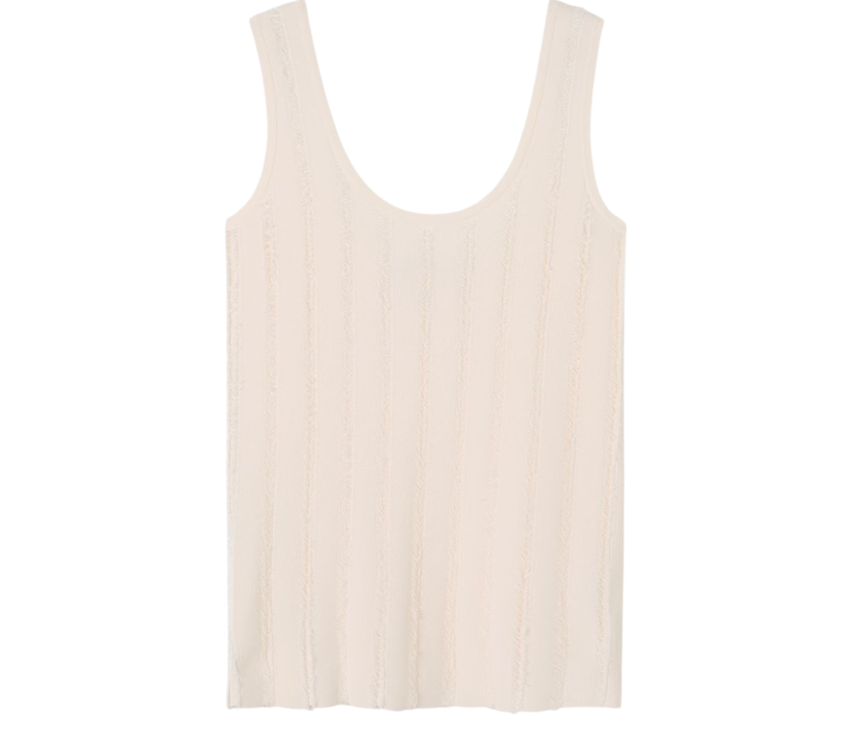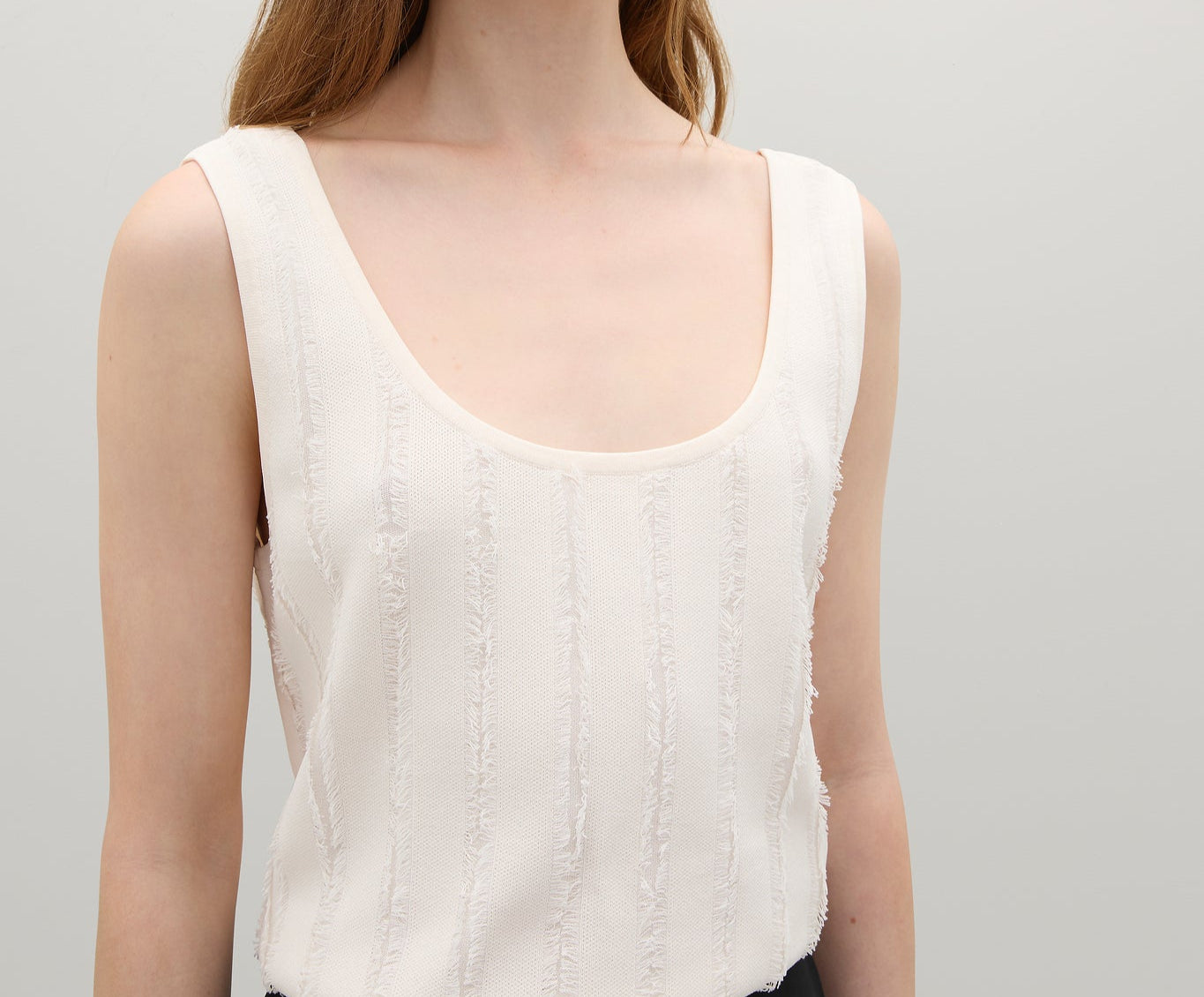 Introducing A.emery's Faye Tank in Parchment, a textured knit tank in the color cream ivory hue. Designed in A. Emery's fringe knit, featuring a scoop neckline and straight hem, this sleeveless tank offers a relaxed fit and subtle texture, adding dimension to any outfit. Perfect for layering or wearing alone through the warmer months.