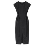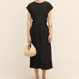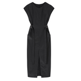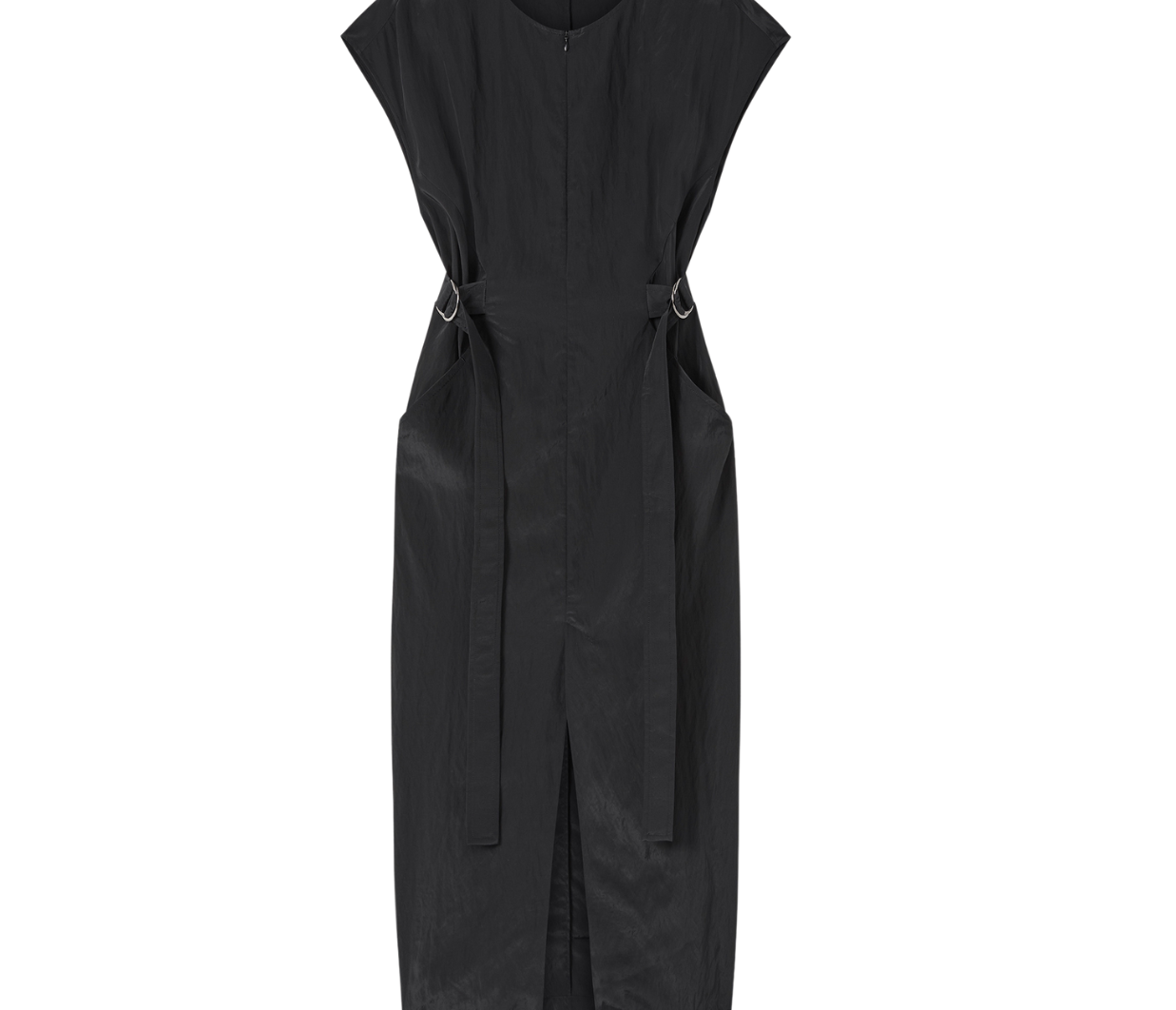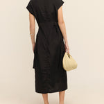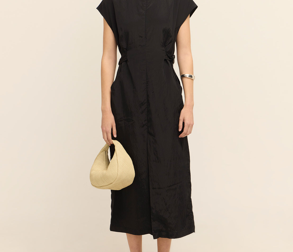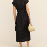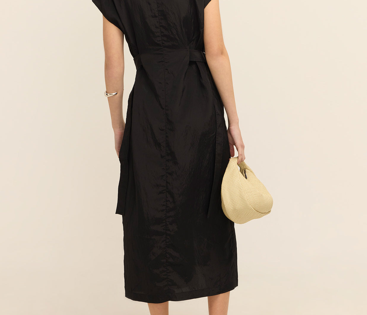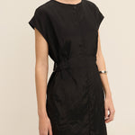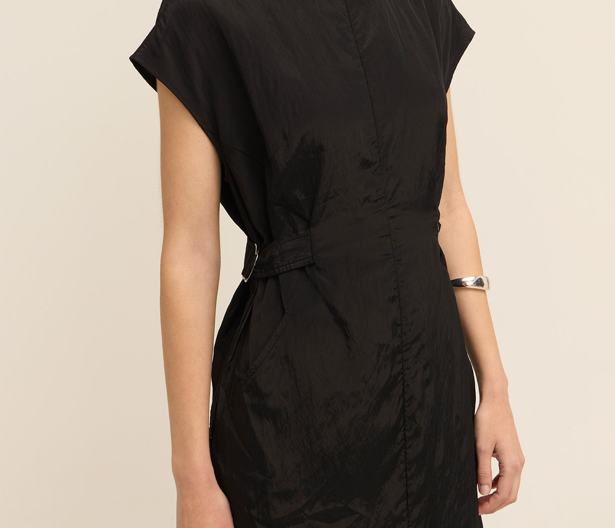 The Malette Dress in Black is a cap- sleeved relaxed fit midi length dress, a versatile piece for your summer wardrobe. The dress features a D-ring belted waist fastening and zip-front neckline. Made from a lightweight parachute fabric, its silk-like texture provides breathability and comfortability.