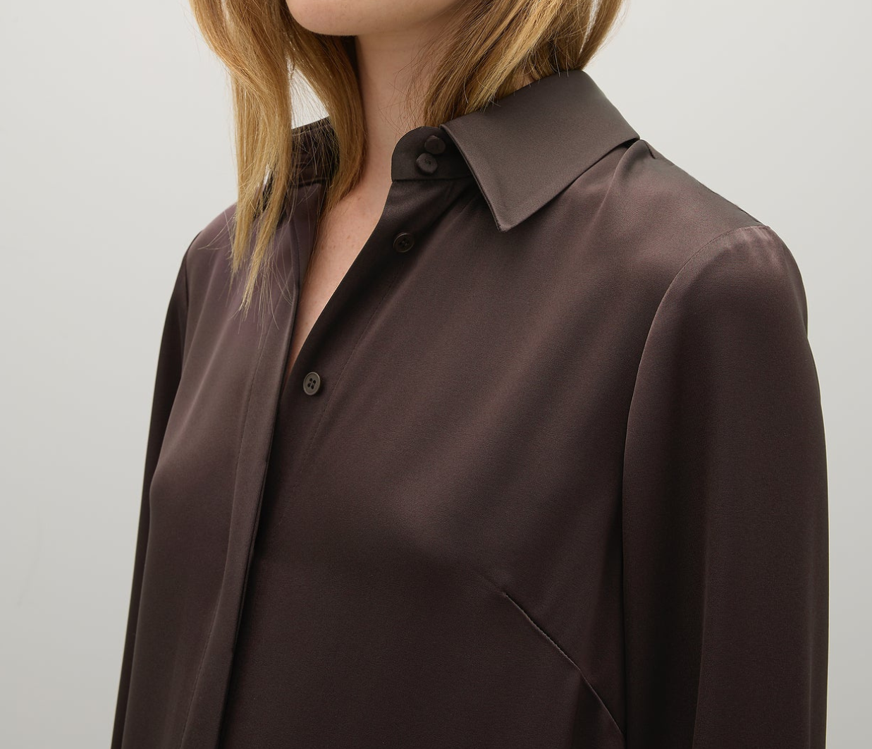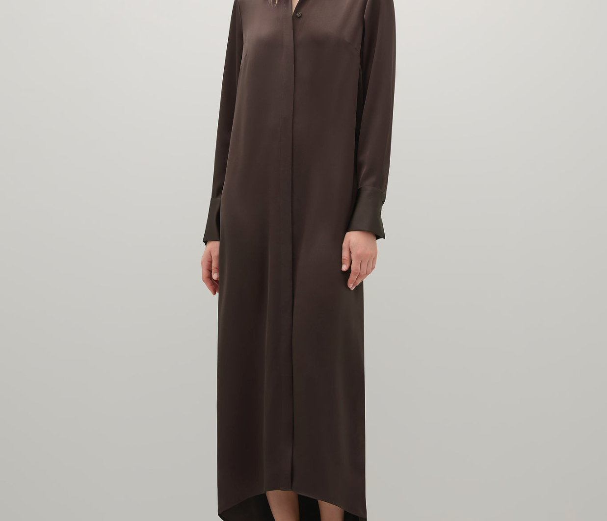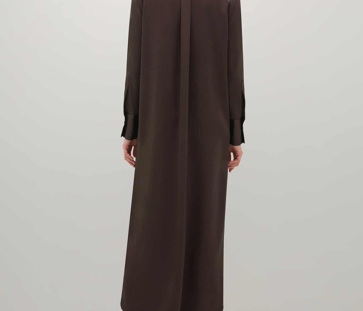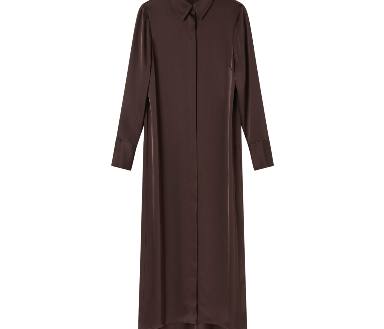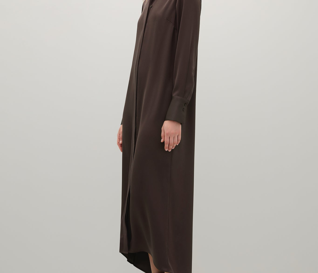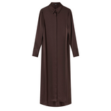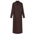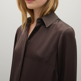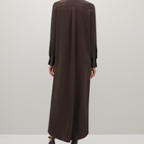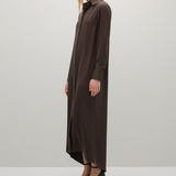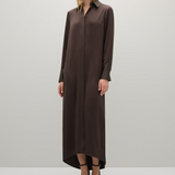 Introducing the Philippa Dress in Umber a modern take on a classic shirt dress, crafted from Japanese triacetate for a fluid fit and effortless drape on the body. This generously cut style features wide cuffs, a subtly curved hem and a hidden button placket.
