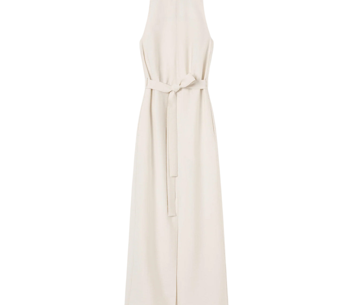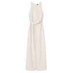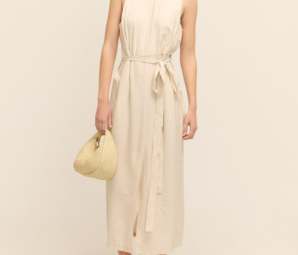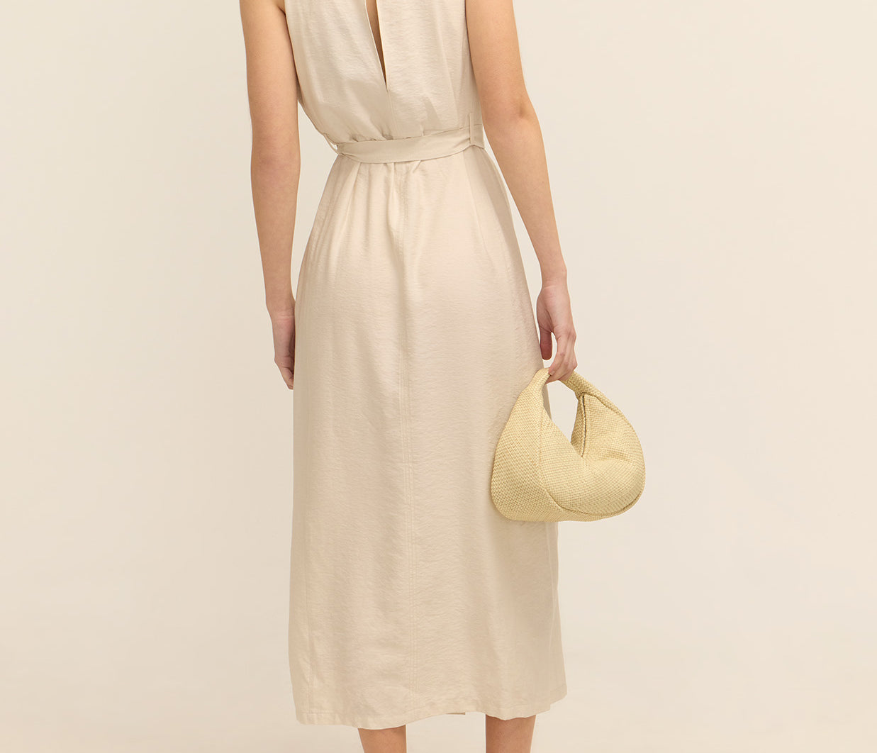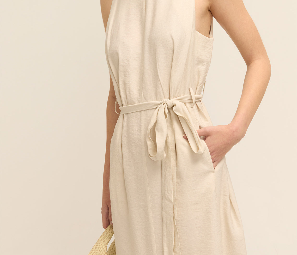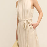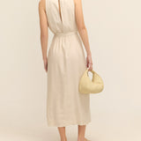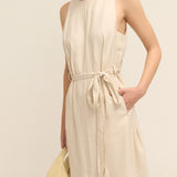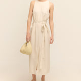 The Uli Dress in Oyster is a lightweight midi sleeveless design that seamlessly blends comfort and style. It features a square armhole and a center front seam, enhancing its modern aesthetic. With hidden side pockets for practicality, a back split with a button closure adds an elegant touch. The dress is completed with a removable tie belt, allowing for customizable styling. Perfect for warm days or layered looks, the Uli Dress is a versatile addition to any wardrobe.
