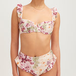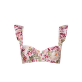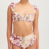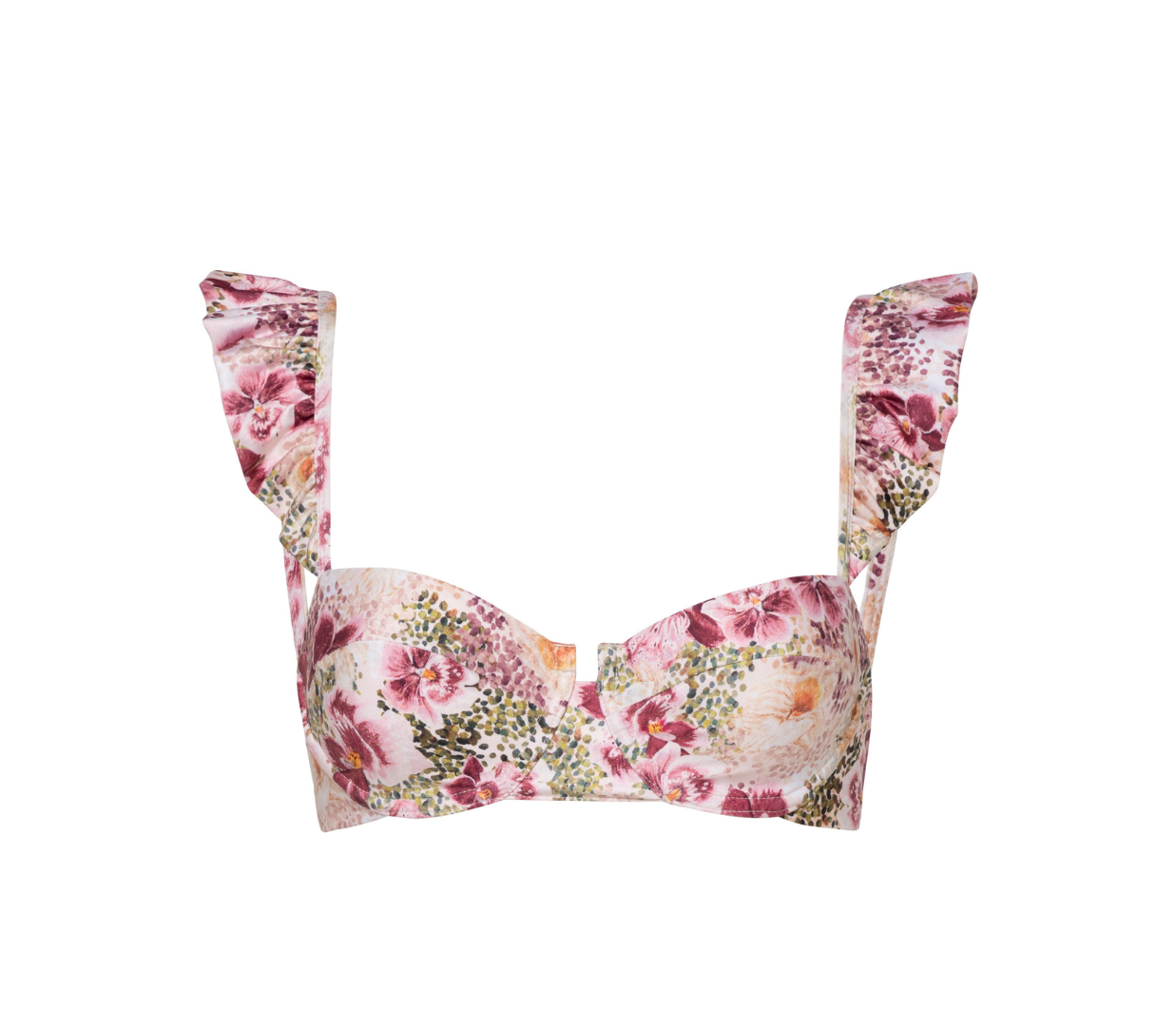 Kiwi Bikini Top in Florecer has a structured fit with underwiring at the cup and ruffled straps. Indulge in luxurious comfort and effortless style with the bikini top meticulously designed to provide both support and sophistication. Crafted with the finest attention to detail, this bikini top features strategically placed underwire that offers unparalleled lift and shaping, ensuring a flattering silhouette for every body type.