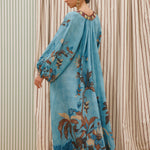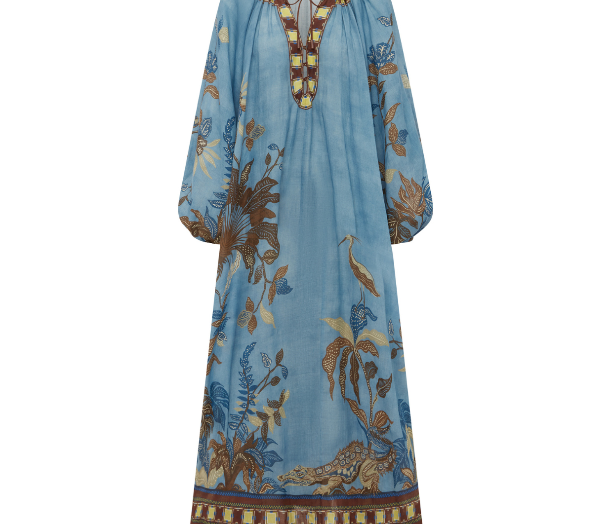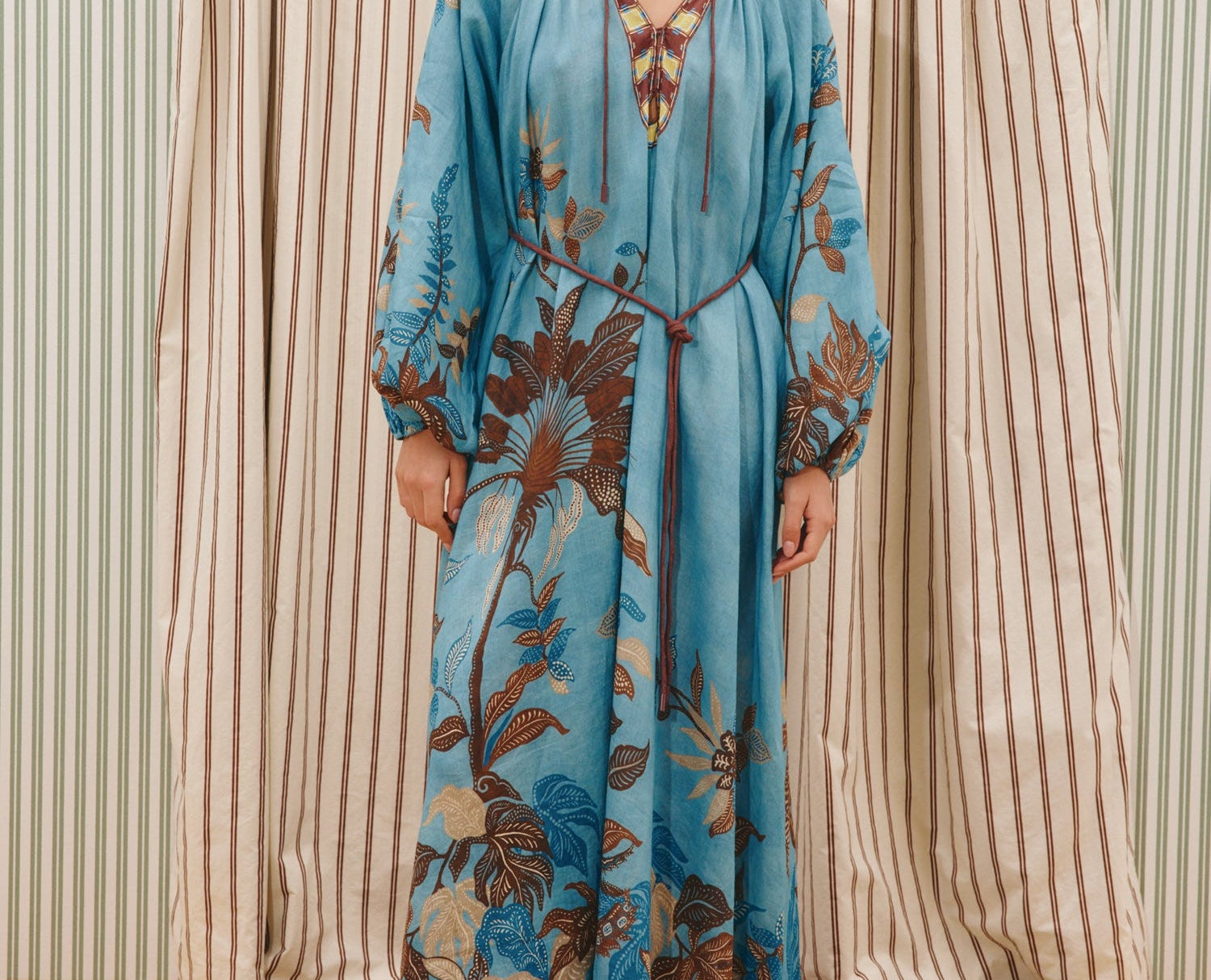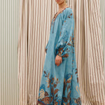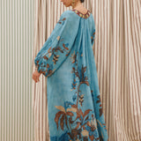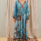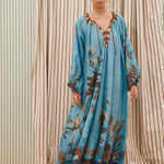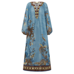 Introducing the Alemais Georgie Pool Dress, a relaxed maxi silhouette. The Georgie Pool Dress features a softly gathered neckline with rouleau ties and bespoke toggles; the dress opens to a center-front neck split with delicate button-and-loop closures. Blouson long-sleeve gathered sleeves are finished with elasticated cuffs, while a self-covered rouleau belt with bespoke toggles allows for adjustable shaping at the waist. Perfect dress for a summer evening.