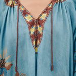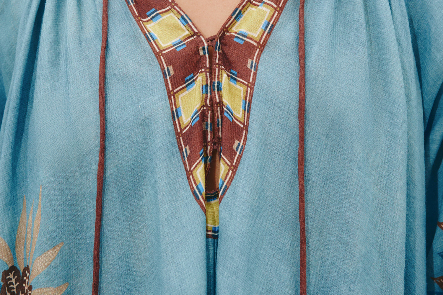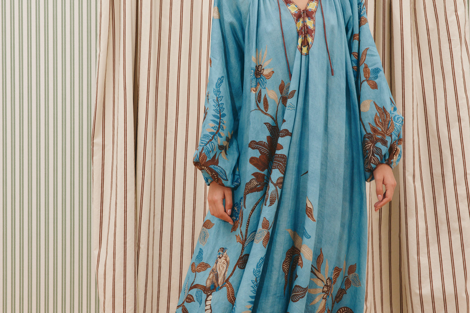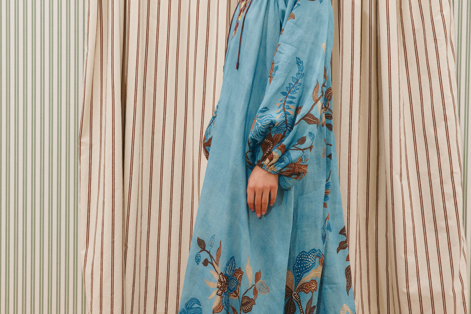 - Gathered neck with rouleau ties and bespoke toggles