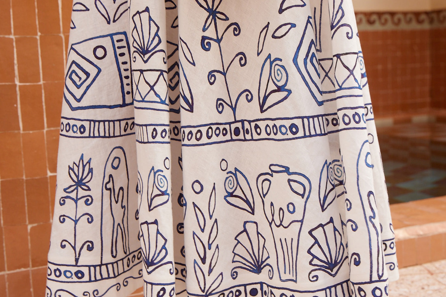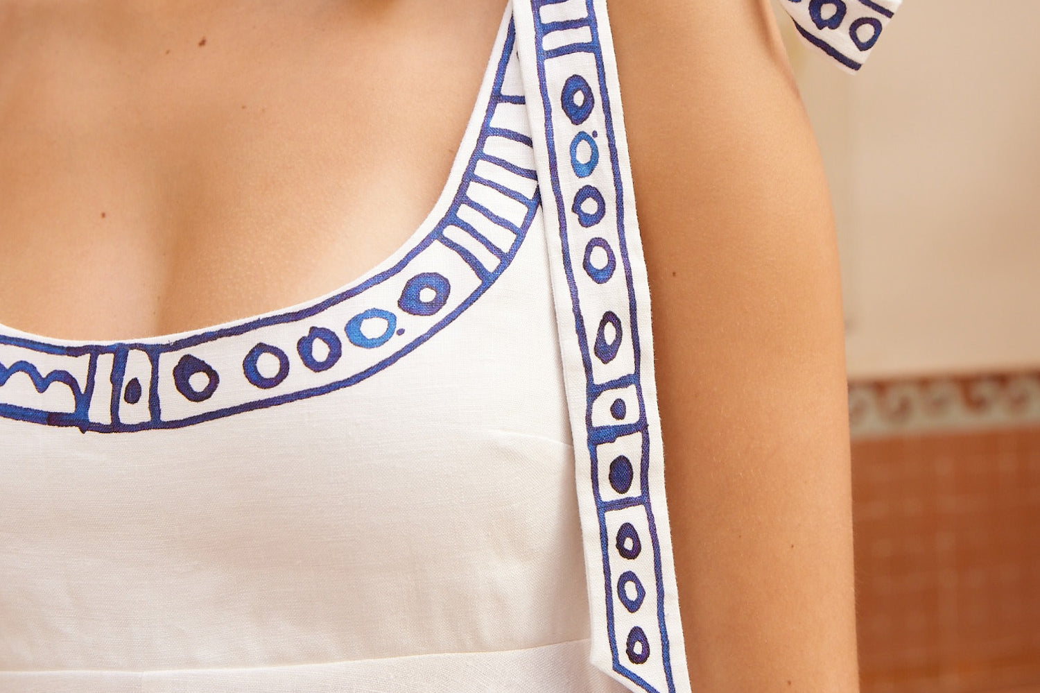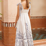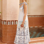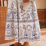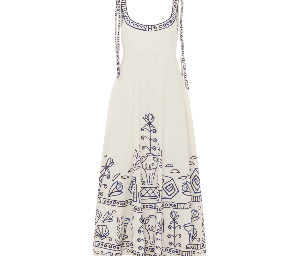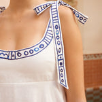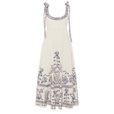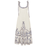 Introducing Alemais's Leela Ballet Sundress in Cream, a midi sundress silhouette in blue print. Designed with Laurence Lennaert's artwork of Mediterranean line drawings, the sundress features adjustable self-tie straps and a shirred back bodice for a flexible, flattering fit. Finished with an invisible side zip and inseam pockets, it’s a timeless piece for sunlit days.