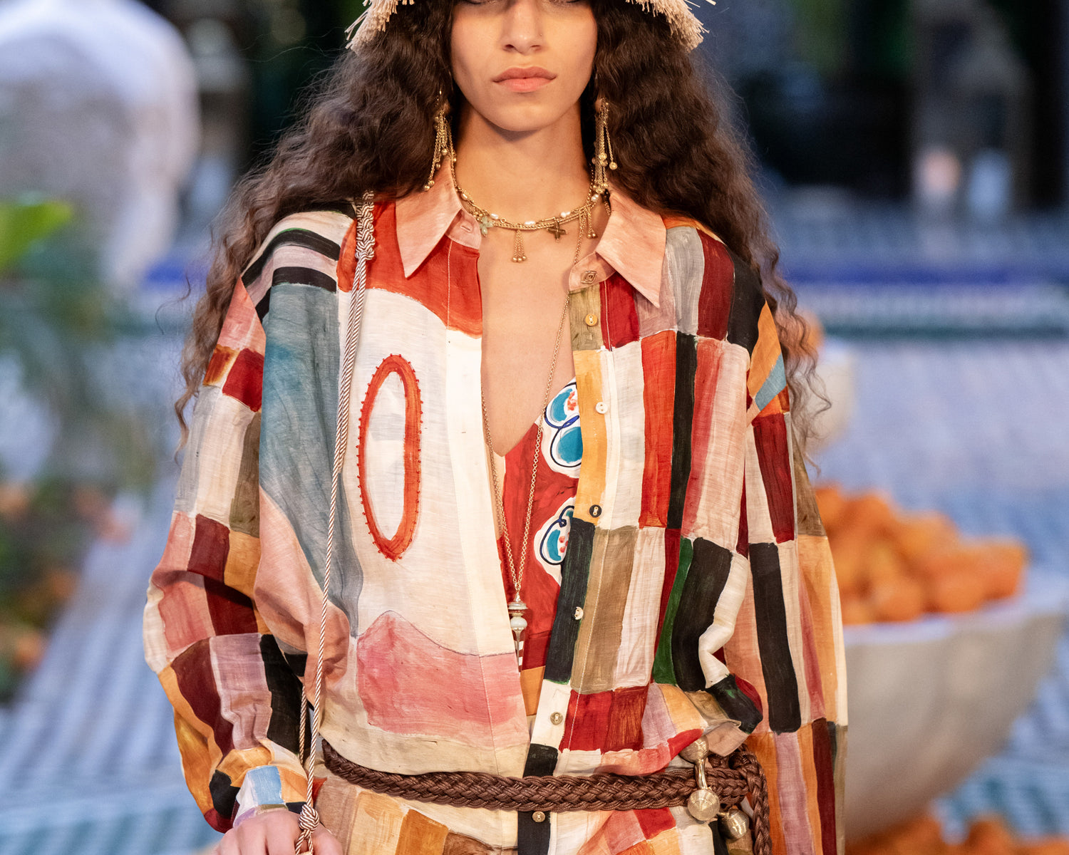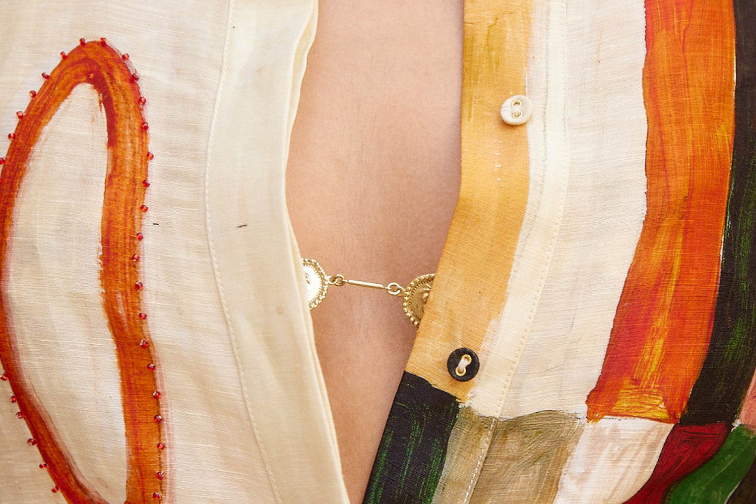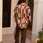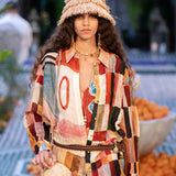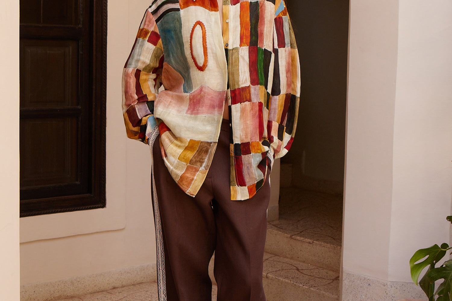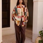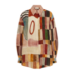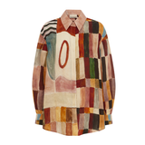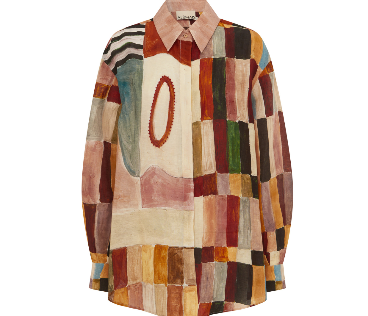 Introducing Alemais's Marjorelle Shirt, a long-sleeve collared shirt silhouette in a print painted by Laurence Leenart. The artwork on the shirt captures Leenaert’s signature abstract and handcrafted aesthetic, blending earthy and sun-warmed tones such as terracotta, ochre, rust, cream, and moss green. The design resembles a patchwork of organic shapes and painterly brushstrokes.