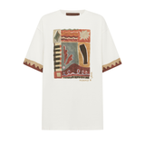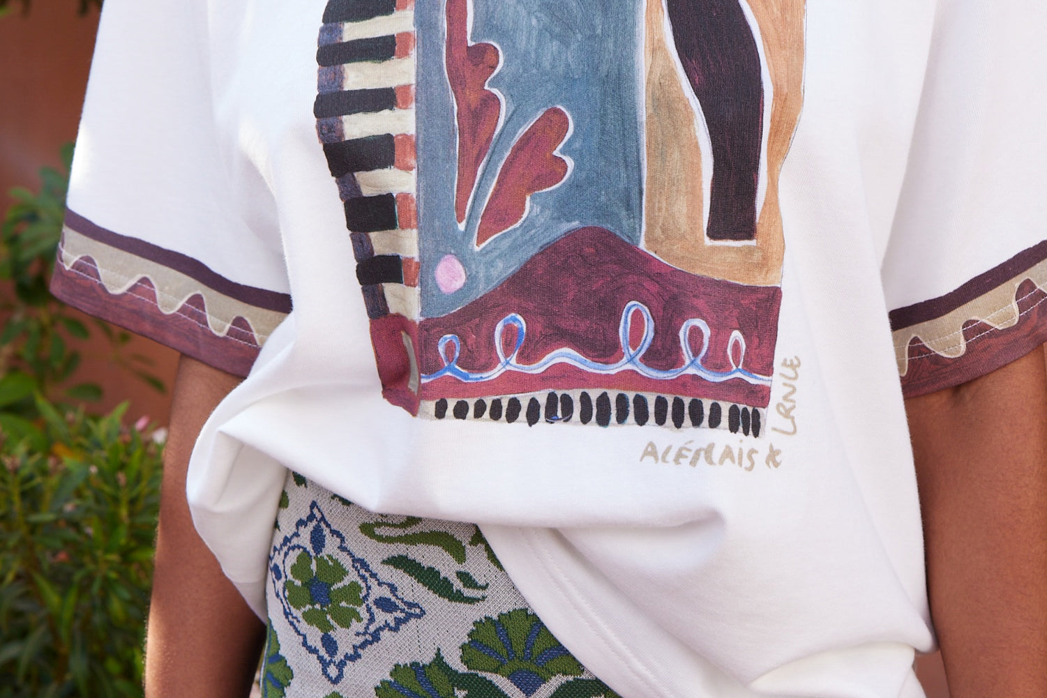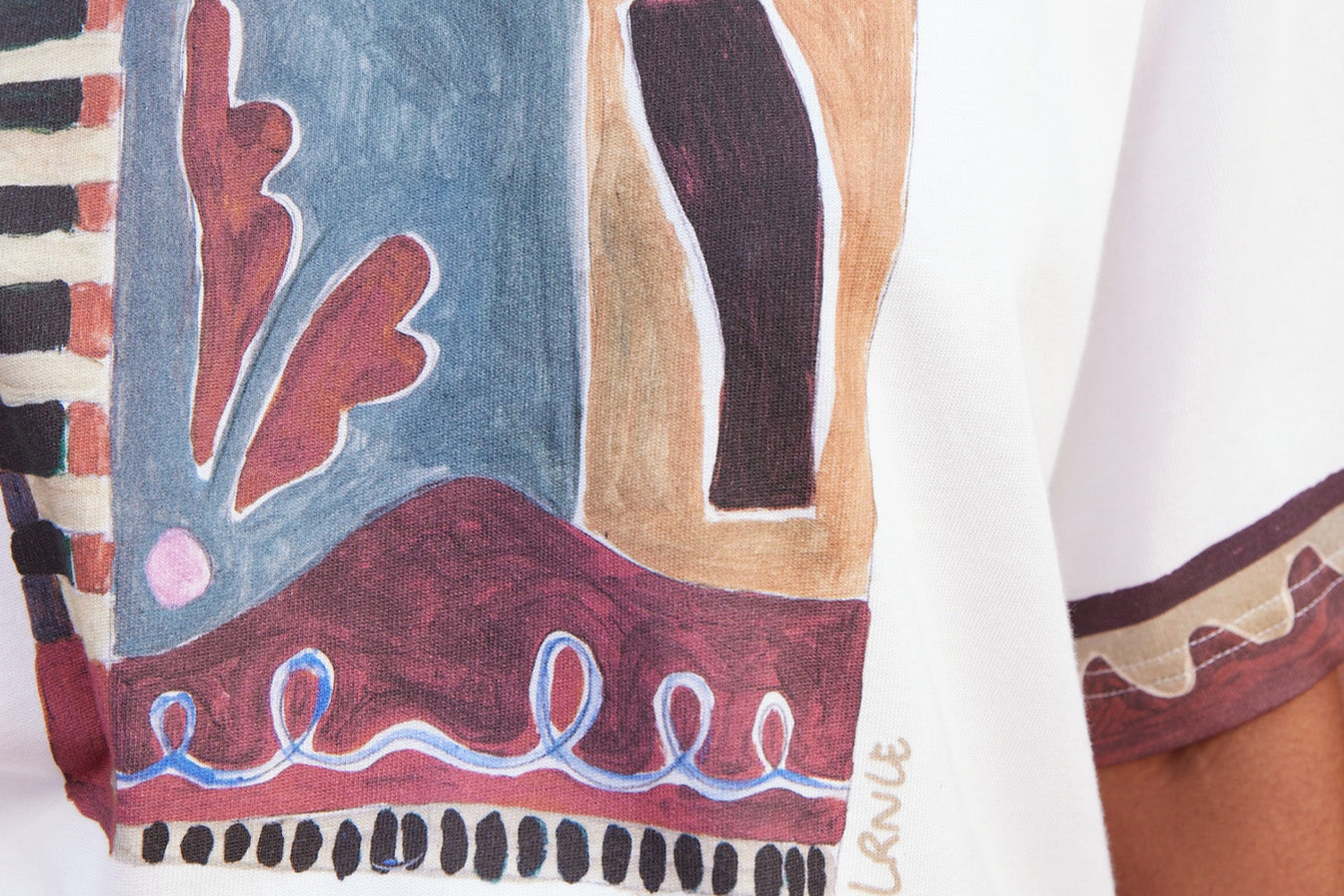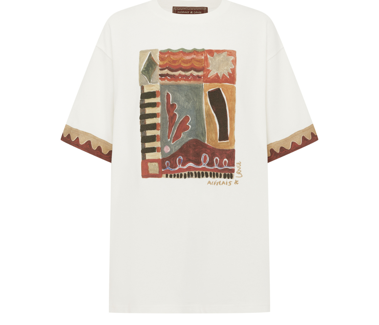 Introducing Alemais's Michelle Classic Tee in Cream, a classic T-shirt silhouette with print placement painted by Laurence Leenart. The artwork on the shirt captures Leenaert’s signature abstract and handcrafted aesthetic, blending earthy and sun-warmed tones such as terracotta, ochre, rust, cream, and moss green.