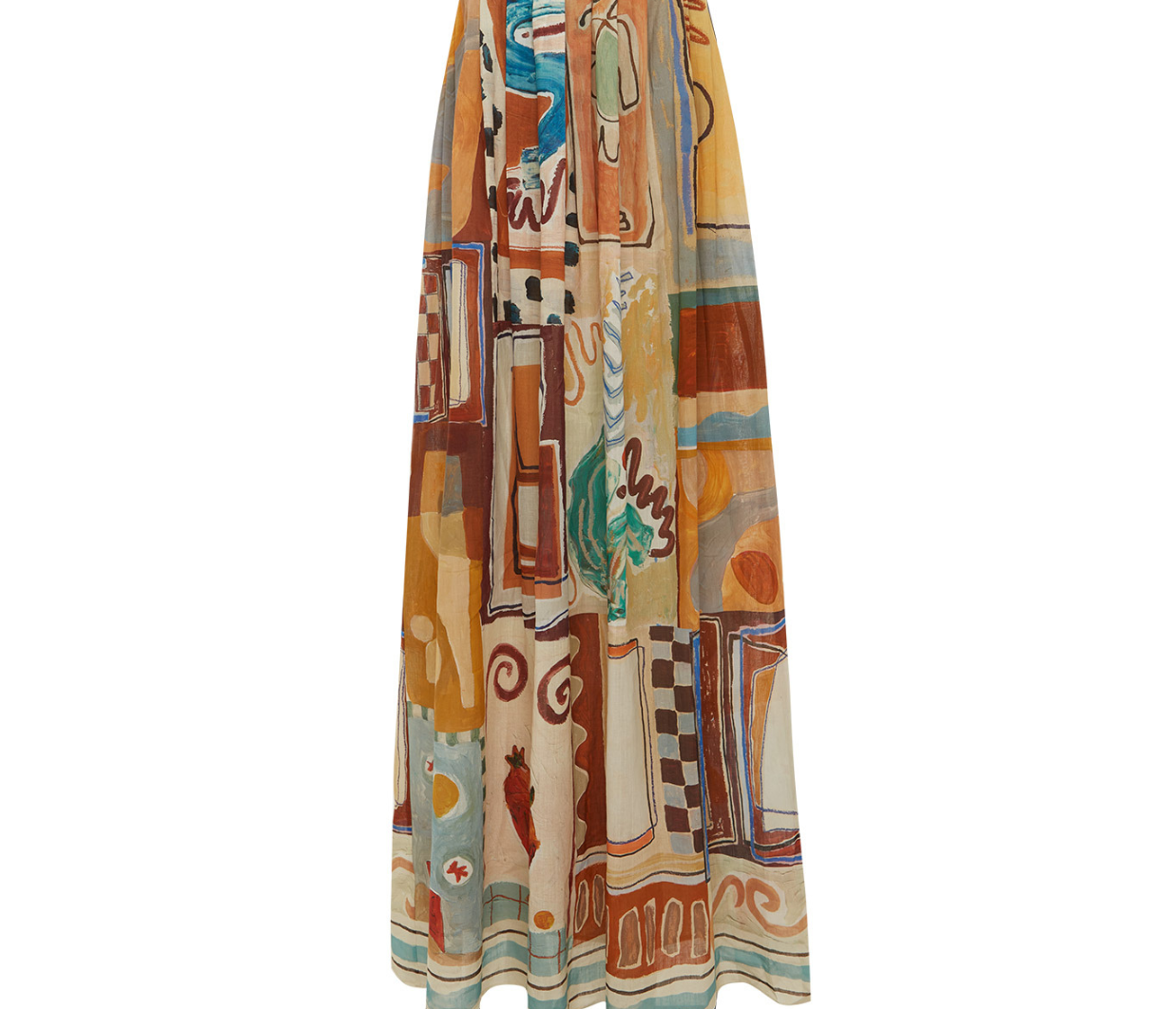 Introducing Alemais's EXCLUSIVE Michelle Maxi Dress, a strapless maxi dress silhouette in Alemais's exclusive print. The print features abstract shapes, geometric motifs, and expressive brushstrokes in warm earthy tones with cool accents, creating a collage-like, wearable artwork. Designed in a relaxed fit with a flowy draping to ankle length. Perfect for a day-to-night event dressing.