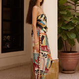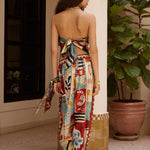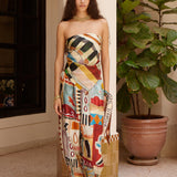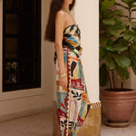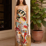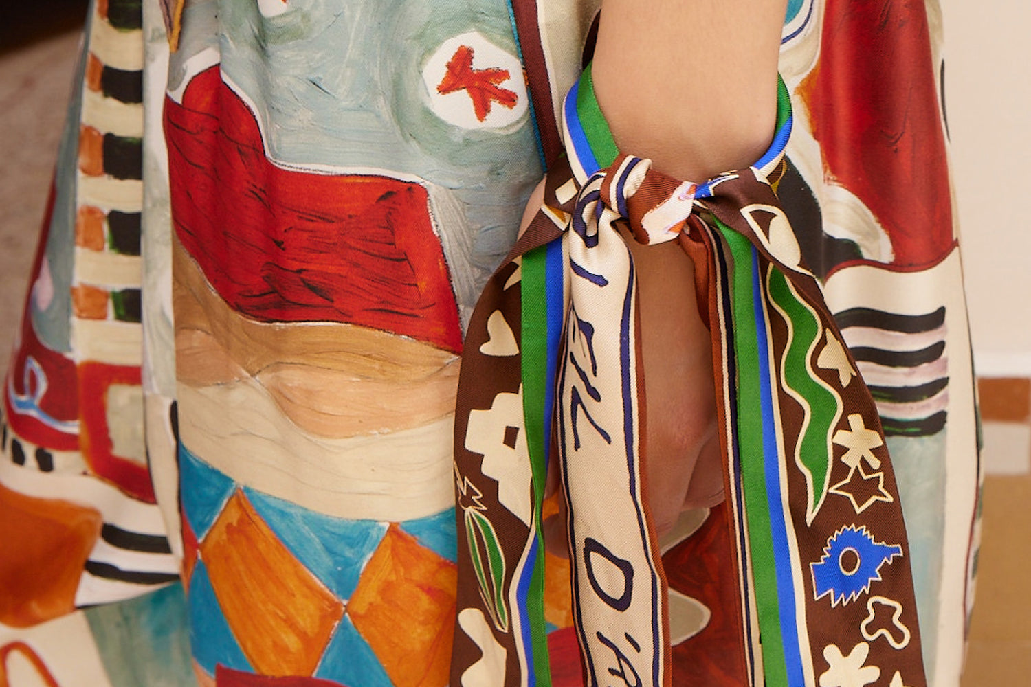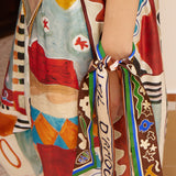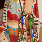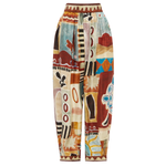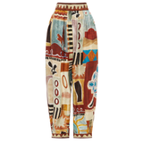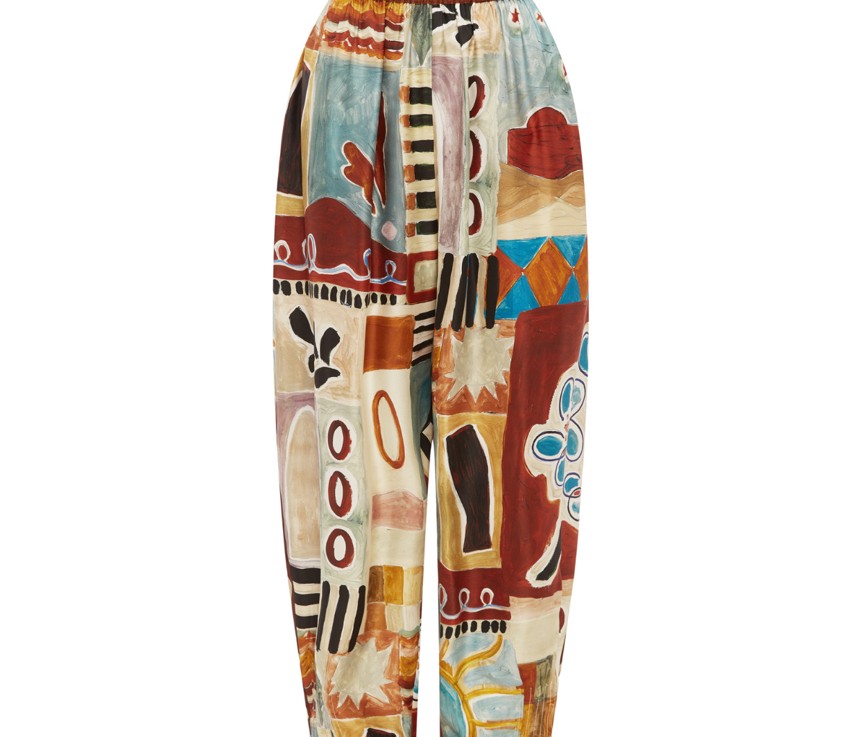Introducing Alemais's Michelle Tapered Silk Pant, a relaxed tapered pant silhouette in a print painted by Laurence Leenart. The artwork on the shirt captures Leenaert’s signature abstract and handcrafted aesthetic, blending earthy and sun-warmed tones such as terracotta, ochre, rust, cream, and moss green. The design resembles a patchwork of organic shapes and painterly brushstrokes. A classic shirt, perfect for warm weather days.