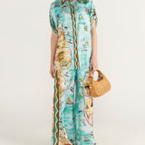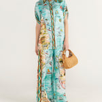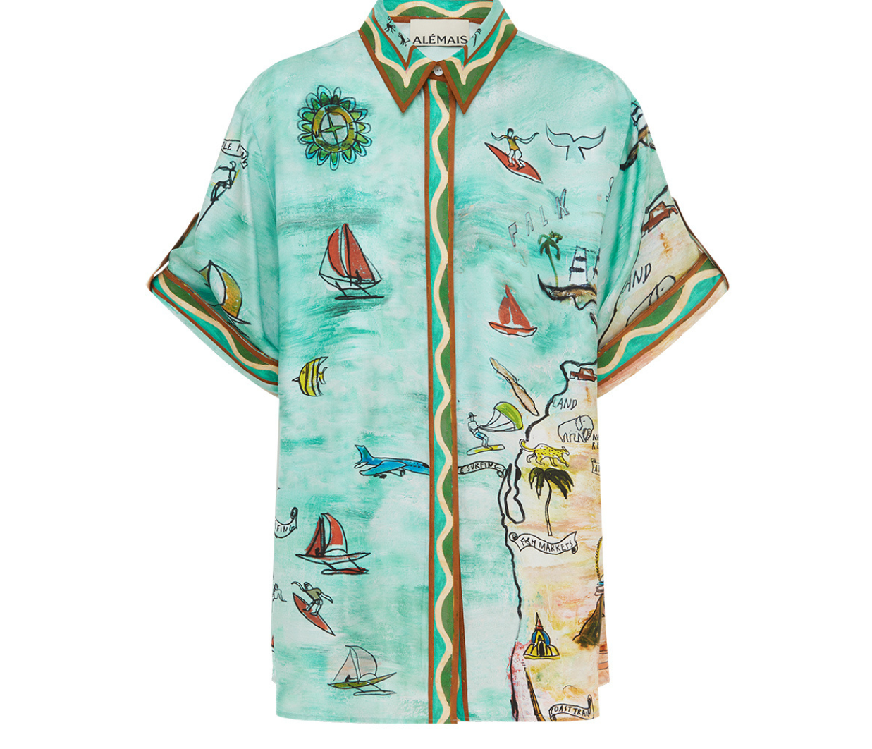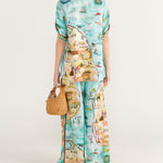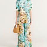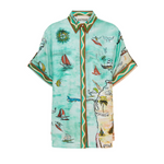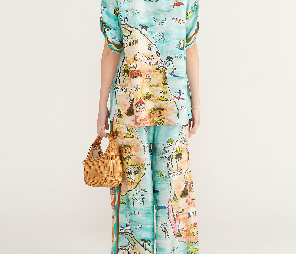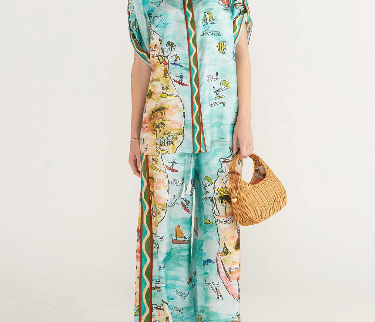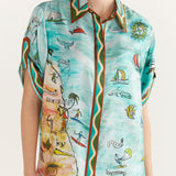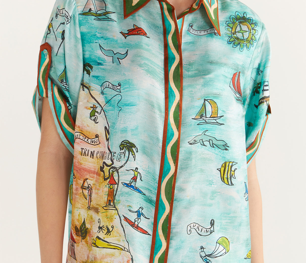 The Swell Shirt in Multi features a relaxed fit in luxurious 100% silk twill, with a vibrant waving graphic trim and Adam Lester’s unique interpretation of the World map. This design captures the nostalgia and excitement of travel through rich colours and textures, evoking the rhythmic movement of ocean swells.