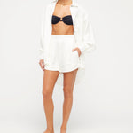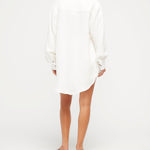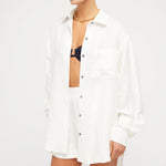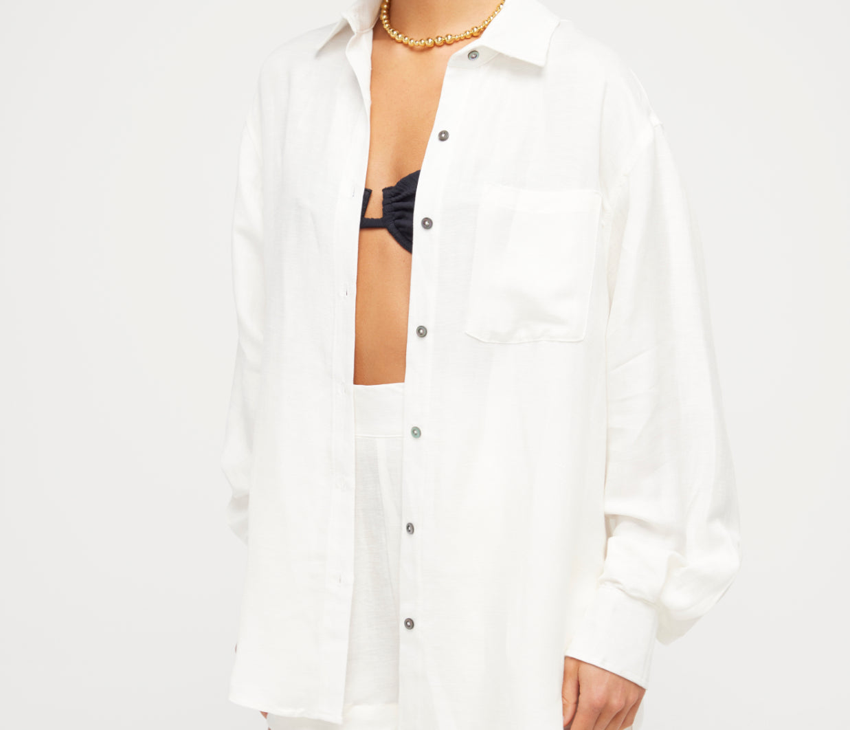 The Oversized Button-Down Pool Shirt Dress draws inspiration from the grace and convenience of slipping into a button-down post-pool dip. Crafted in Anemos’ distinctive Linen Cupro fabric, this garment exudes sophistication and adaptability, seamlessly transitioning from poolside lounging to evening elegance once the sun sets.