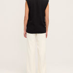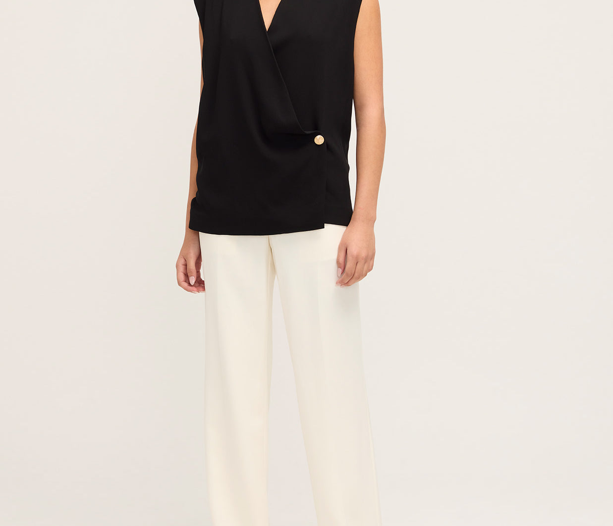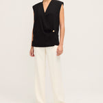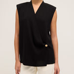 Introducing the Venice Top, crafted from fully lined midweight viscose-crepe in black. This sophisticated style showcases a V-neckline that drapes across the body, culminating in an asymmetrical gold ANINE BING engraved button closure. It's finished with subtle shoulder pads and internal ties for a secure fit.
