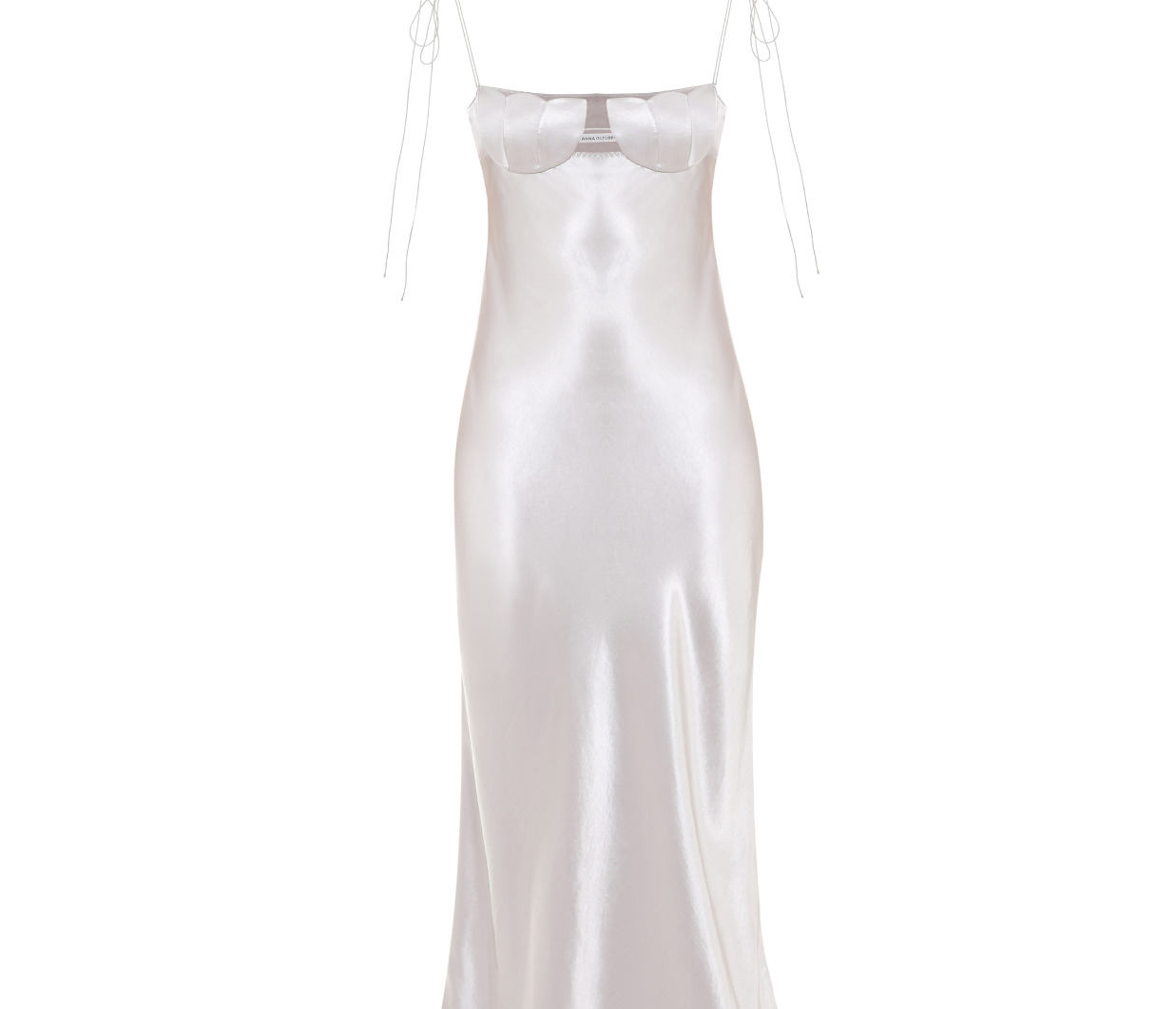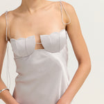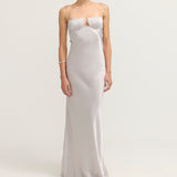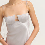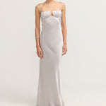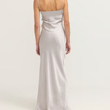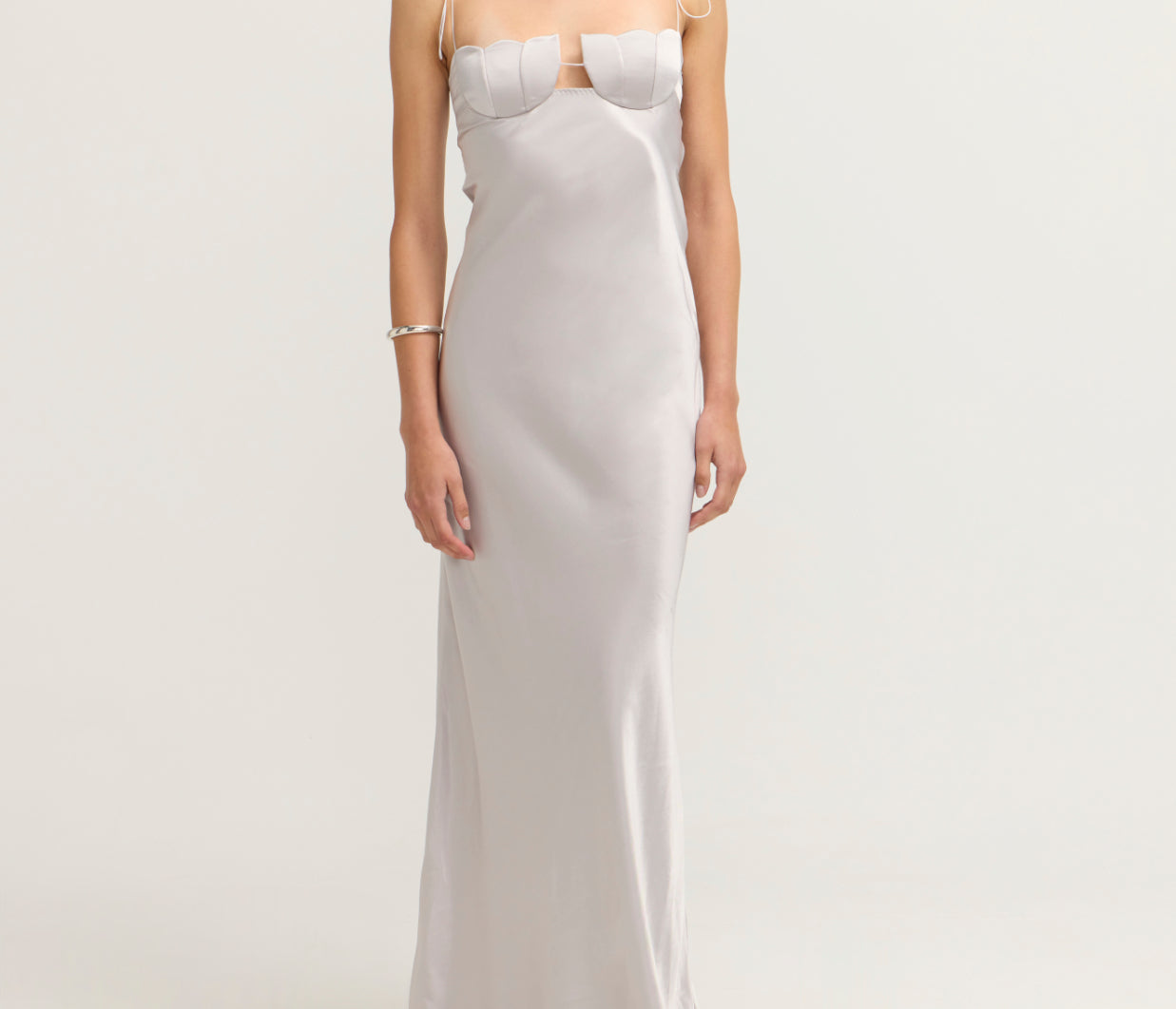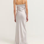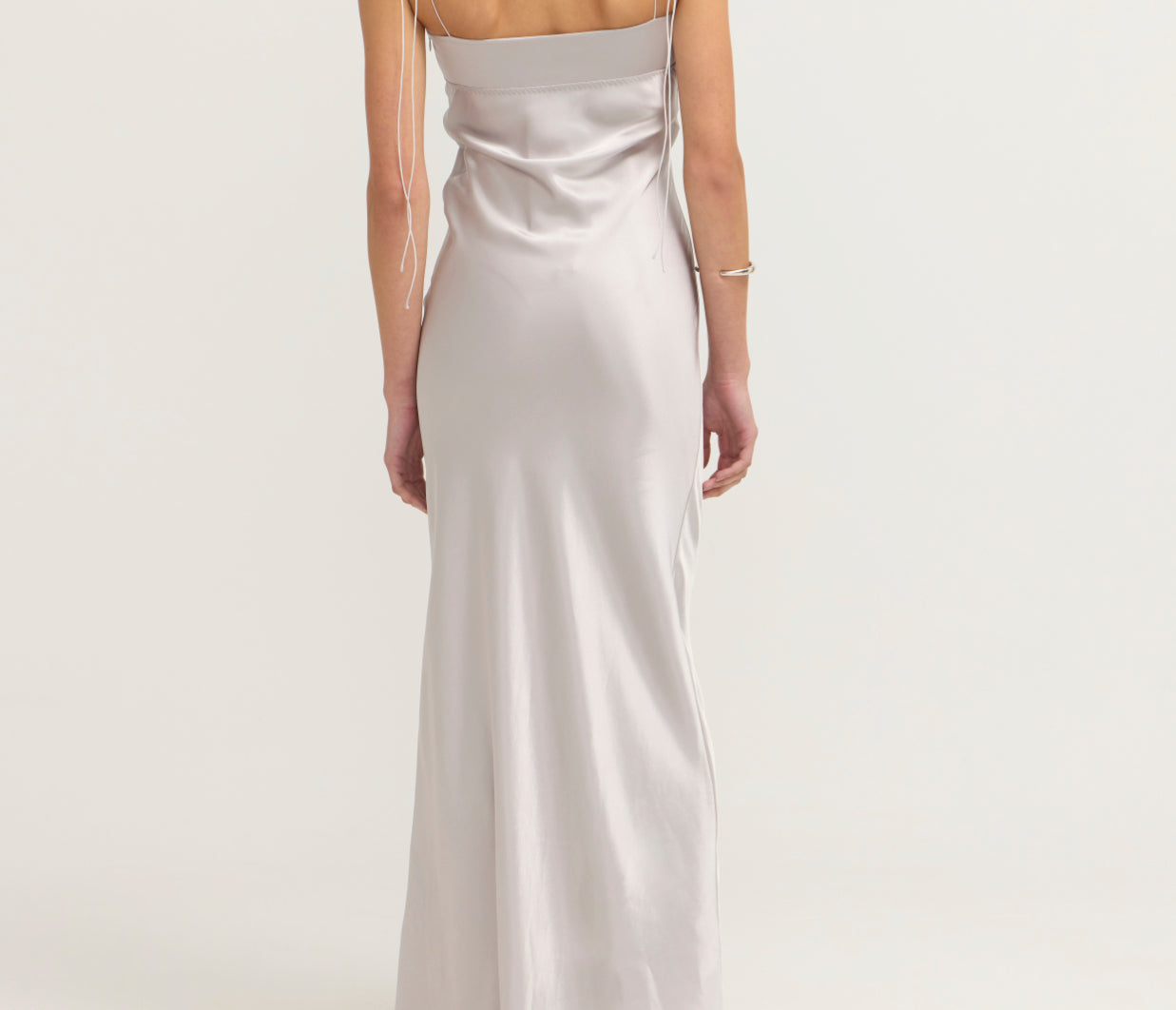 Embrace timeless elegance with the Anna October Tulip Satin Maxi Dress in Silver. Crafted from luxurious silver satin, this stunning gown features a unique tulip petal bodice and delicate shoulder ties, making it a perfect choice for special occasions.