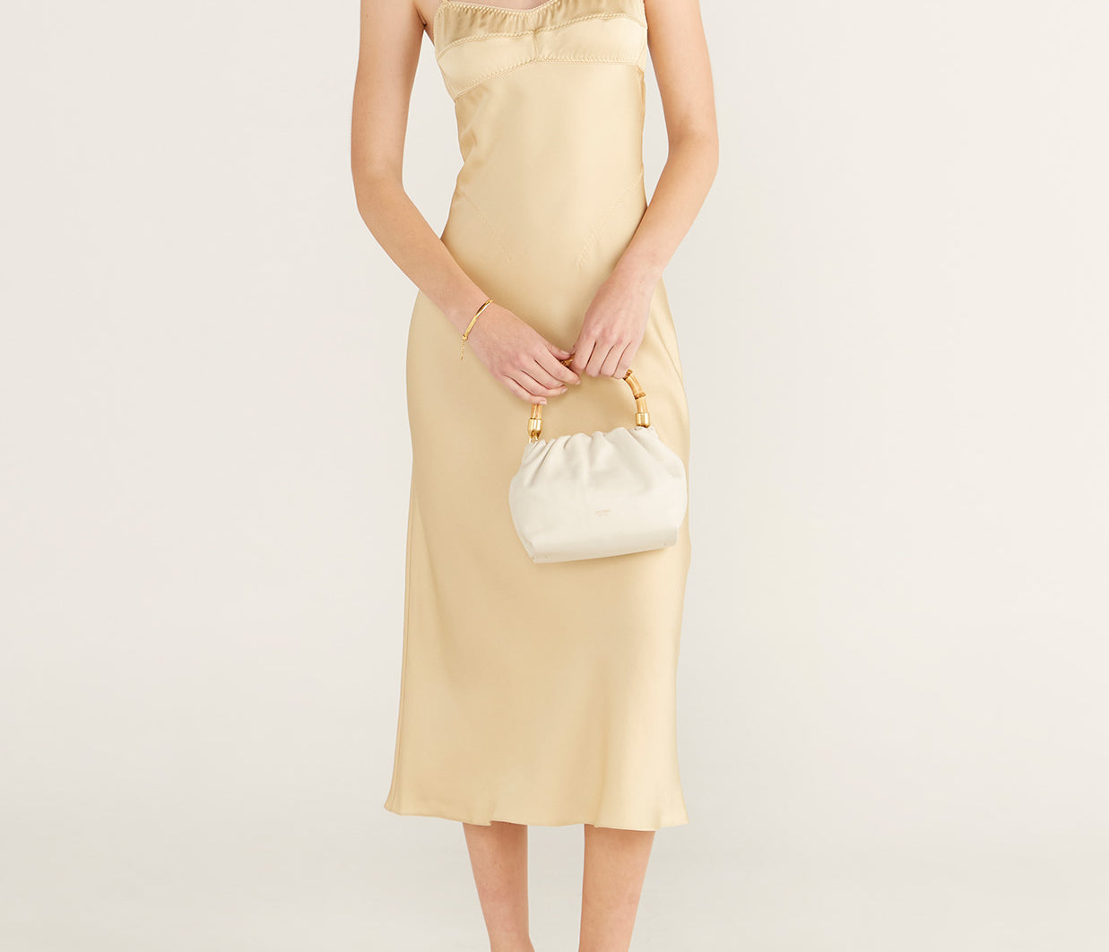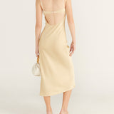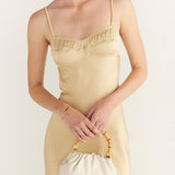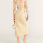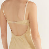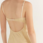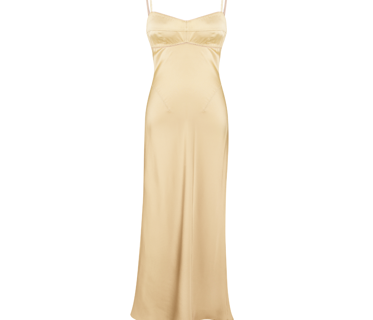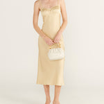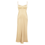 Introducing Anna October's Waterlily Midi Dress in Golden exclusive luxury piece features a sleek satin slip silhouette with gathered bustier cups and figure-enhancing darts at the waist. Its lustrous golden hue and delicate straps add a touch of allure, making it perfect for sophisticated events. Complete your look with strappy heels and minimalist jewellery to let this exquisite dress truly shine.