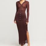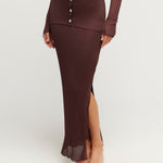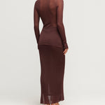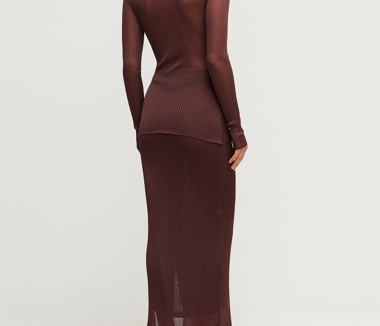 The Carrie Midi Skirt is the perfect combination of sophistication and contemporary style. This slip-on style is crafted from a sheer ribbed fabric with lining underneath, providing an elegant touch. Complete the ensemble by pairing it with the matching Reese Long Sleeve Top in Chocolate for a cohesive look.