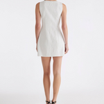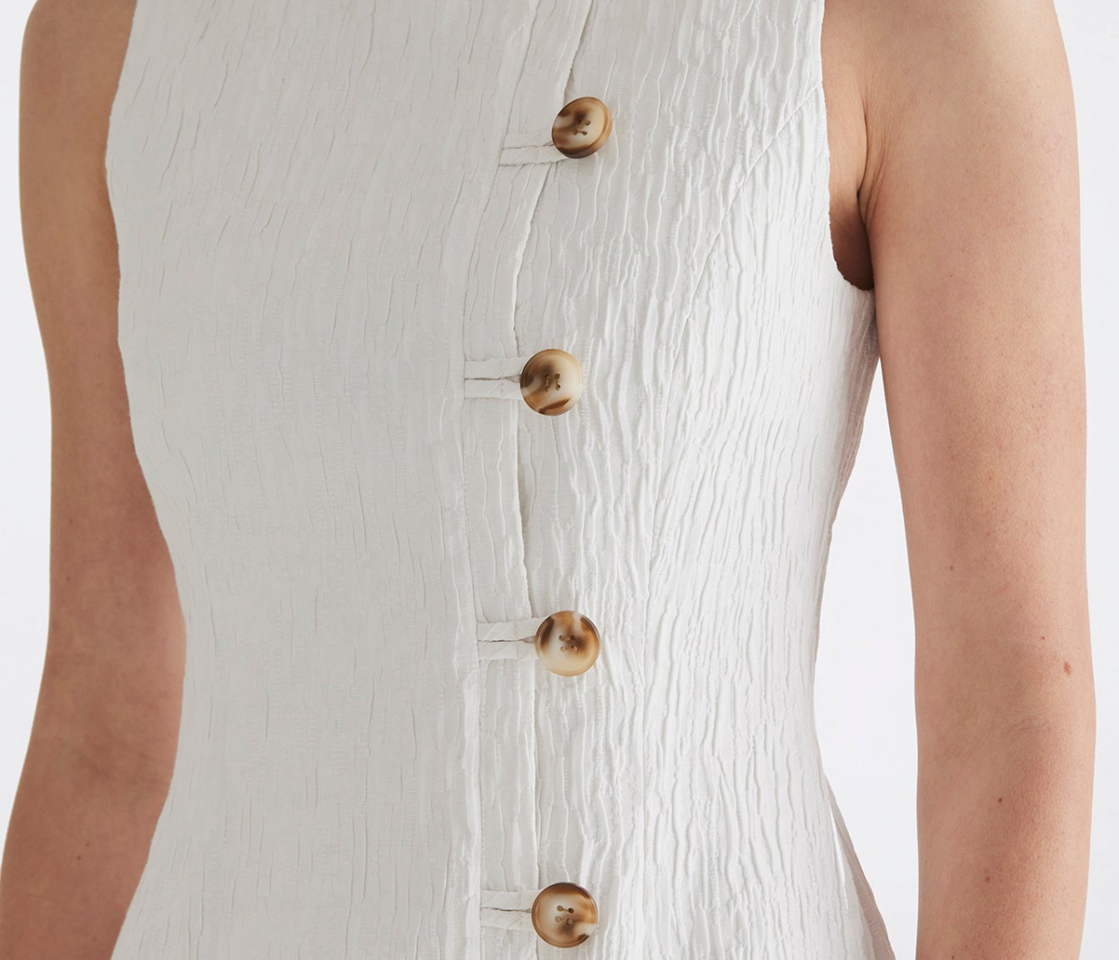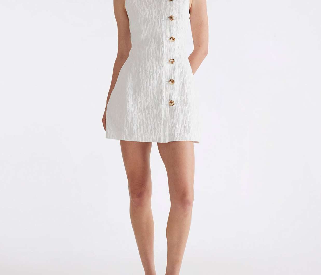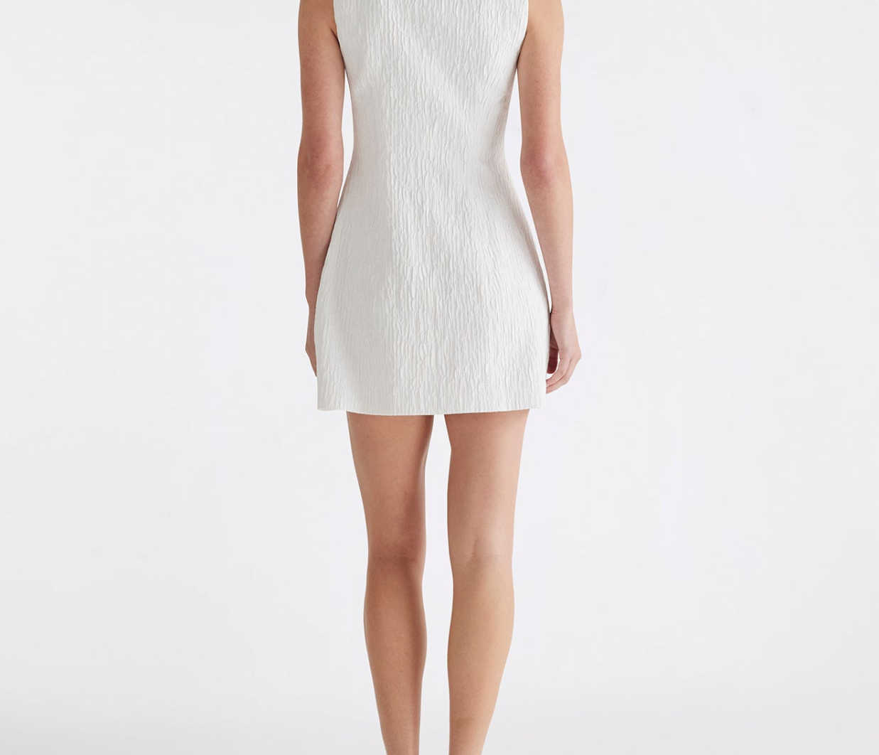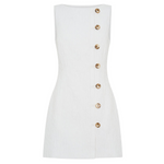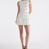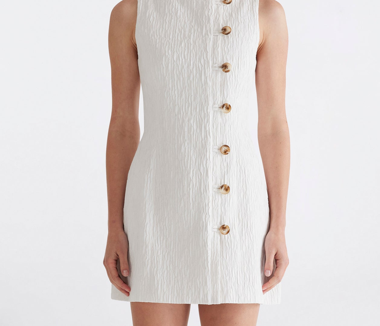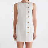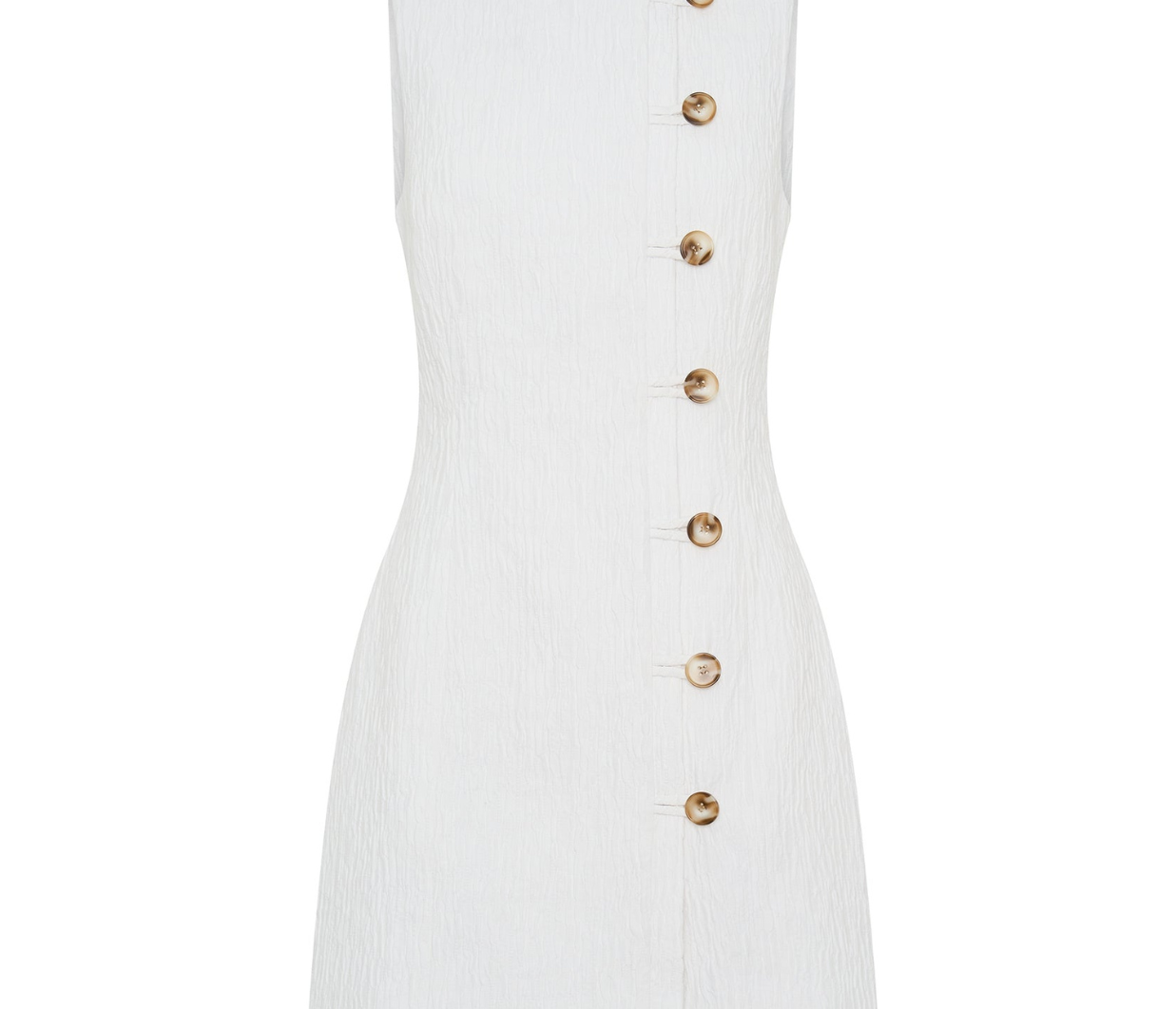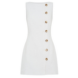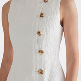 Introducing the Olympia Dress in White Crinkle a cut in a seasonless textured cotton blend made for endless wardrobe rotation. A sleeveless tailored mini dress completed with a high round neckline, and waist defining lines. Detailed with a side, faux horn button closure and complete lining. Style with flats for daytime lunches or heels for evening events.