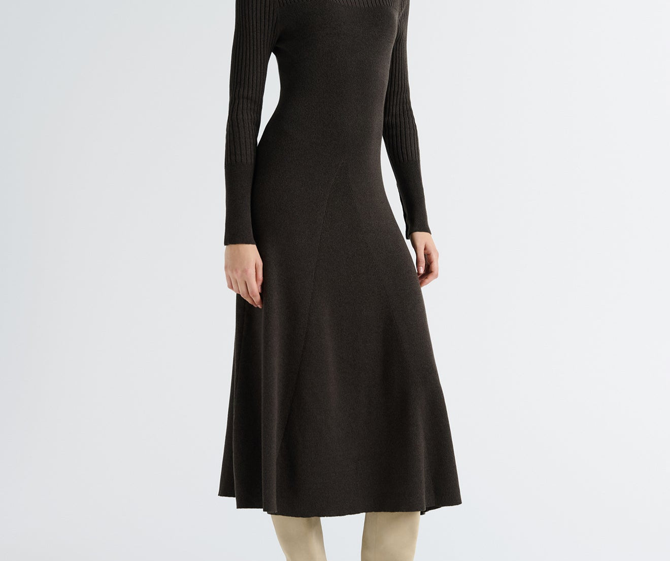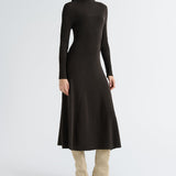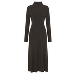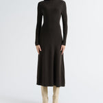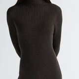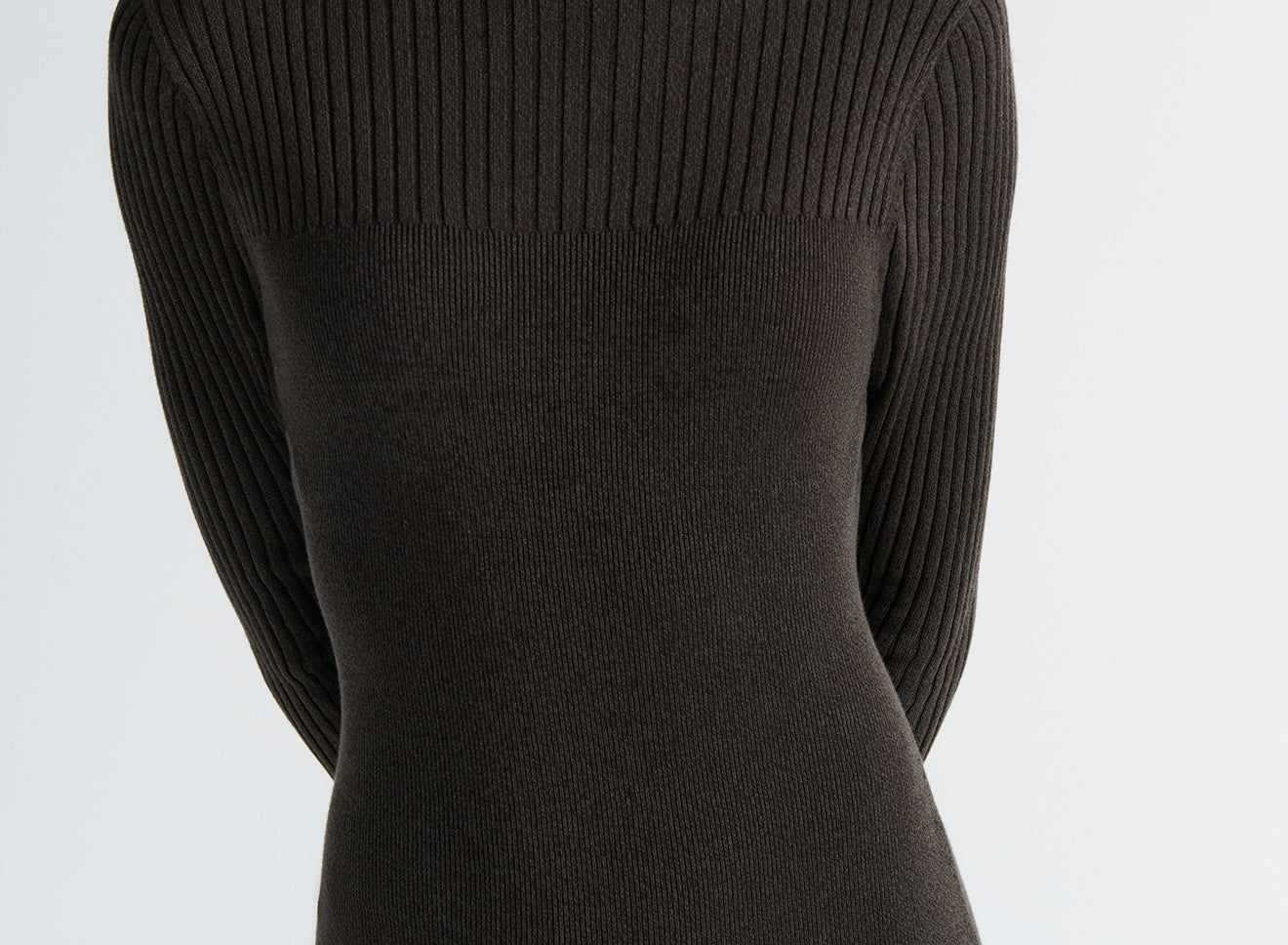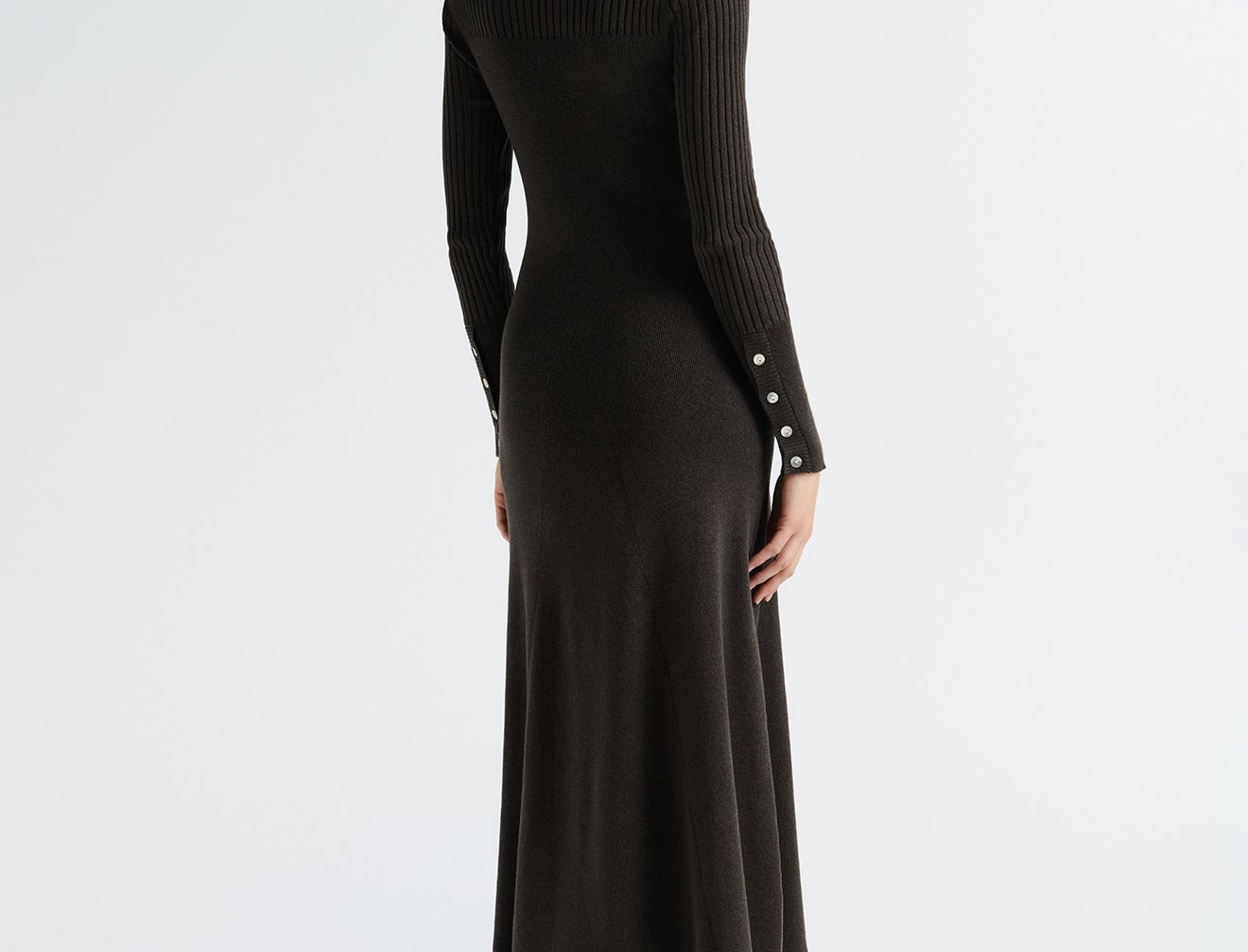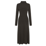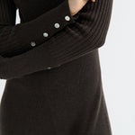 Introducing the Rue Dress in Carob designed with a sleek funnel neckline, featuring contrast ribbed detailing above the chest and along the sleeves and an A-line skirt to create a soft flare. Thoughtfully finished with a functional Mother of Pearl button placket along the sleeves.
