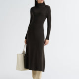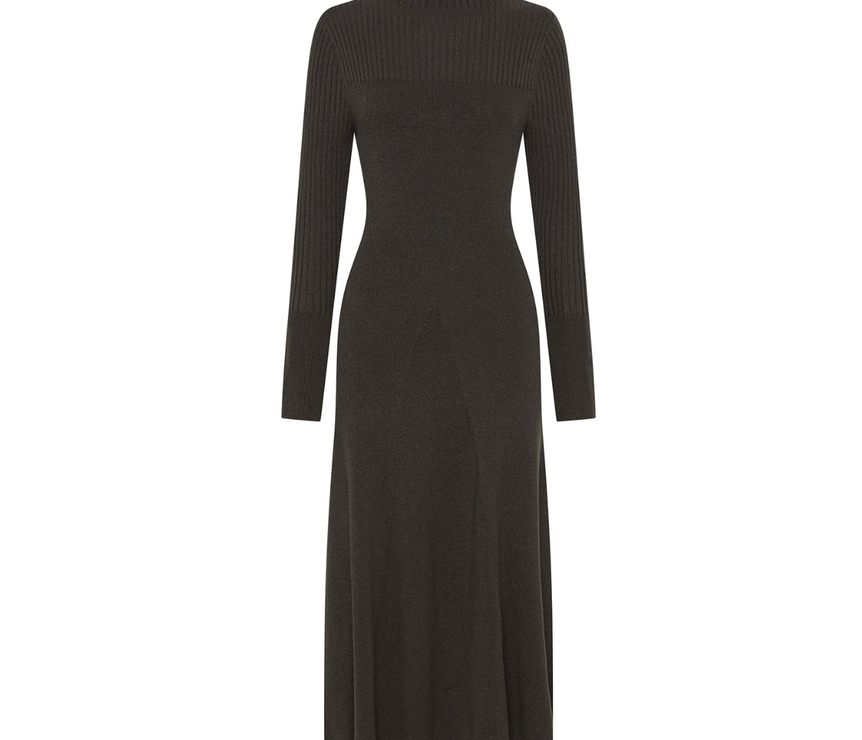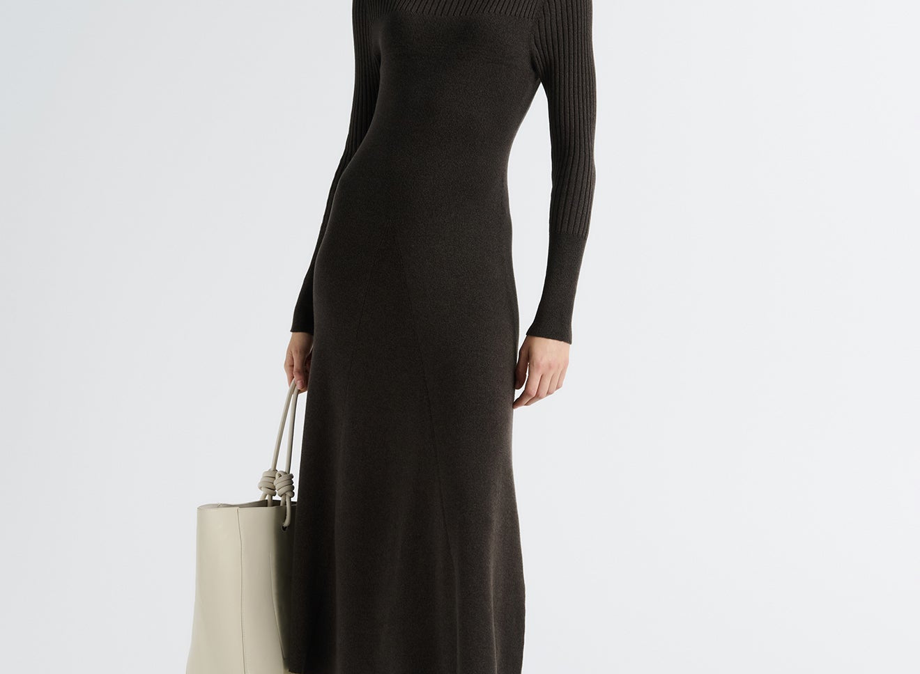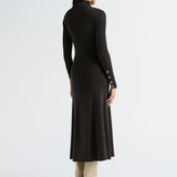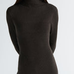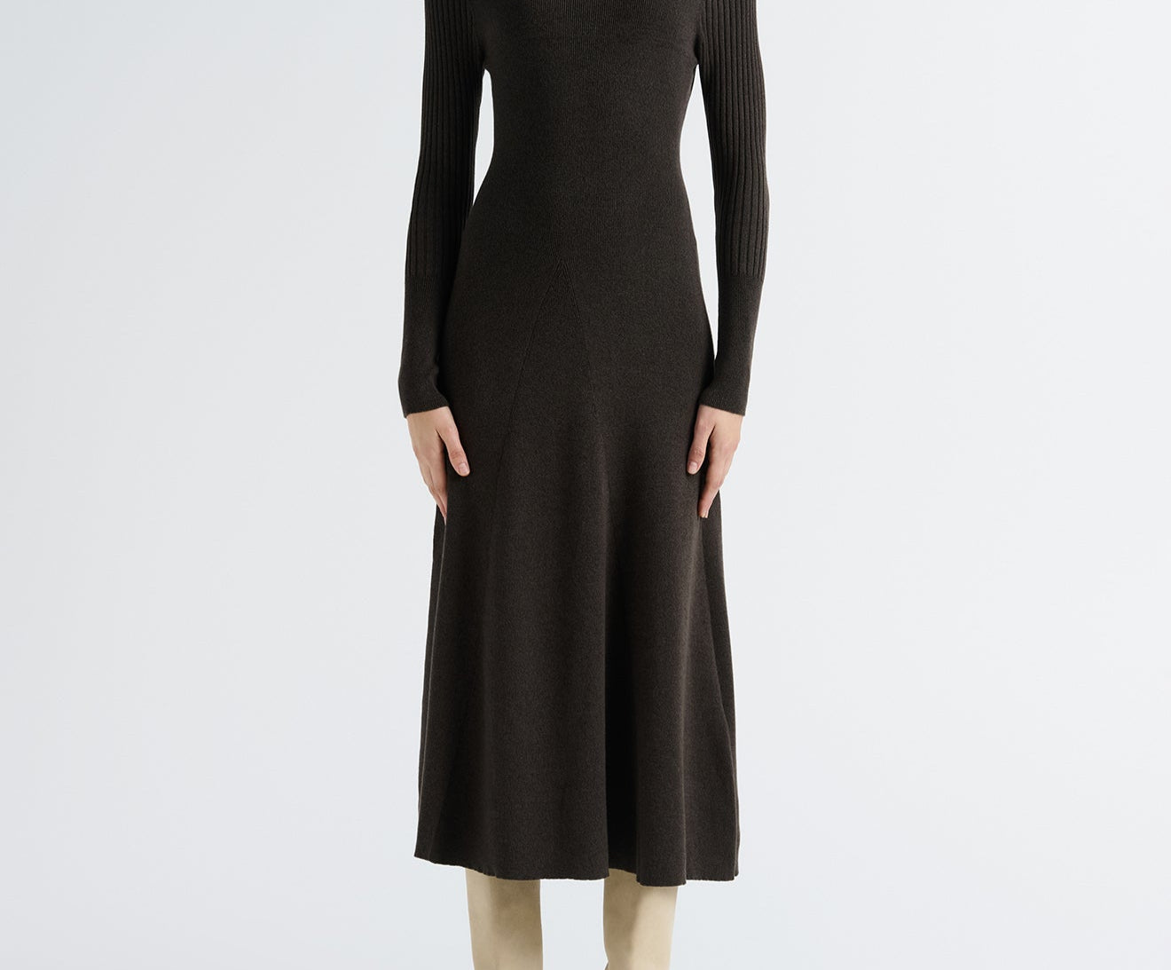 Introducing the Rue Dress in Carob designed with a sleek funnel neckline, featuring contrast ribbed detailing above the chest and along the sleeves and an A-line skirt to create a soft flare. Thoughtfully finished with a functional Mother of Pearl button placket along the sleeves.