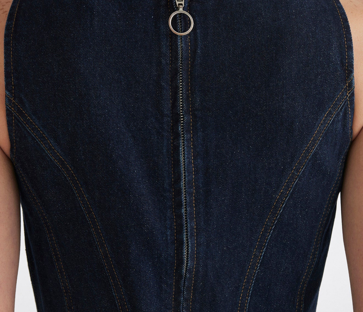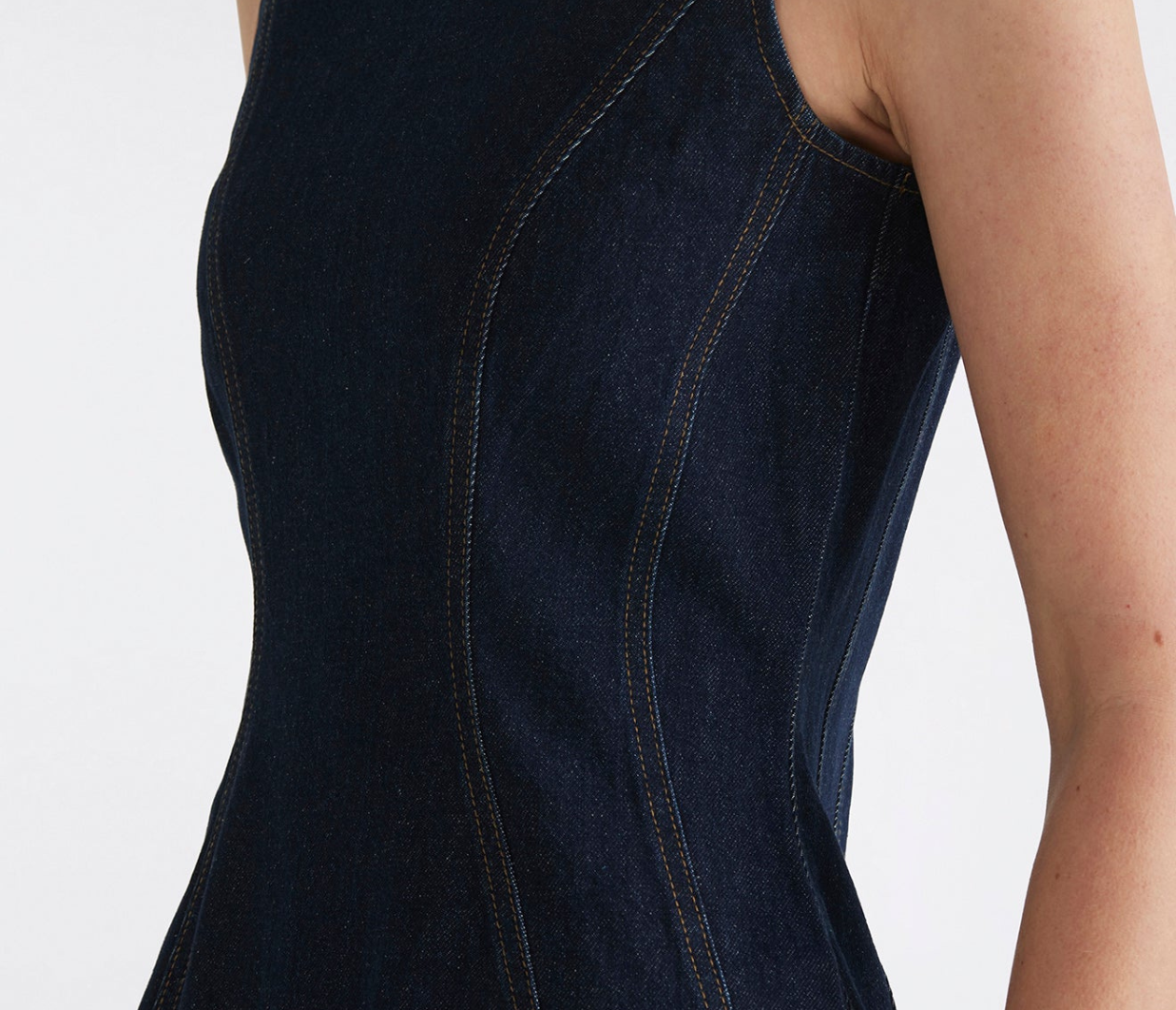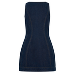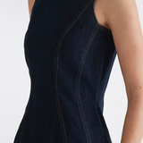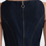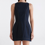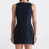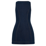 Introducing the Shannon Dress in Indigo takes Anna Quan's signature denim into a new day time style. A minimal boat neckline with waist defining panelling compliments the hourglass silhouette of the dress. Finished with a centre back zip and brown stitch detailing.