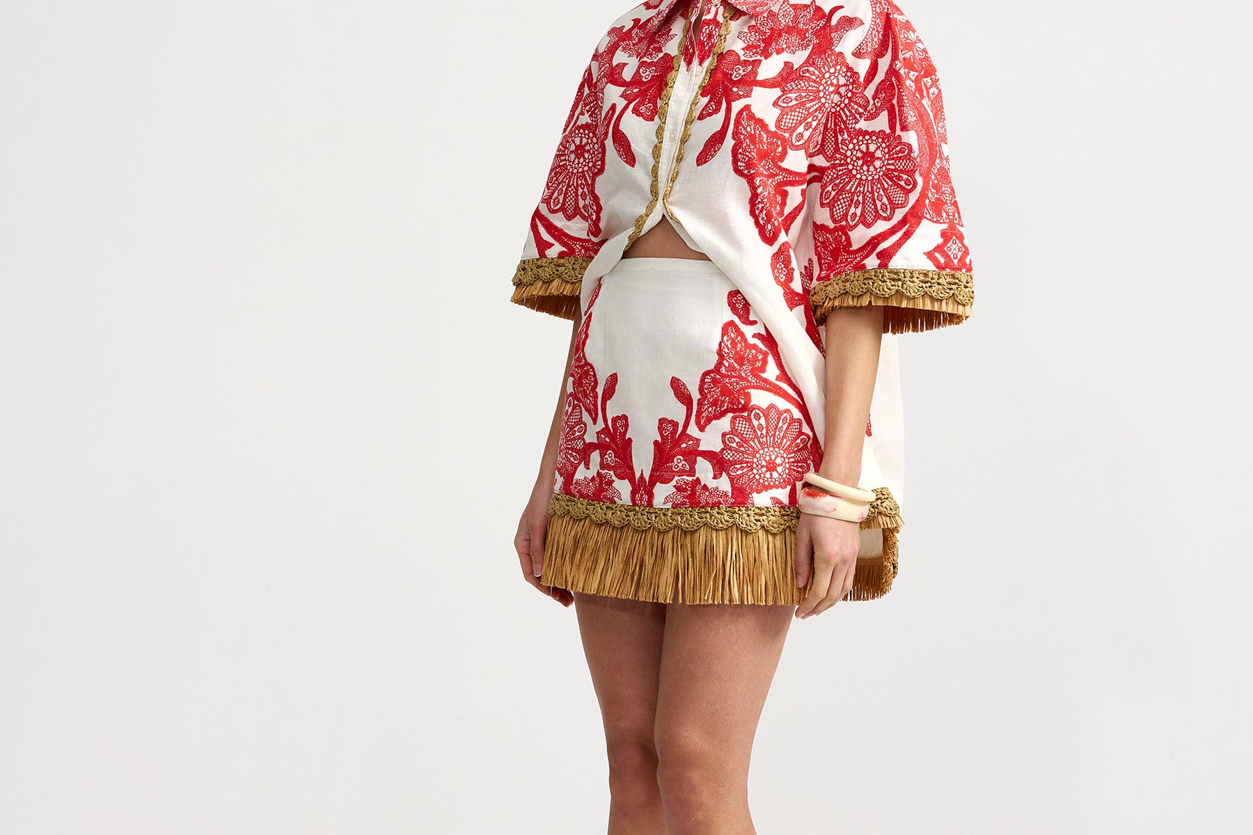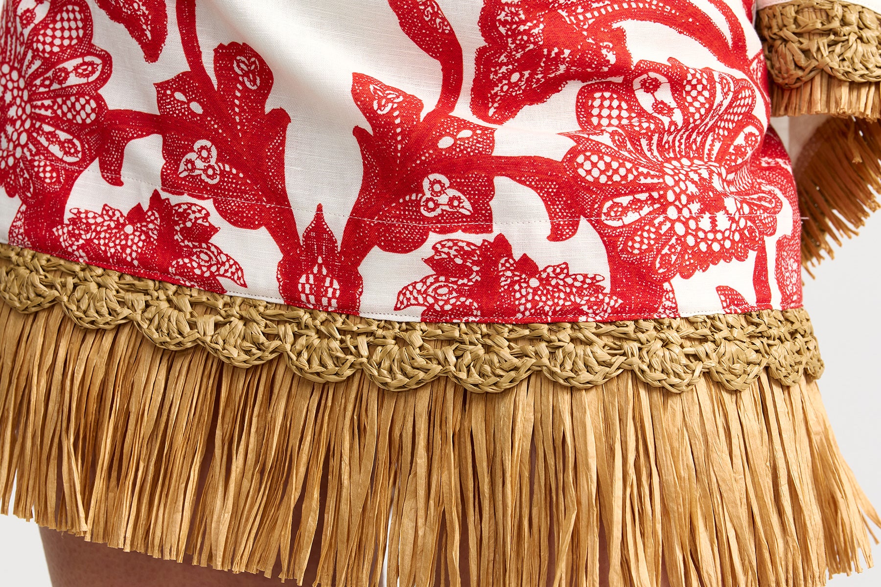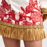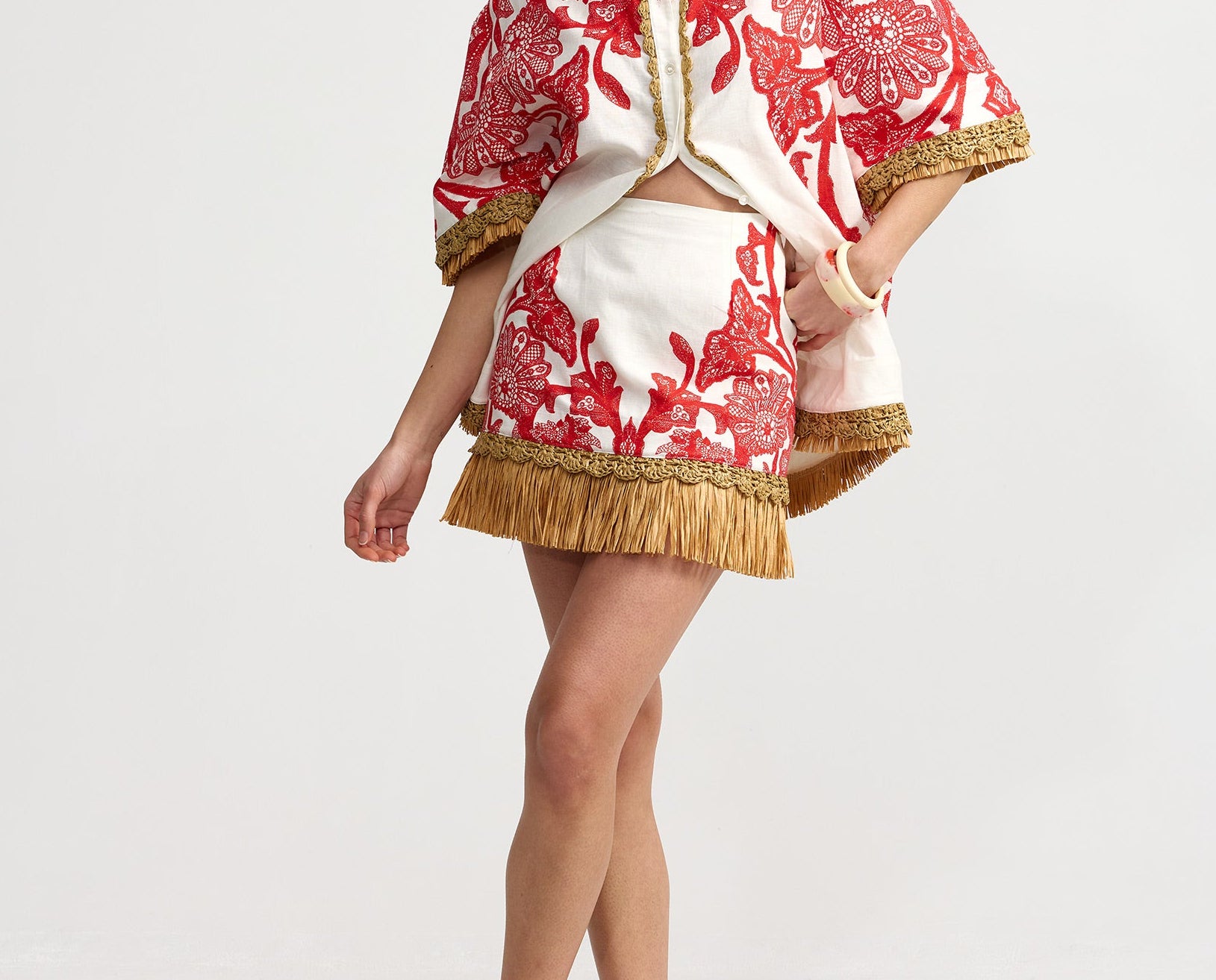 Introducing Aston Studio's Amity Skirt in Ruby Rose, a mini-length skirt silhouette in a floral print of ruby rose. Designed in an A-line silhouette with a ruby lace placement print and raffia-trimmed hem. Pair it with the Vivian Blouse or a plain tank top for a coordinated look.