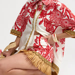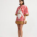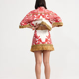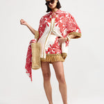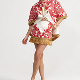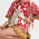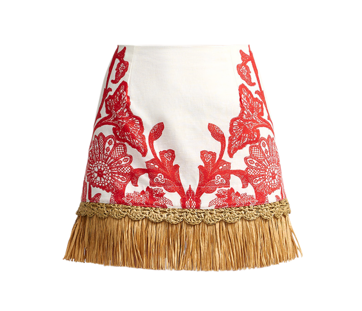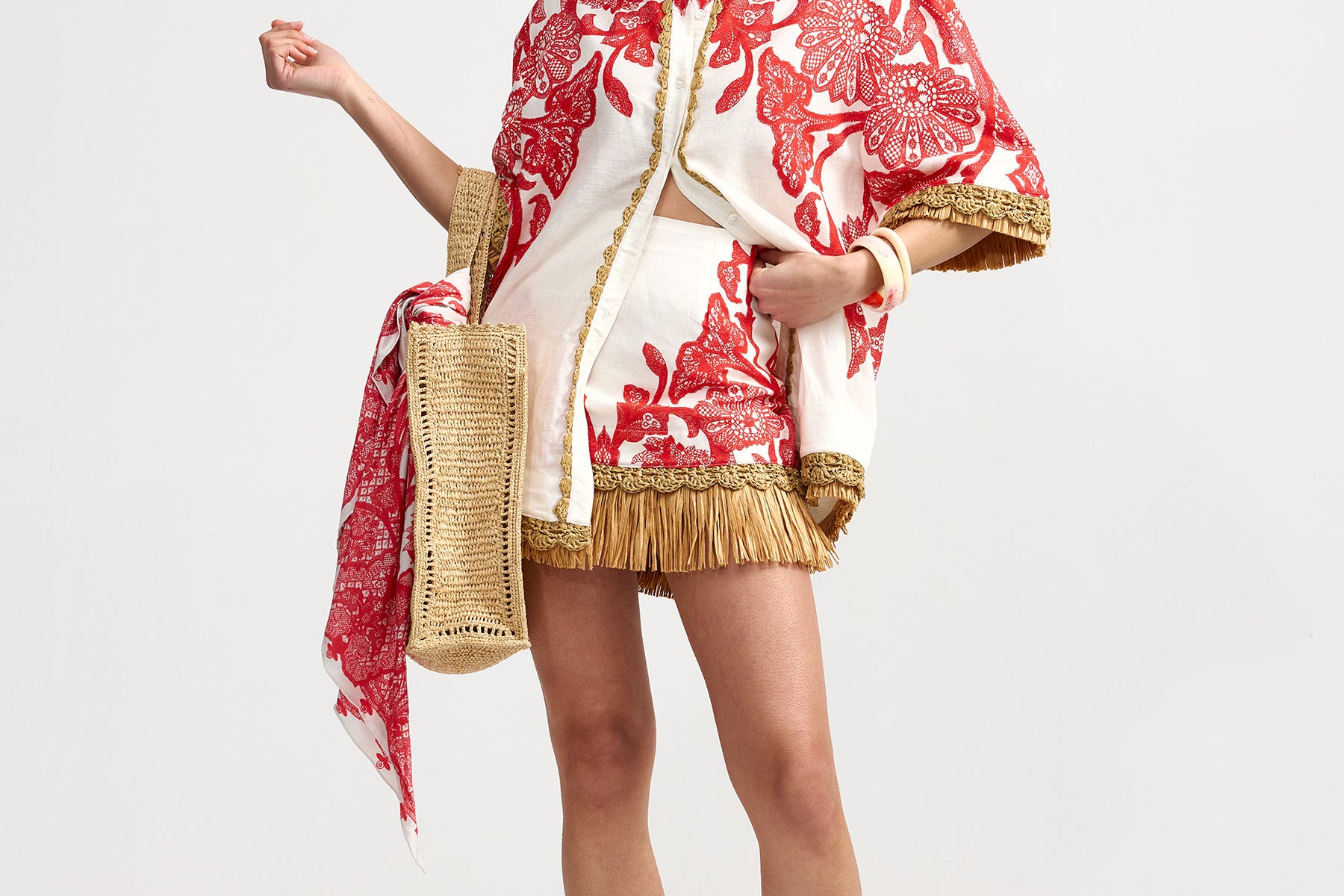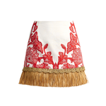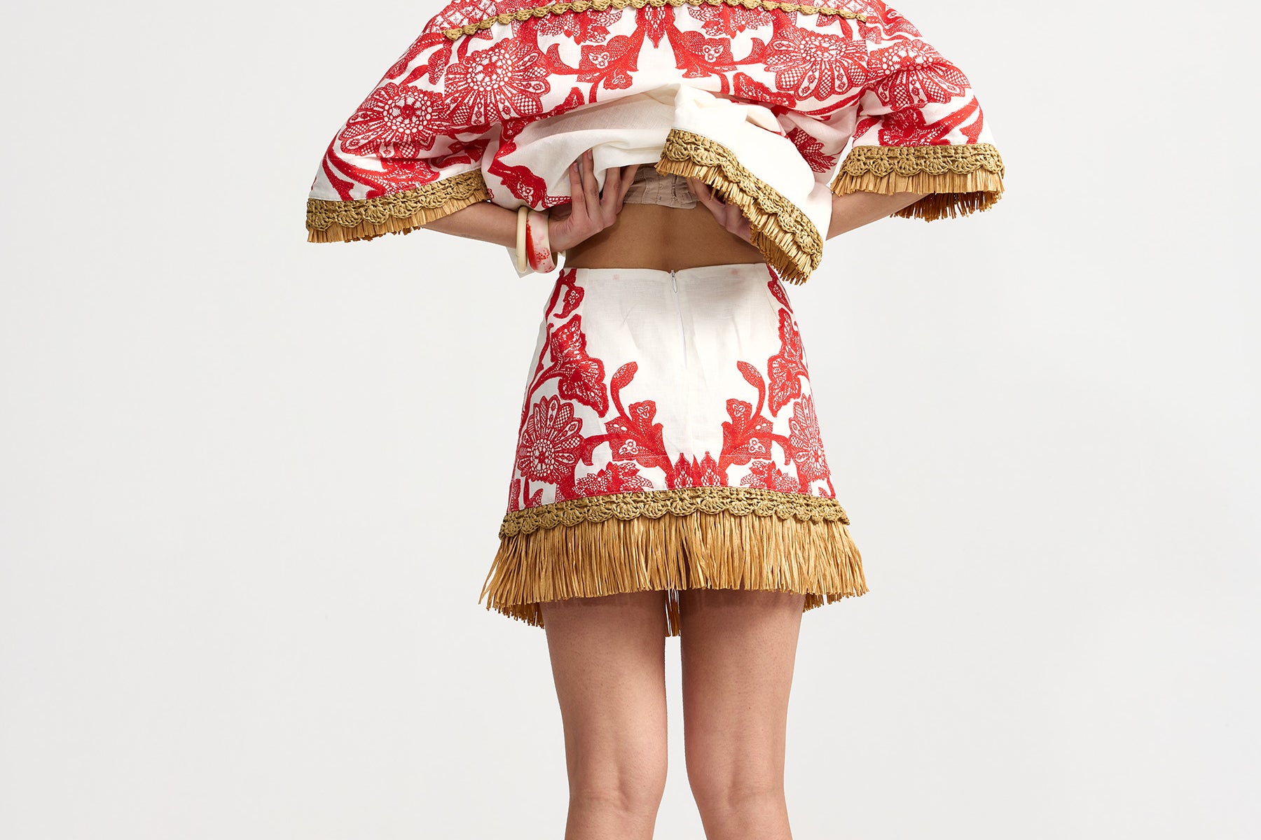 Introducing Aston Studio's Amity Skirt in Ruby Rose, a mini-length skirt silhouette in a floral print of ruby rose. Designed in an A-line silhouette with a ruby lace placement print and raffia-trimmed hem. Pair it with the Vivian Blouse or a plain tank top for a coordinated look.