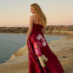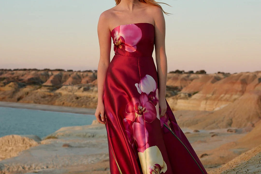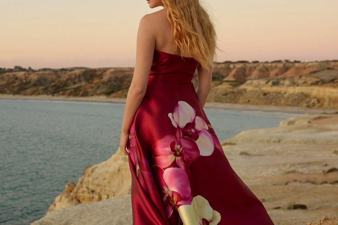 Introducing Aston Studio's Audrey Gown Redcurrant Phalae, a strapless gown dress silhouette in redcurrant with a floral phalae print. The phalae print on a sleek satin base creates a striking contrast. Designed with a structured bodice and a sweeping full-length skirt, the Audrey Gown Dress is a standout choice for special occasions.
