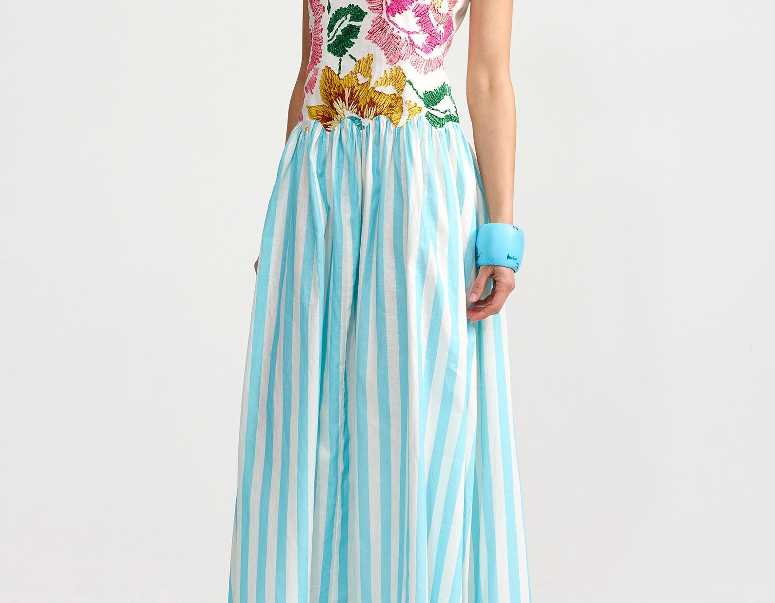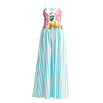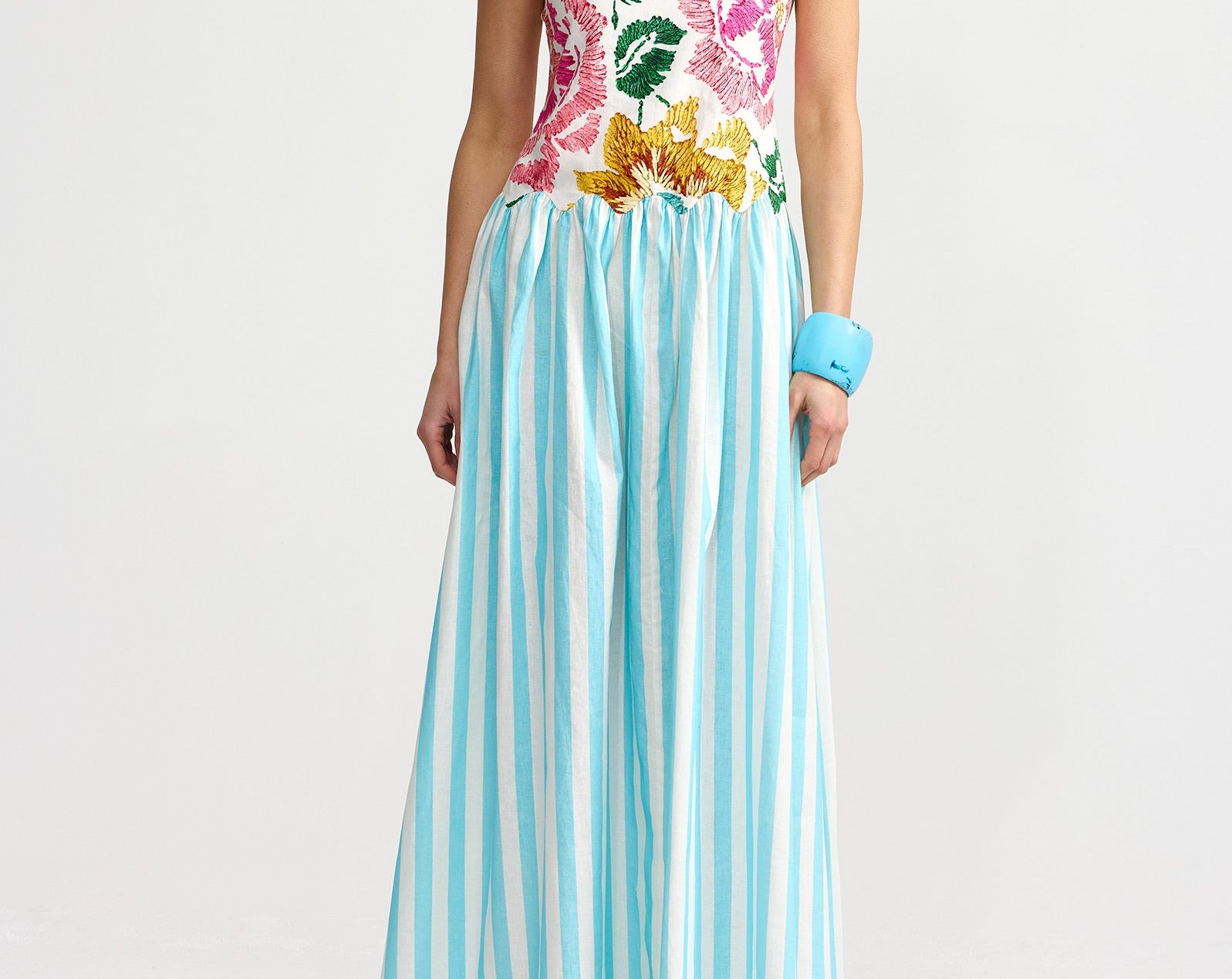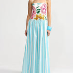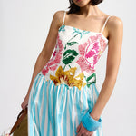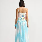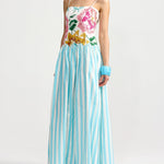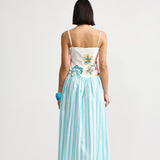 Introducing Aston Studio's Cordelia Dress in Caribbean Bouquet Stripe, a maxi dress silhouette. Designed with a floral bodice top in a square neckline with spaghetti straps and draped in an A-line silhouette with a blue and white stripe pattern. Perfect for warm days and special occasions, this dress blends artistry and wearability in a statement-making design.