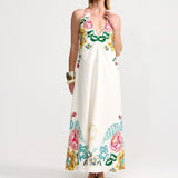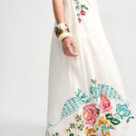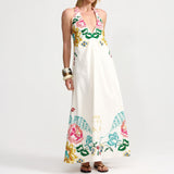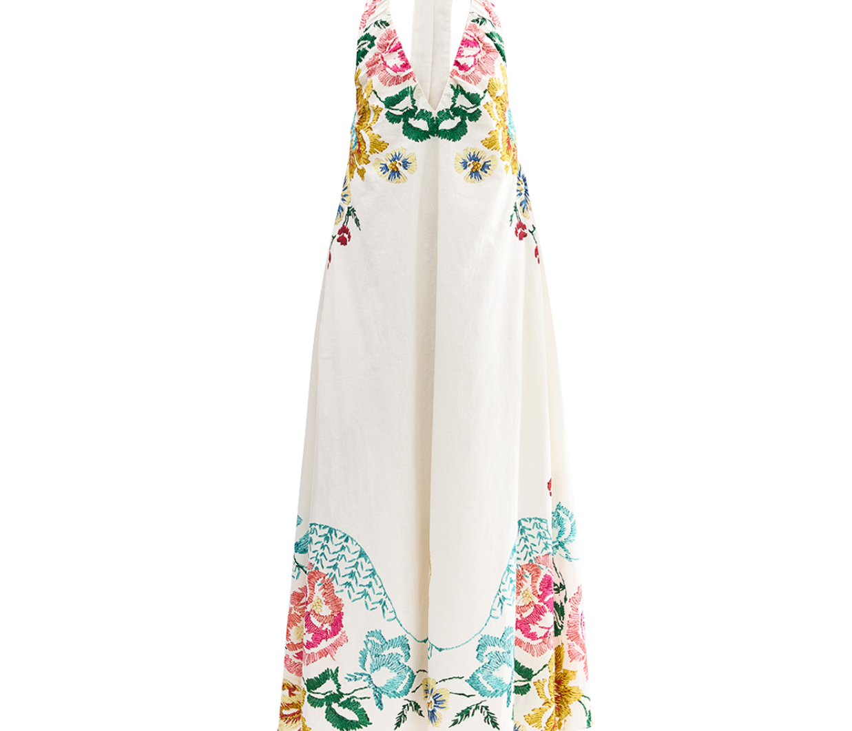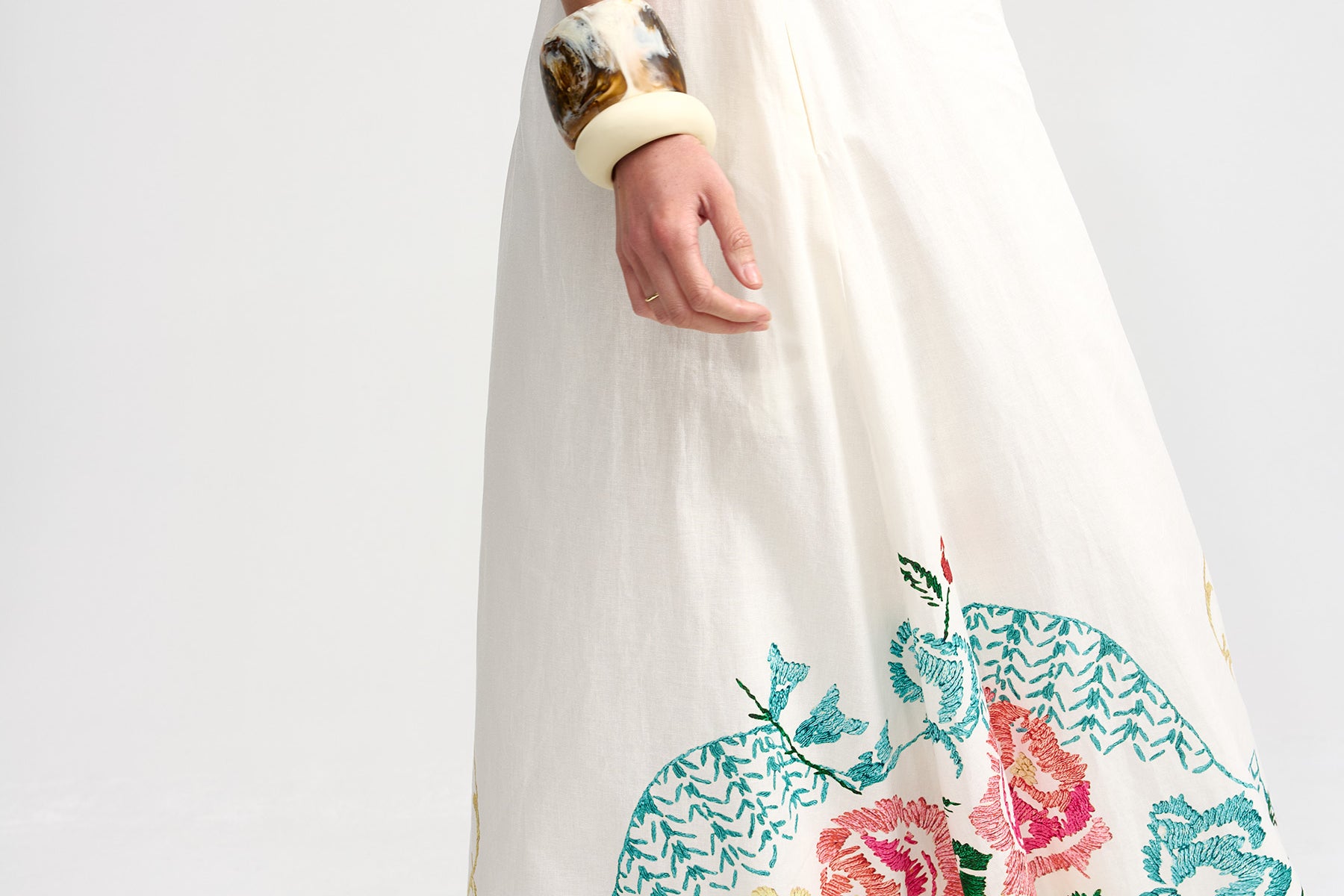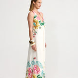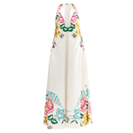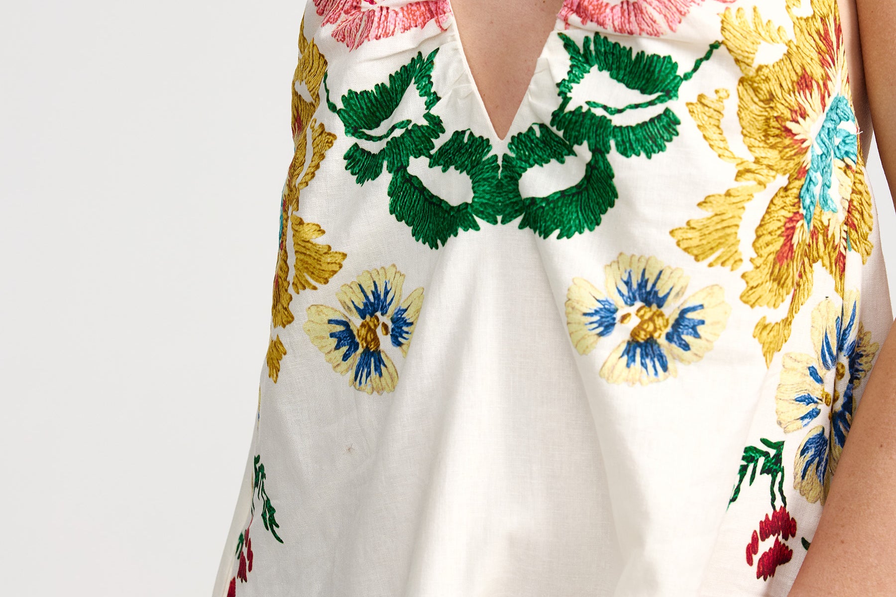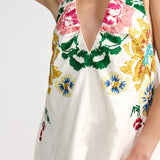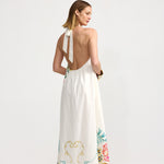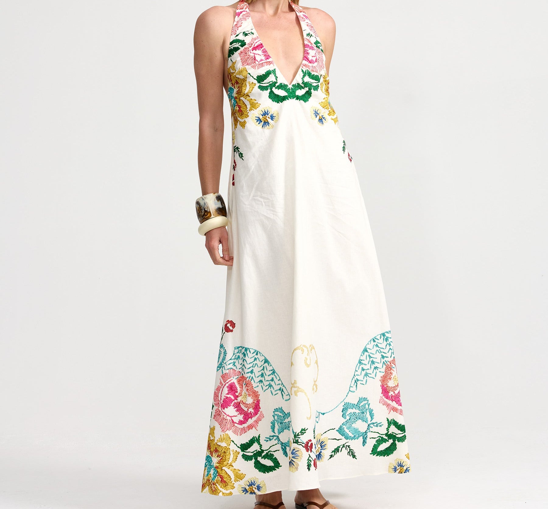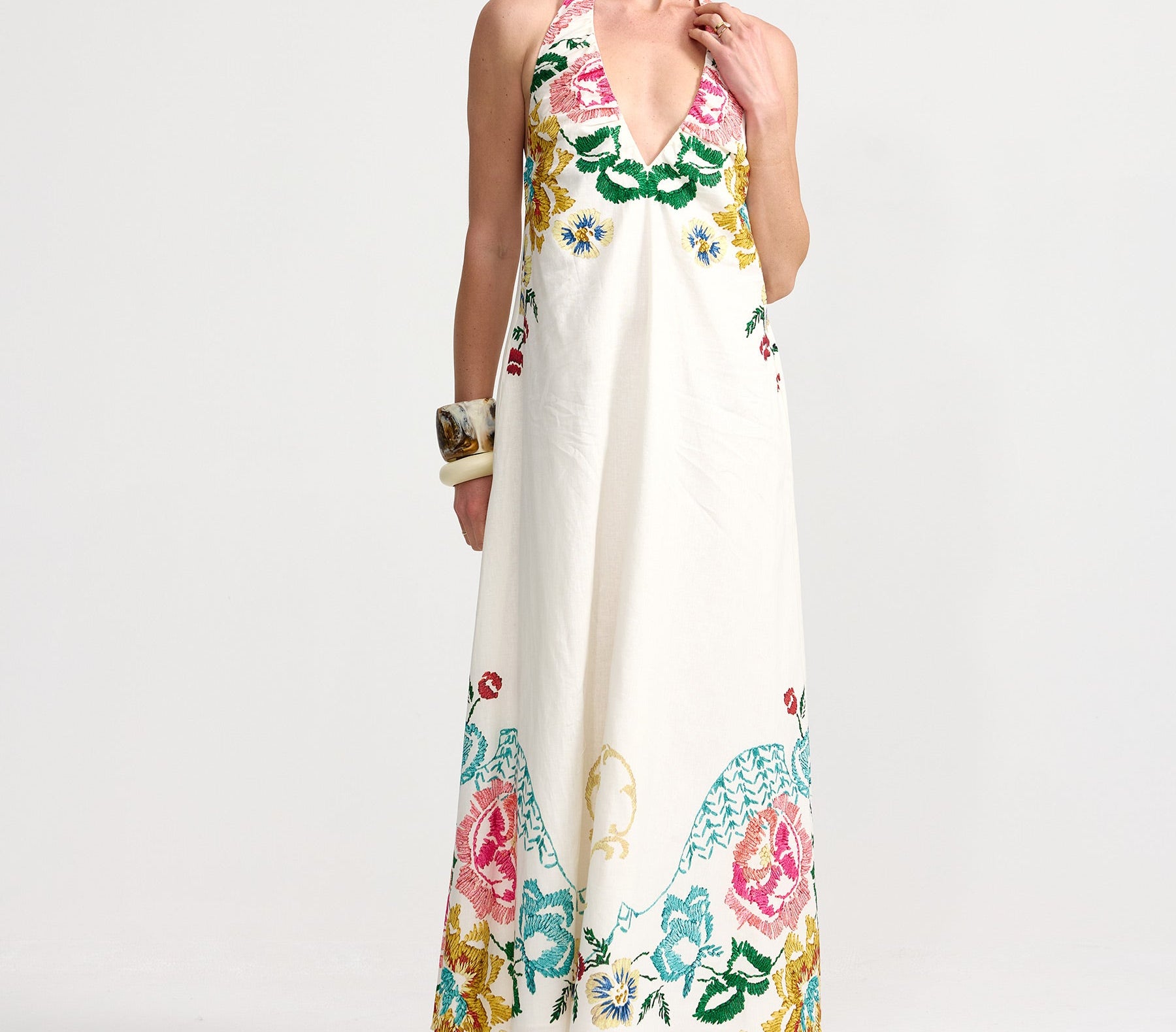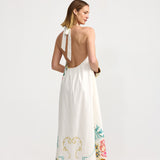 Introducing Aston Studio's Faye Dress Antique Bouquet a white linen-blend midi dress with a halterneck and gathered V-neckline. The A-line silhouette flows gracefully from a scooped back, while custom floral embroidery along the neckline and hem adds a refined, artisanal touch. This dress is perfect for sunlit days and warm-weather occasions.