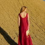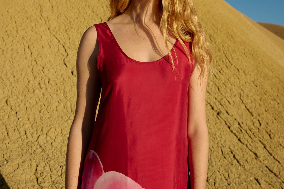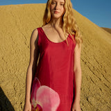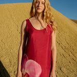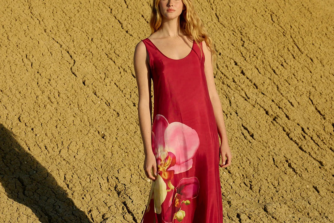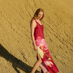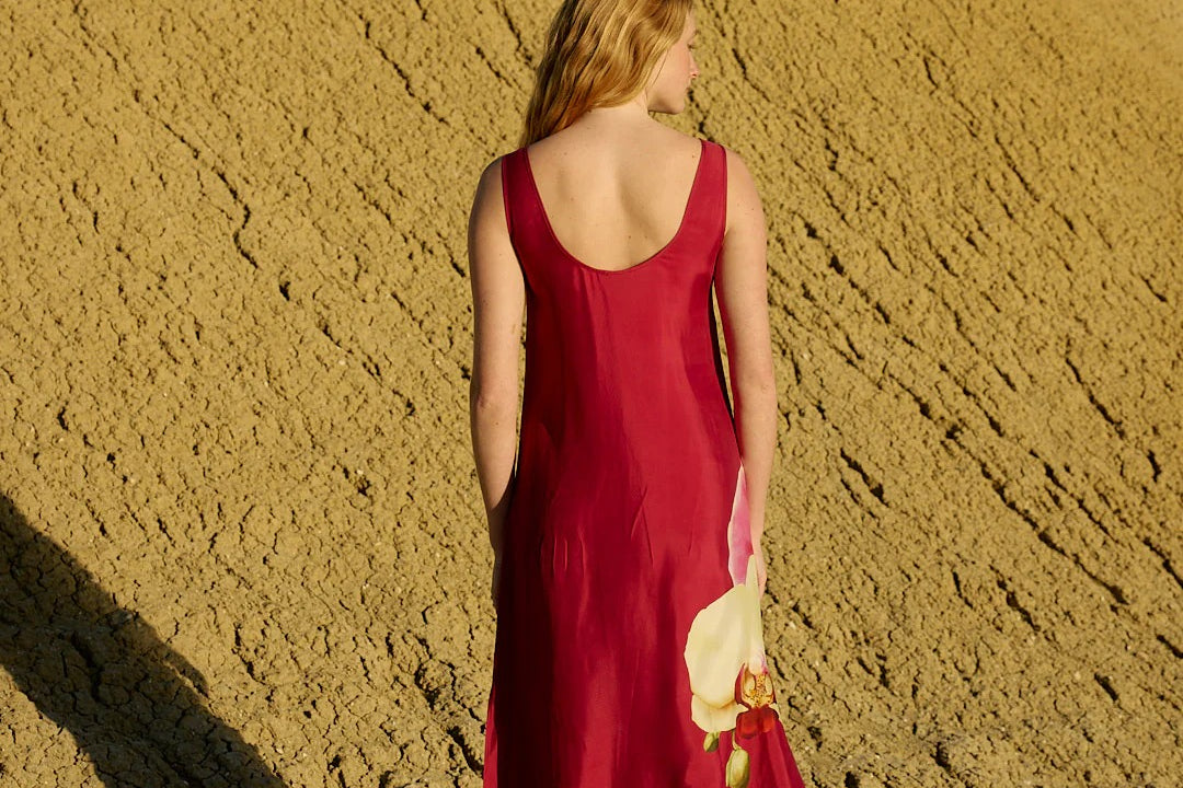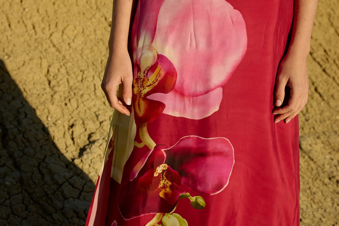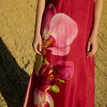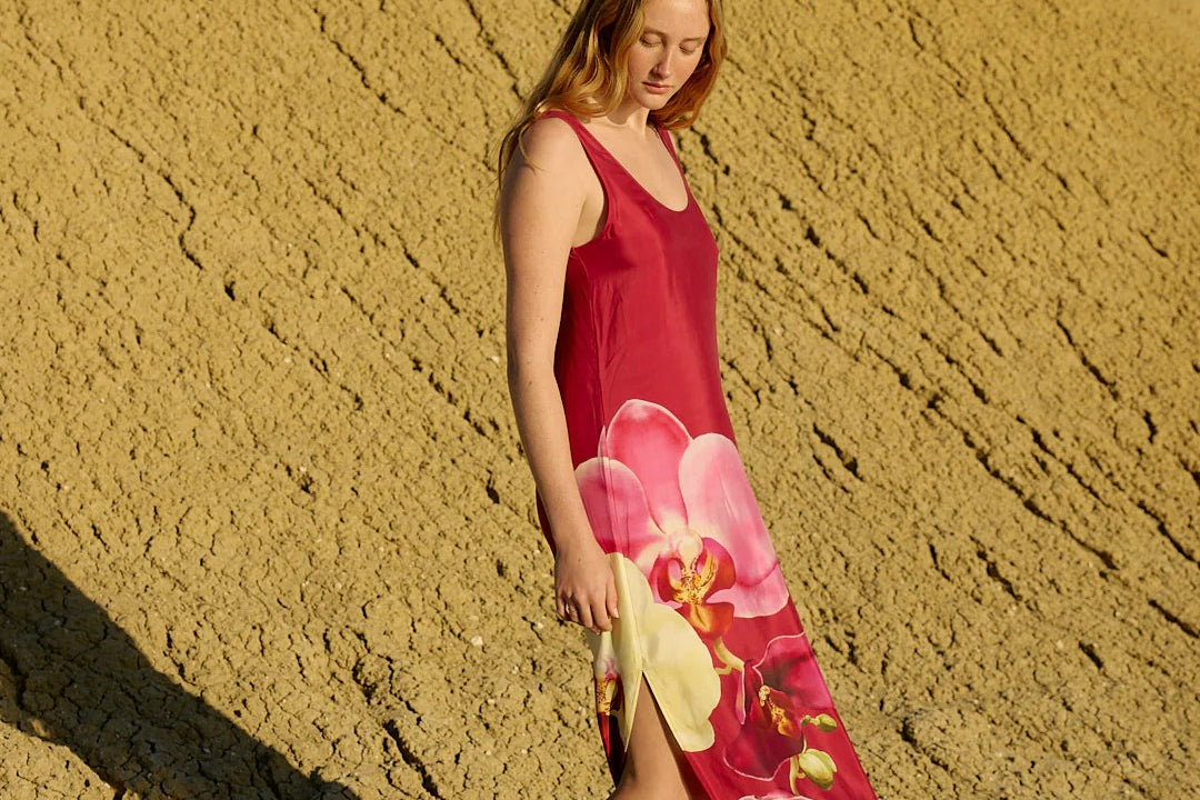 Introducing Aston Studio's Poppy Dress in Redcurrant Phalae, a relaxed slip maxi-length dress silhouette in redcurrant with a floral print detail. Designed with a scoop rounded neckline and draped in an A-line silhouette to the ankle and finished with a side split. Perfect for a sunset soiree