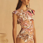 Introducing Aur Ocea's Bel Fiore Ruffle Sleeve One Piece, a one piece swimsuit in Bel Fiore pink floral prints. The Ruffle Sleeve One Piece features a soft ruched torso, front opening zip and chic ruffle sleeves.