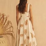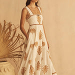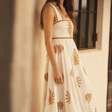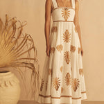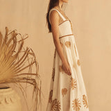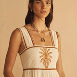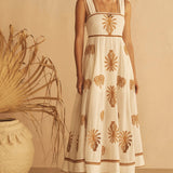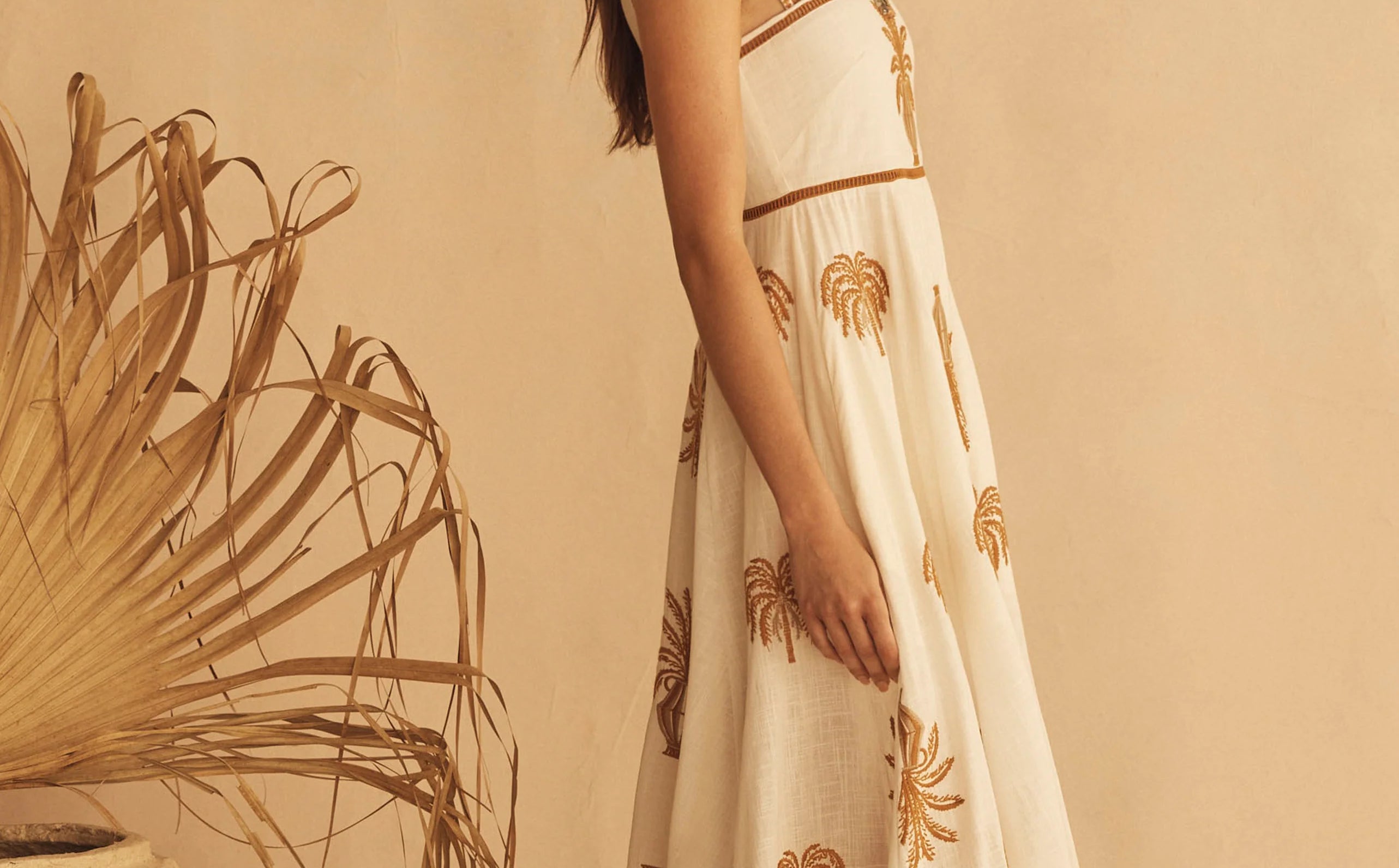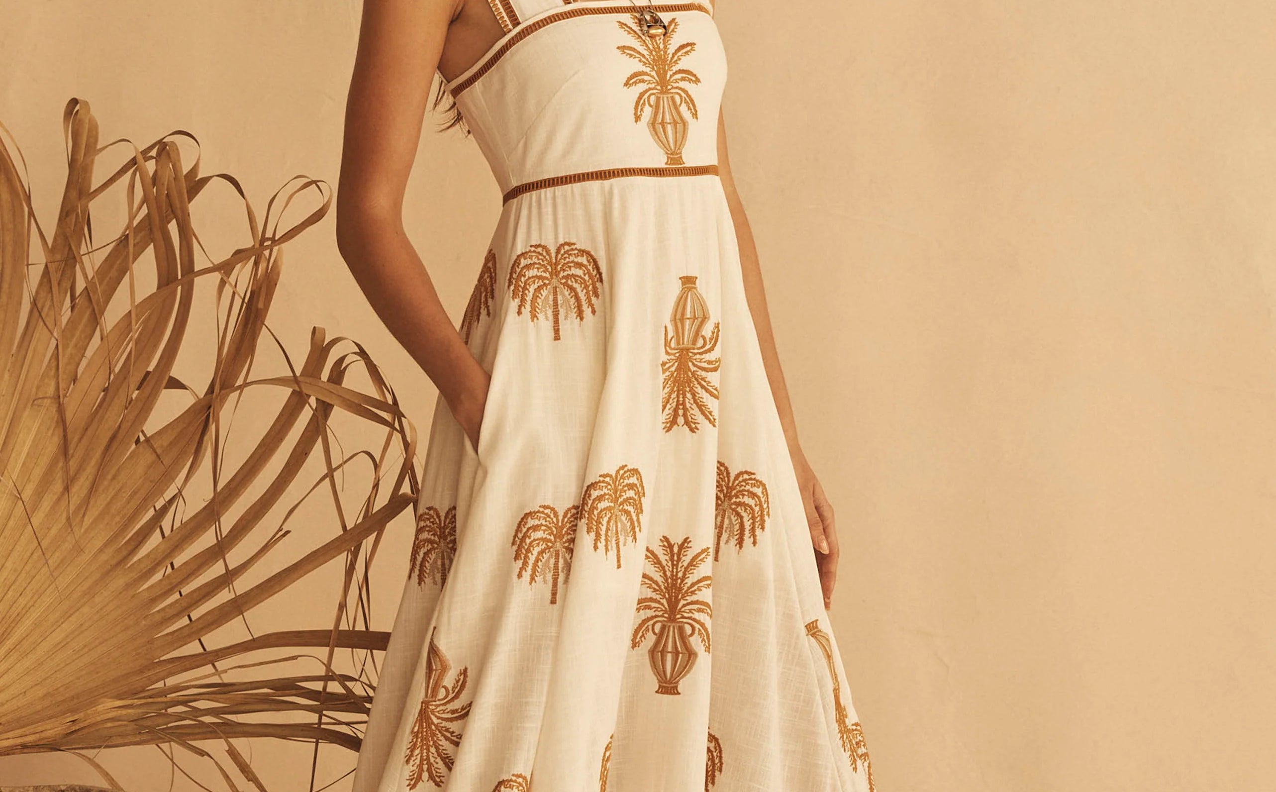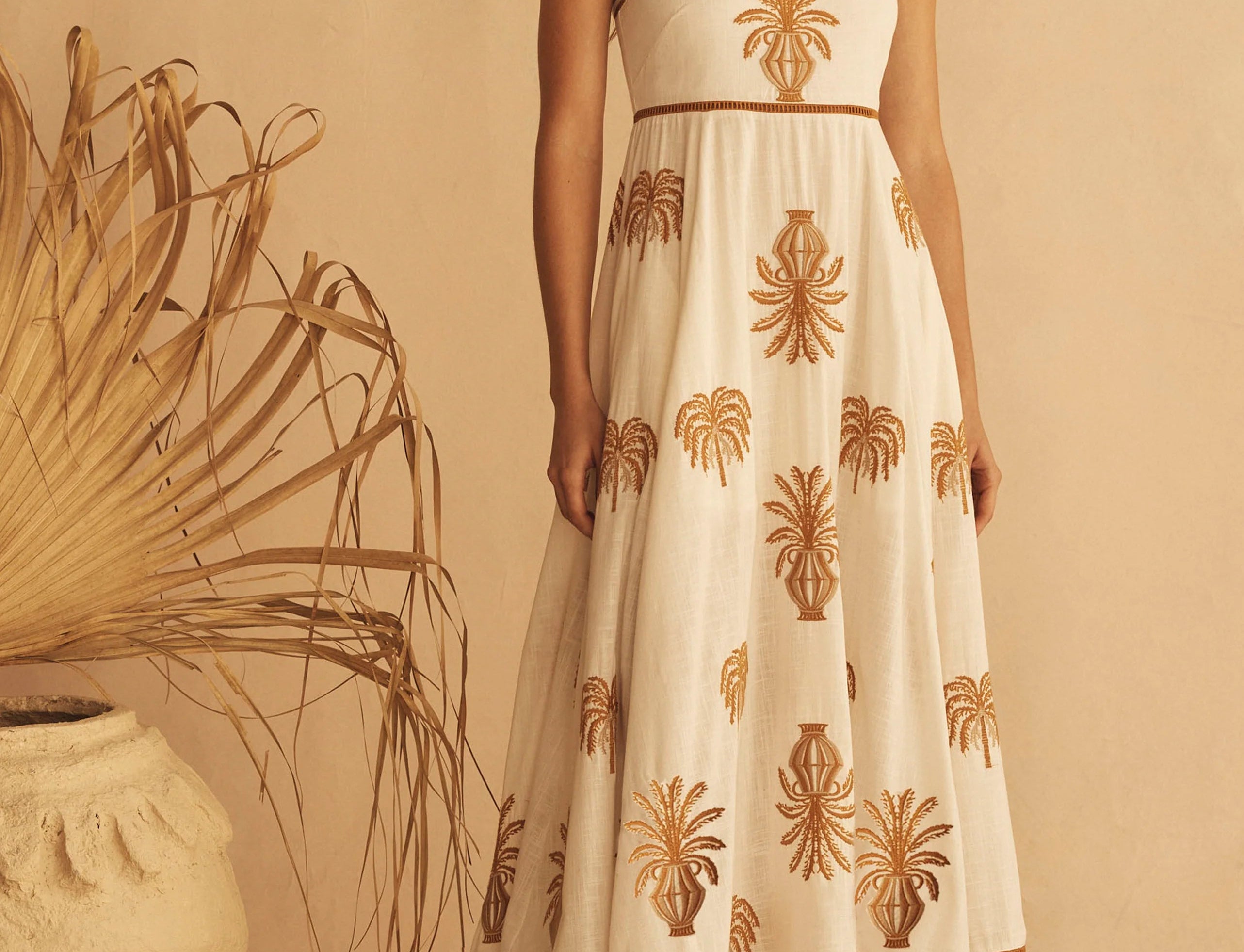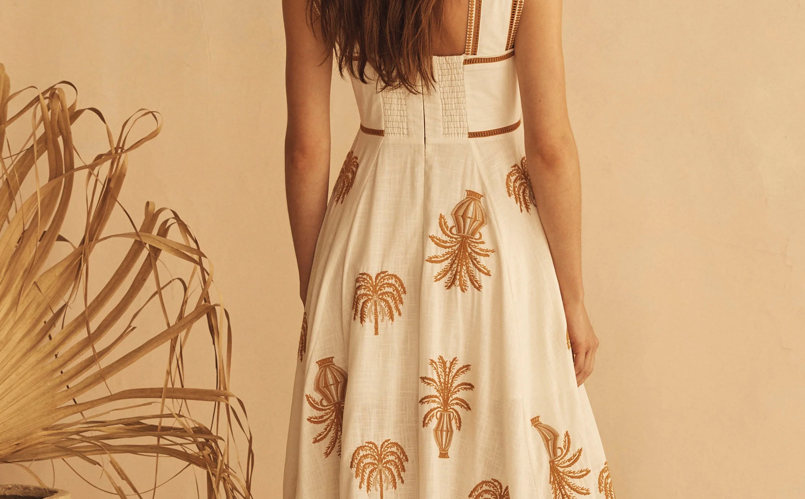 - Embroidered palm tree-inspired motifs, ladder trim accents