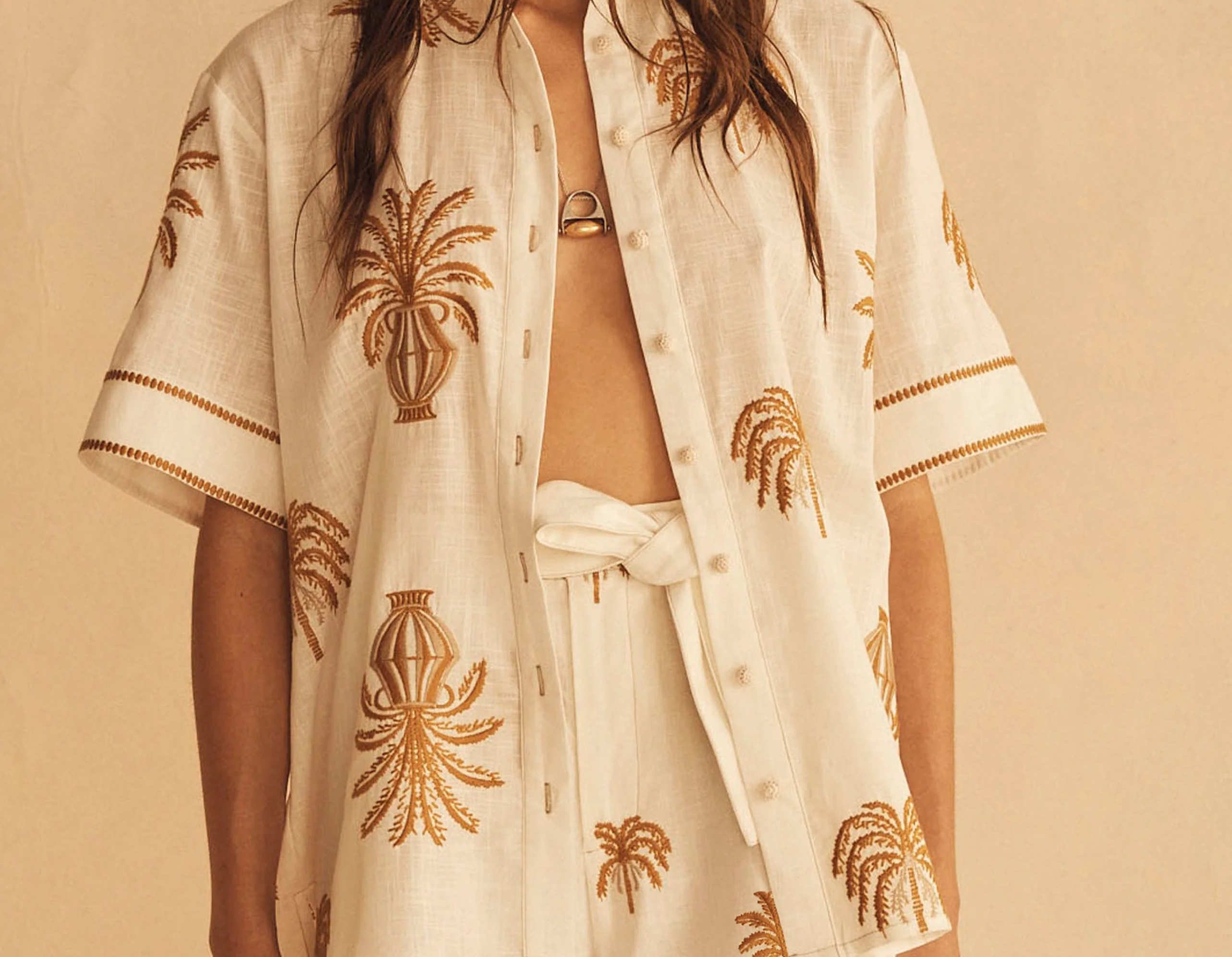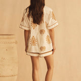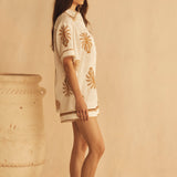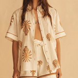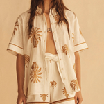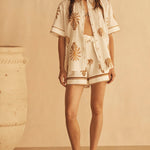 Introducing Aur Ocea's Dalla Palma Embroidered Cuffed Short Sleeve Shirt, a relaxed boxy short-sleeve shirt silhouette with an embroidered palm tree motif of neutral golden warm toffee tones. Designed with a collared V-neckline, crochet button through front, and short sleeves. Wear it unbuttoned over your swimsuit, or style it with coordinating embroidered Resort Shorts for a chic resort look.