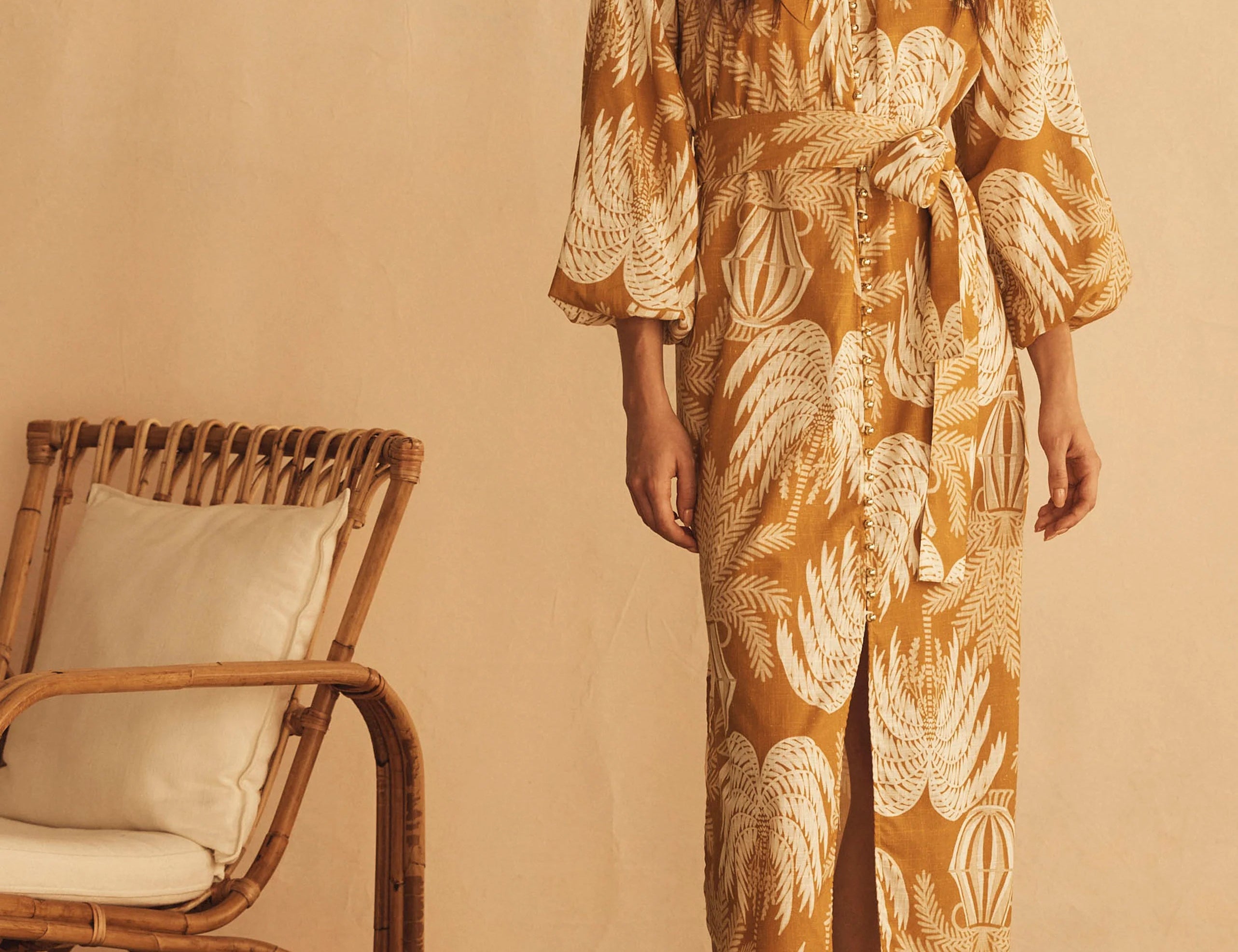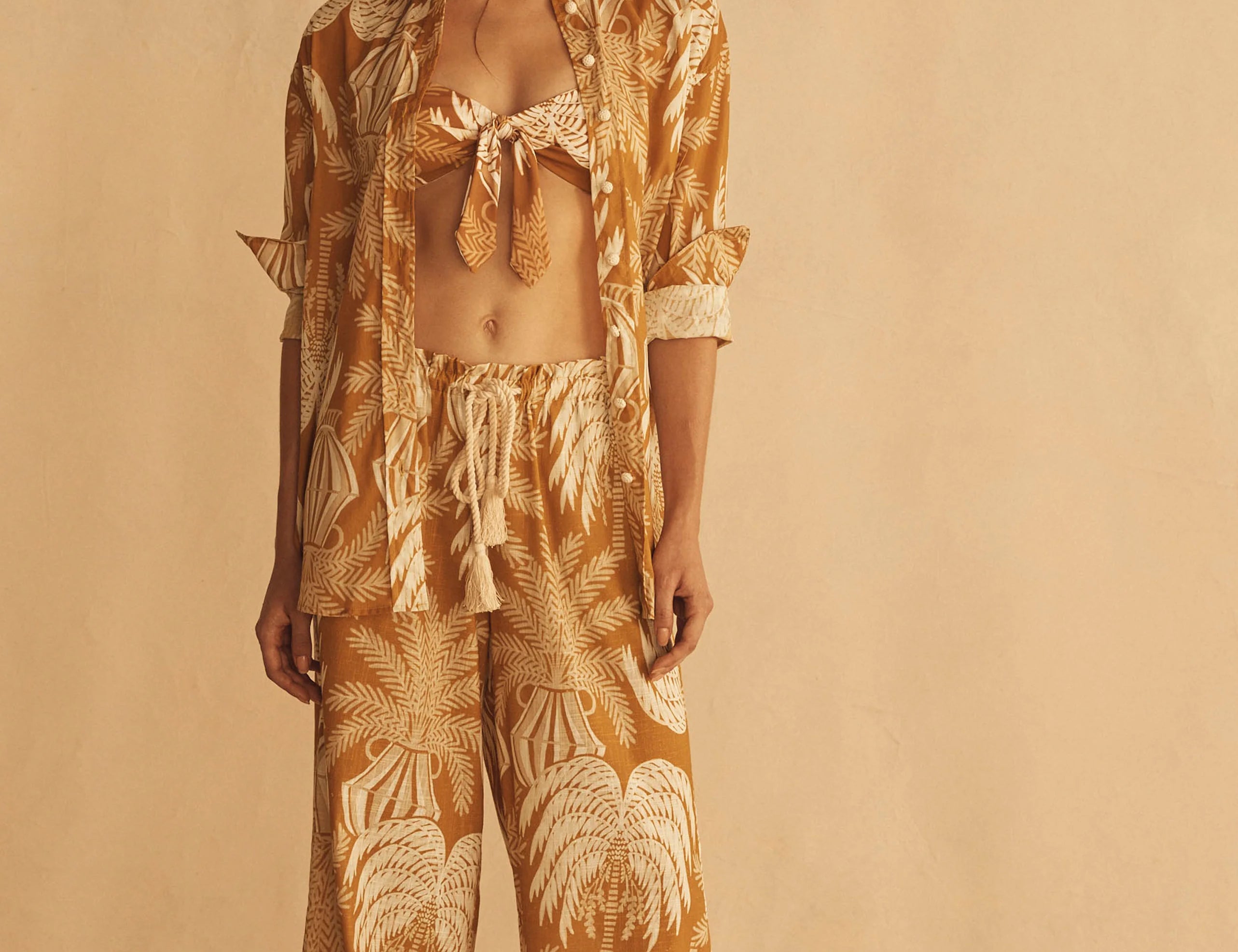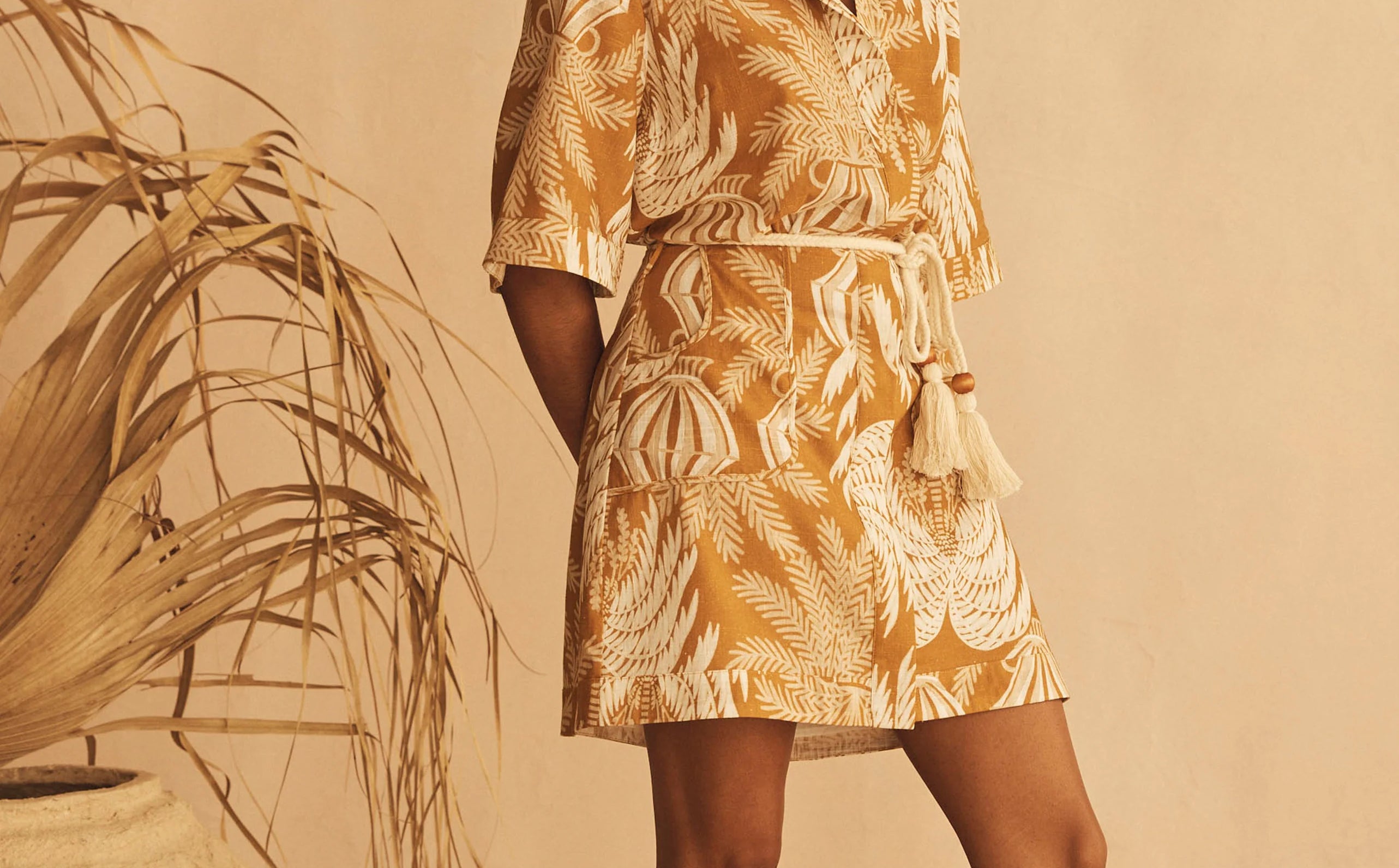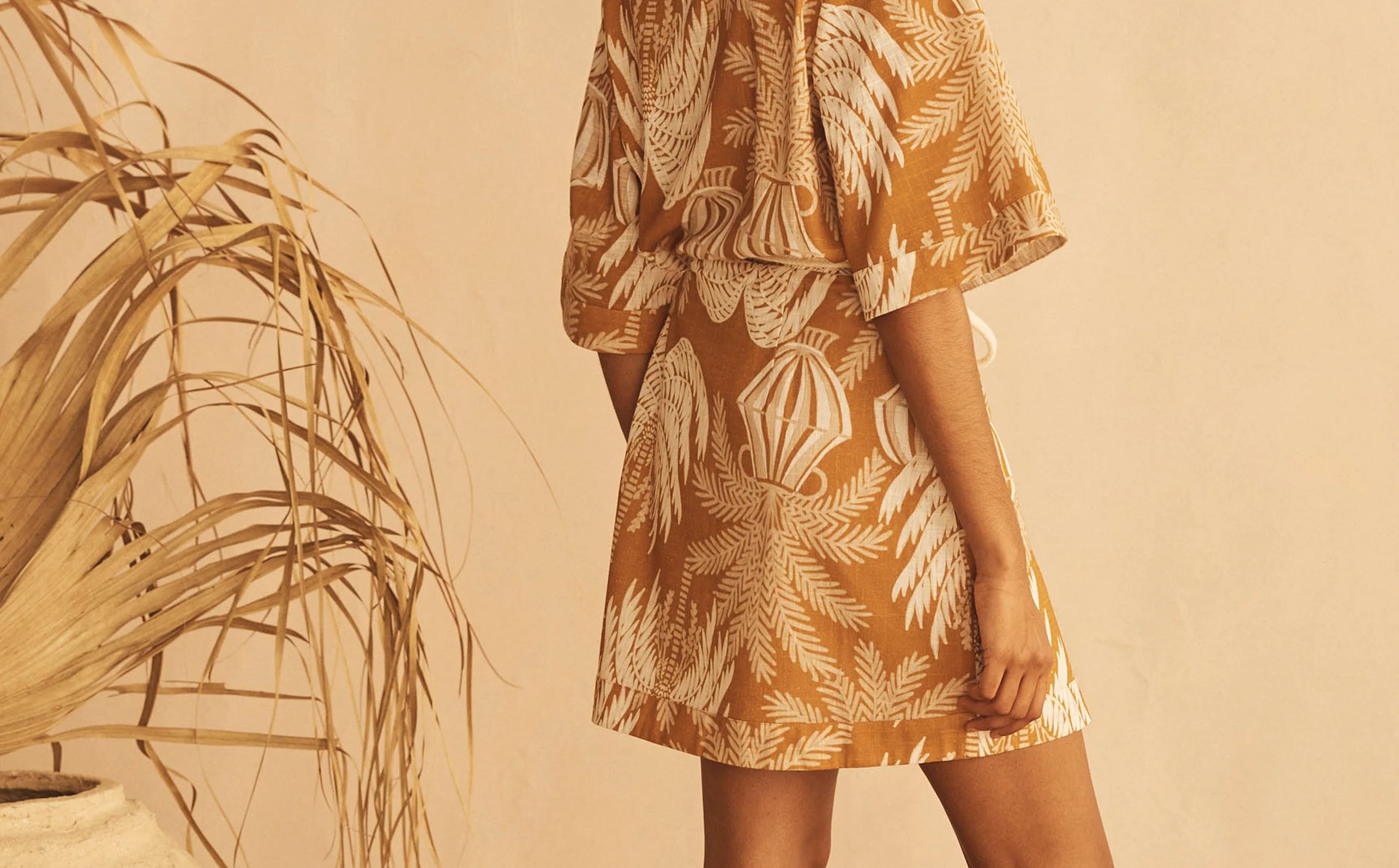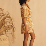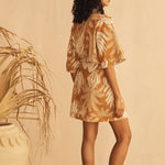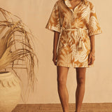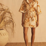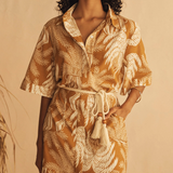 Introducing Aur Ocea's Dalla Palma Mini Shirt Dress, a mini shirt dress silhouette in a palm tree print of neutral golden warm toffee tones. Designed with a pointed classic collar, concealed button-through placket, and a rope-belted waist detail. Pair with sandals for sunlit strolls or elevate with heels for an evening out.