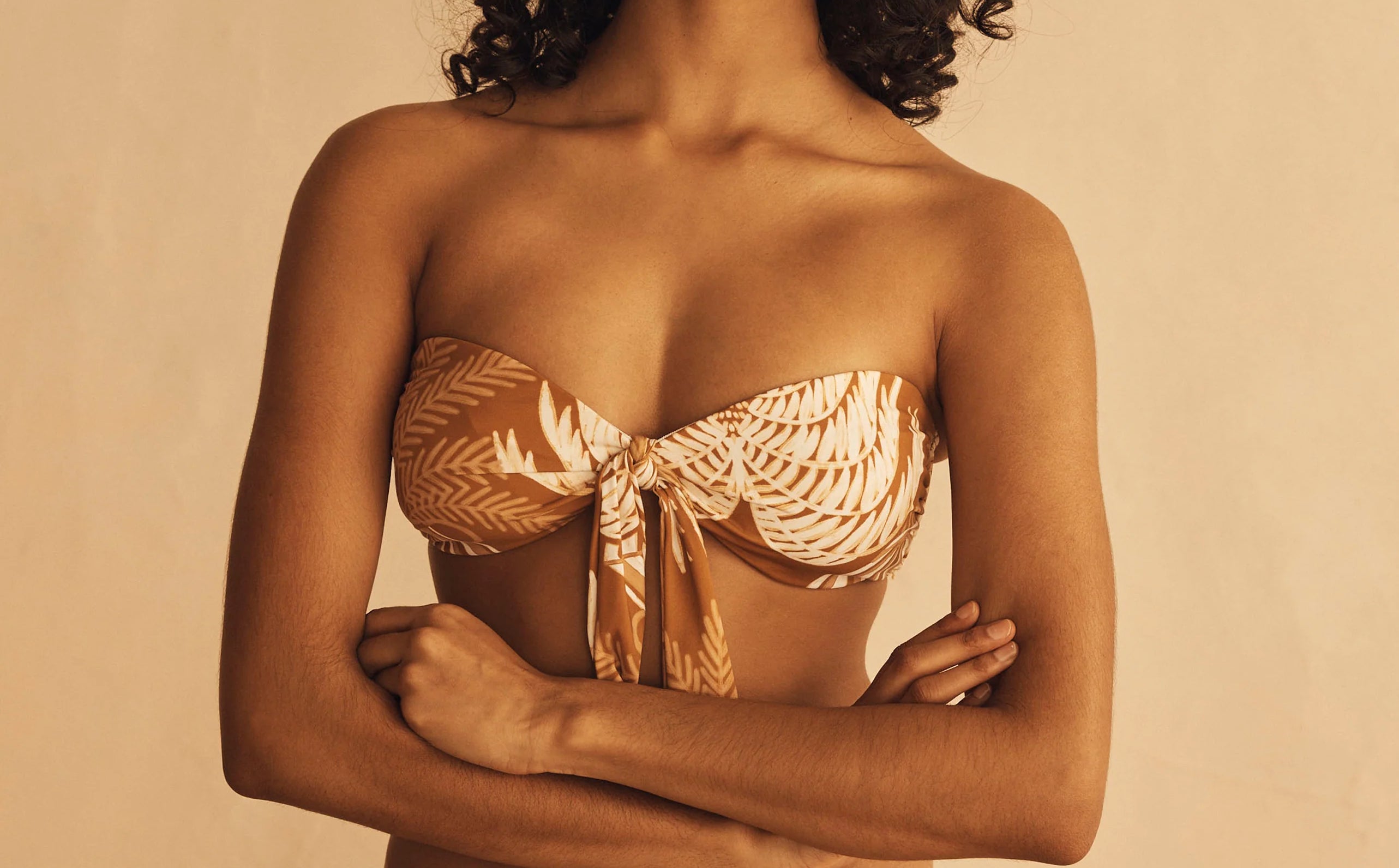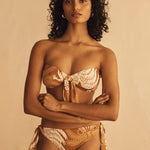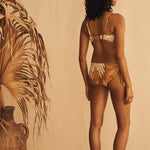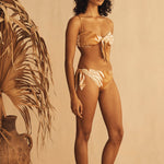 Introducing Aur Ocea's Dalla Palma Tie Bikini Top, a bandeau bikini top silhouette in a palm tree print of neutral golden warm toffee tones. Designed with a soft tie front and supportive soft bralette with removable cups. The Tie Bikini Top is fitted with optional removable shoulder straps. Small to medium coverage. Pair with matching Tie Bikini Pant to complete this look.