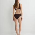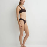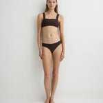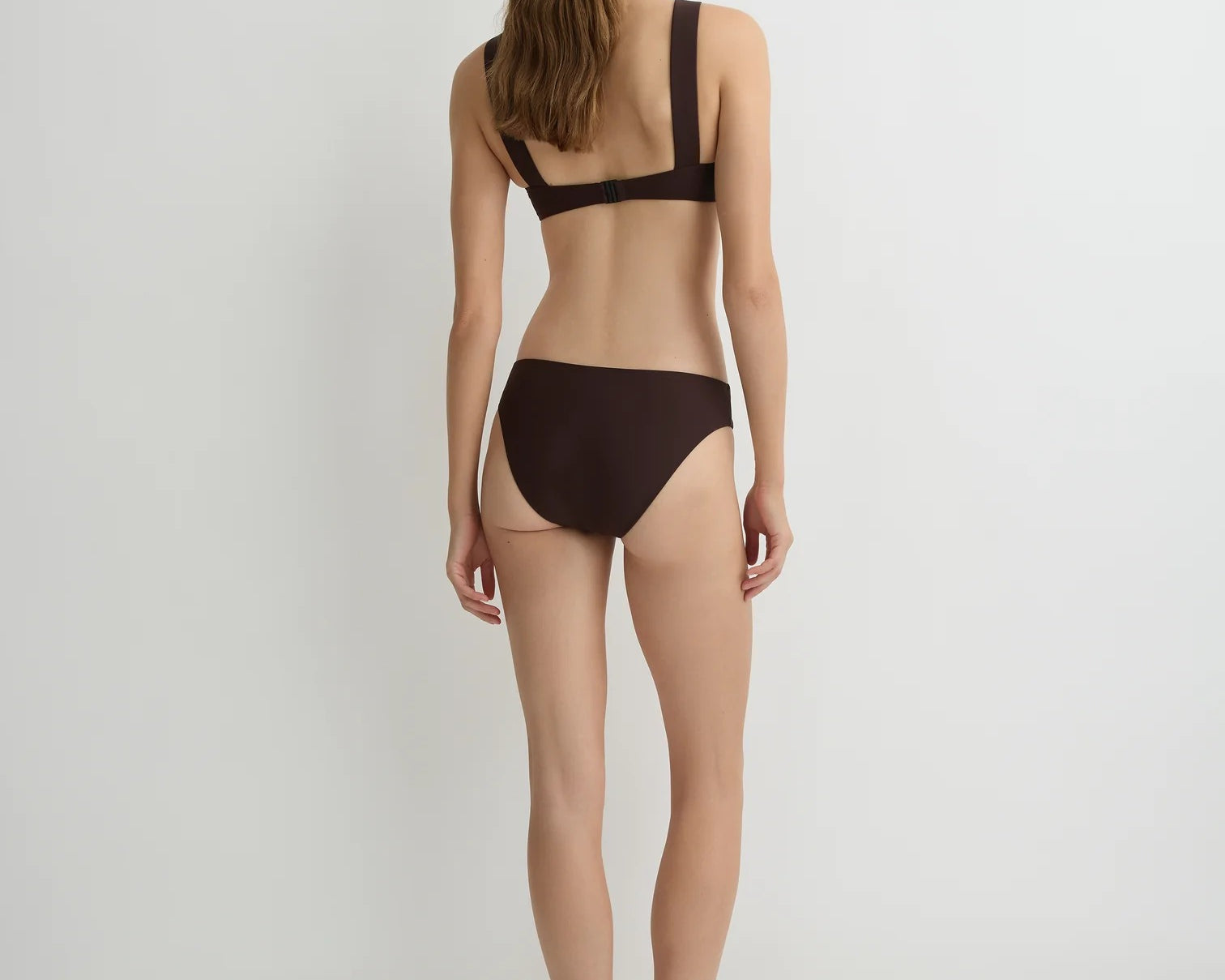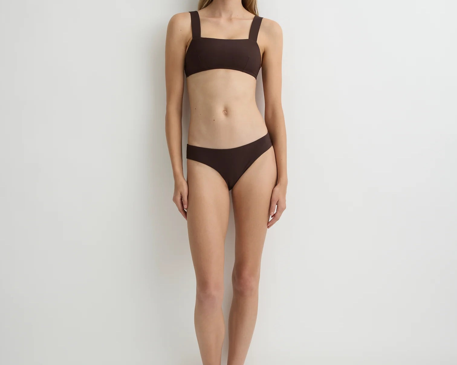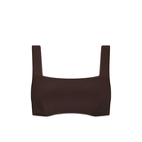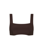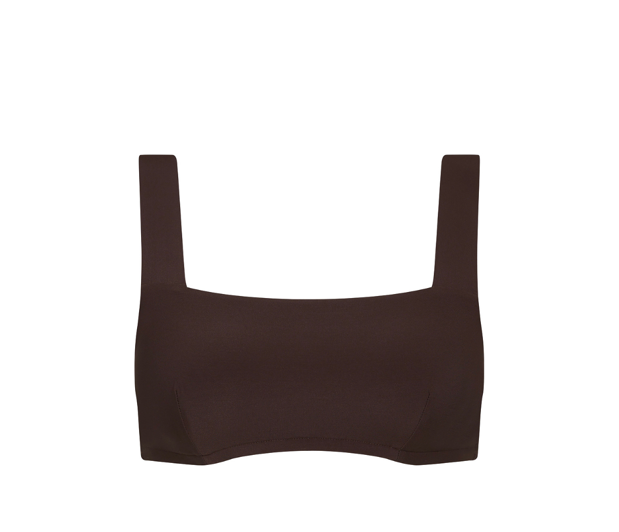 Introducing Bondi Born's Anja II Bikini Top in Mocha, a square-neck bikini top silhouette in a brown mocha hue. Designed with wide, elasticated straps that offer comfort and support, while removable cups enhance shape for cup sizes C to F. Crafted from Italian Sculpteur® fabric with patented 3-D stretch technology that lasts up to 10 times longer than standard swim fabrics.
