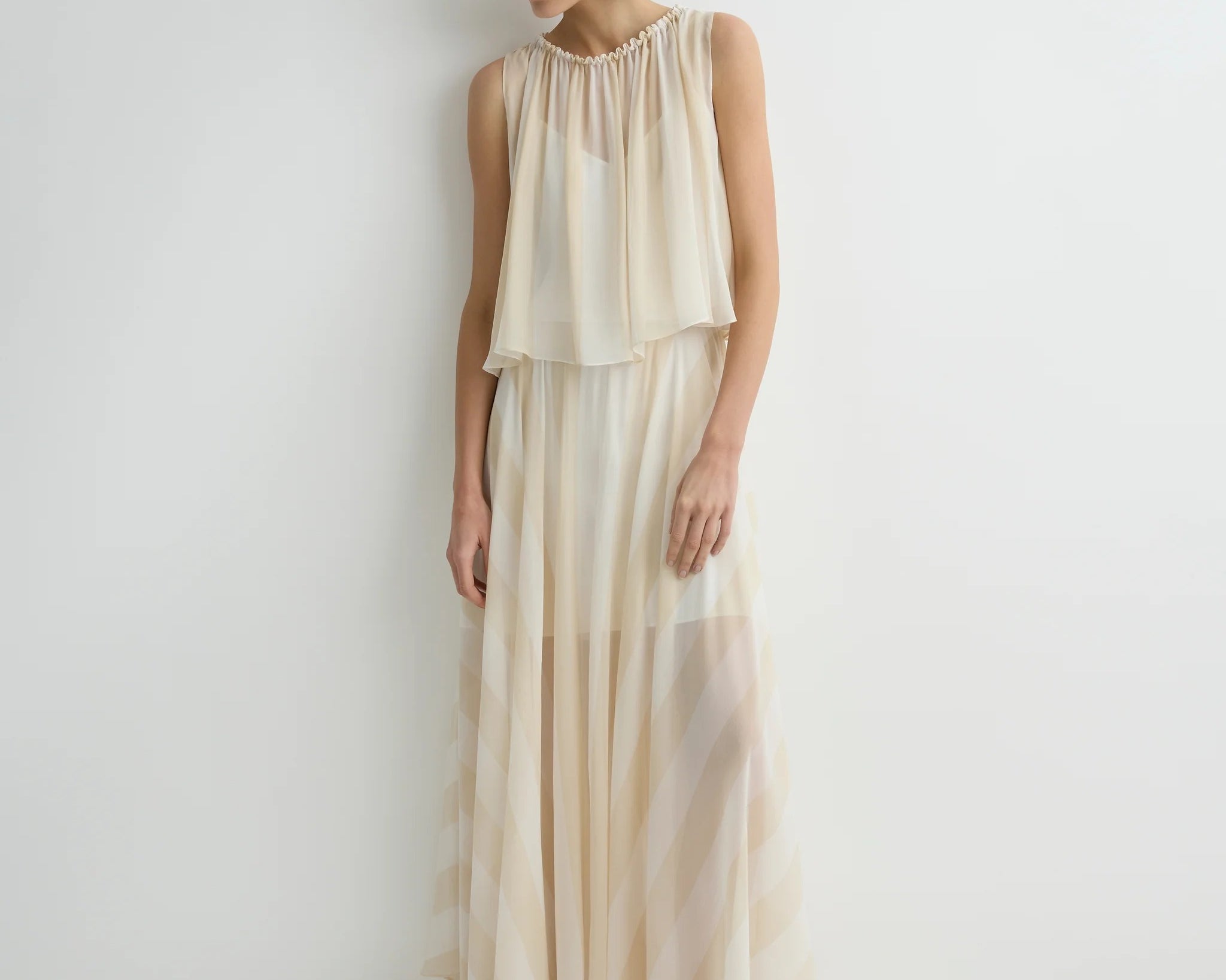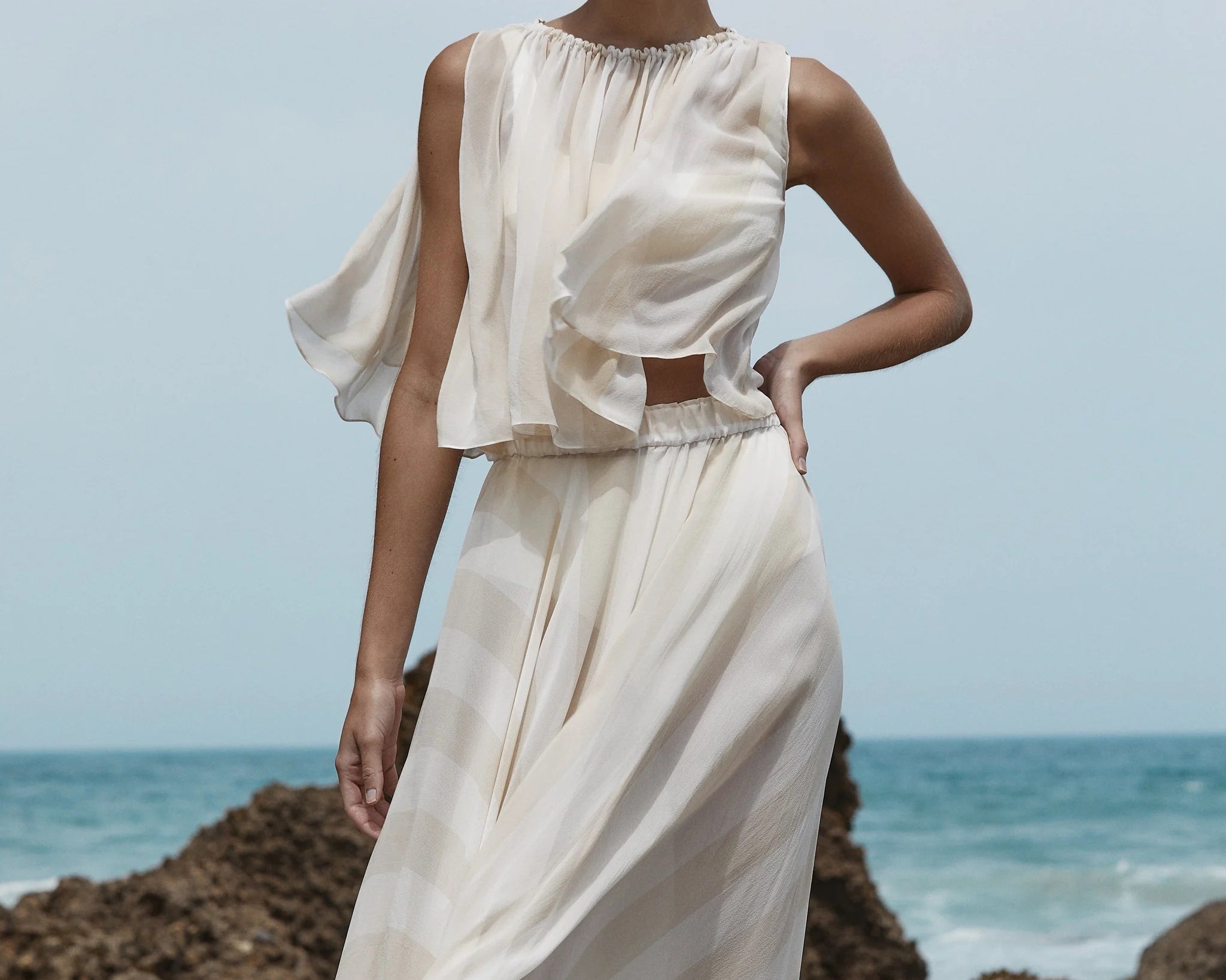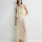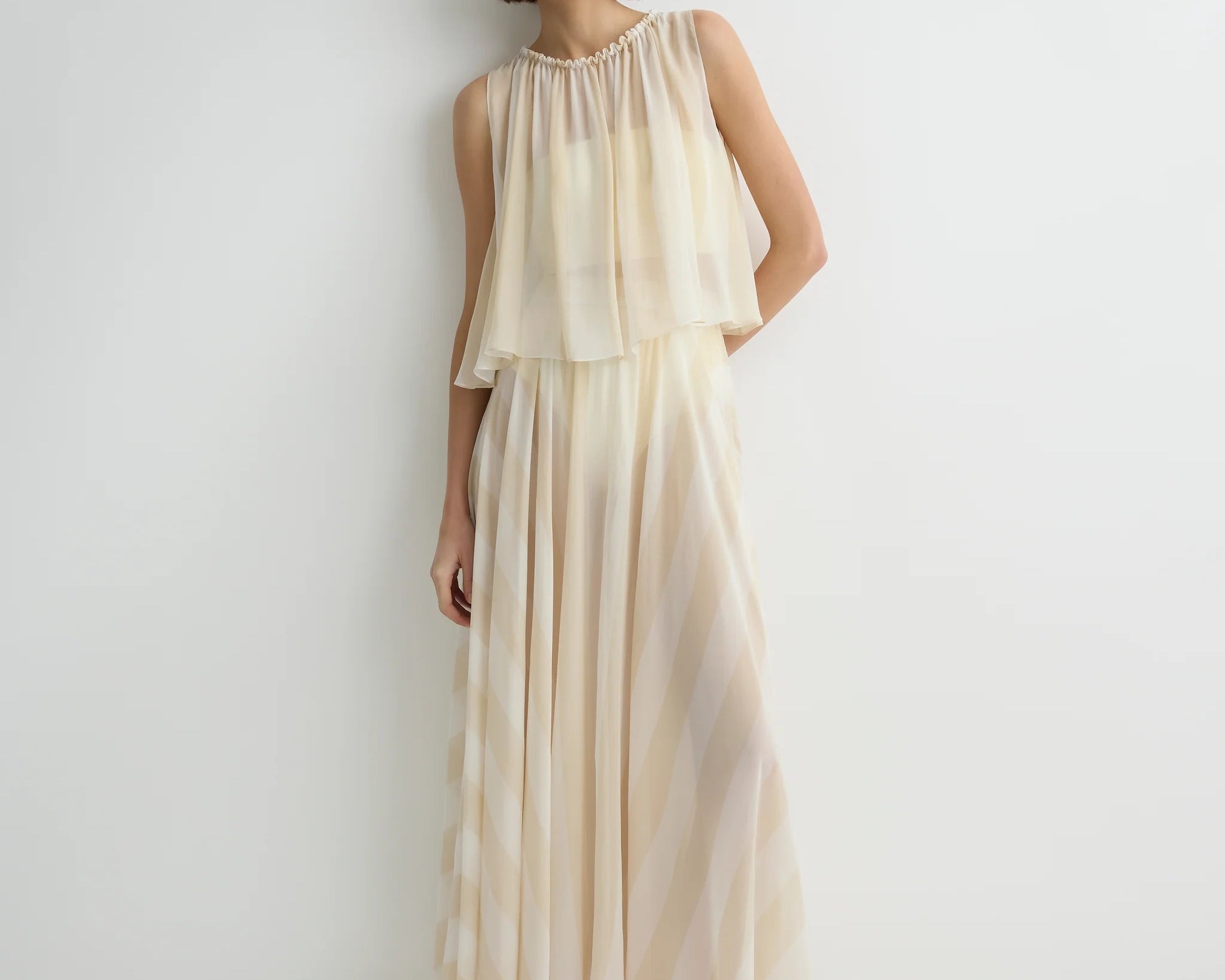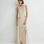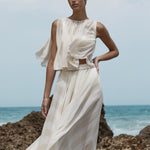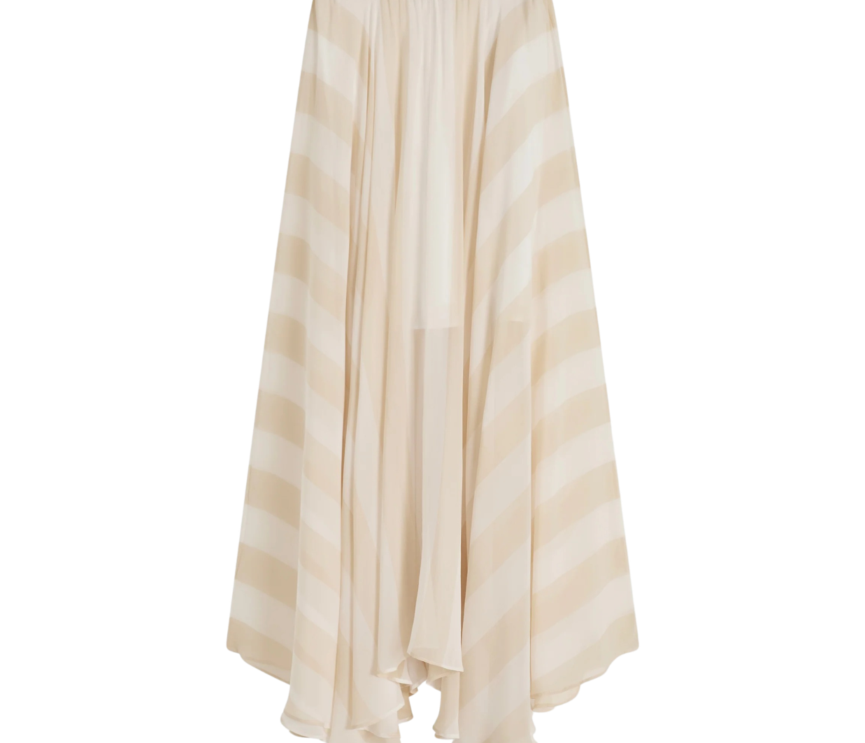 The limited-edition Capri Silk Circle Skirt in ecru stripe delivers dramatic, weightless movement in a full-circle cut. Crafted in sheer silk georgette and lined with a soft viscose slip, this floor-length silhouette embodies refined, effortless.