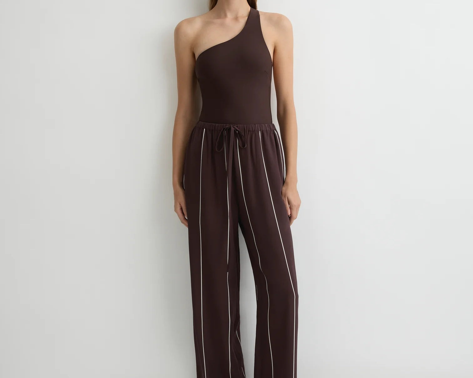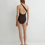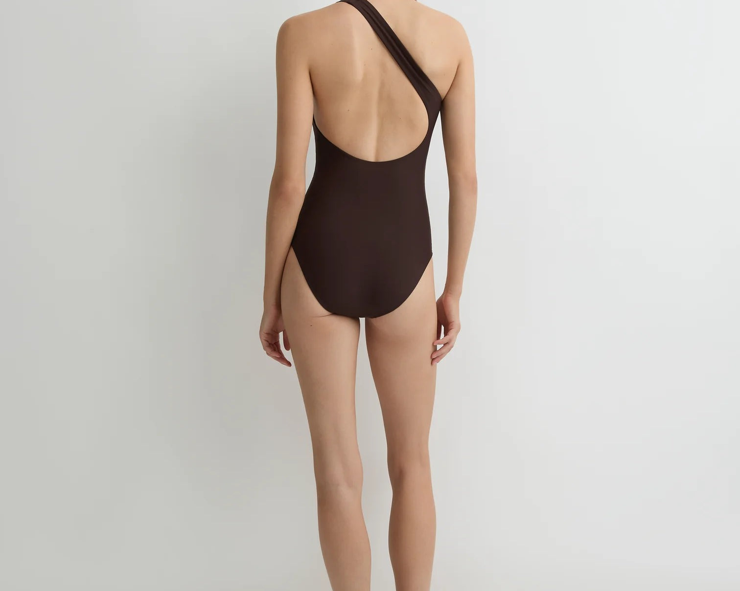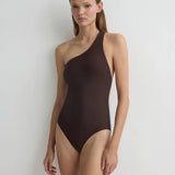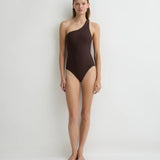 Introducing Bondi Born's Colette One Piece in Mocha, a one-shoulder one-piece swimsuit in a brown mocha hue. Crafted from Bondi Born’s signature Sculpteur® fabric with 3D stretch, the Colette is designed to sculpt the waist and lift the bust with discreet under-bust support; it features a dramatic scooped back for a touch of sensual elegance. A flattering, supportive fit suitable for cup sizes B to E.