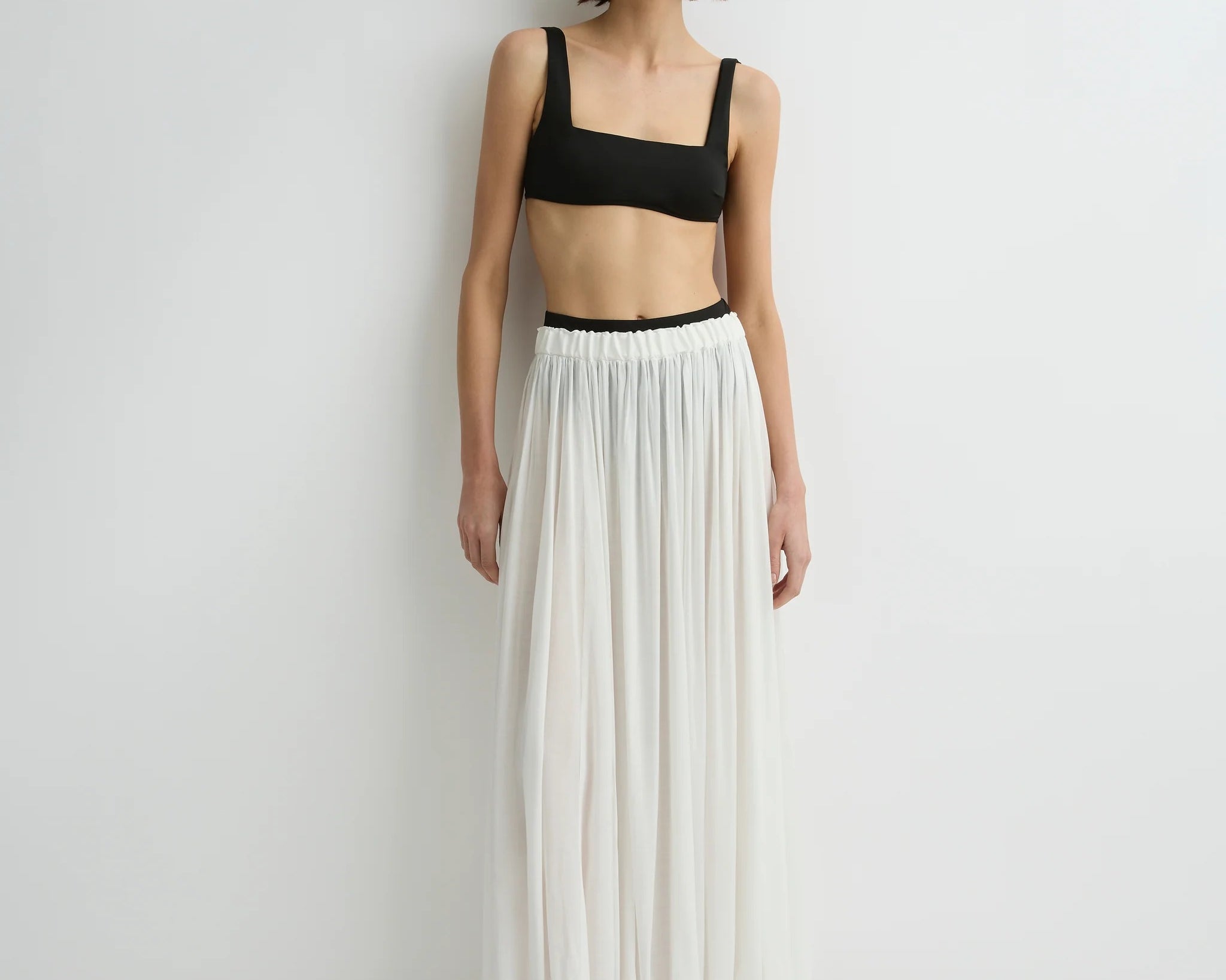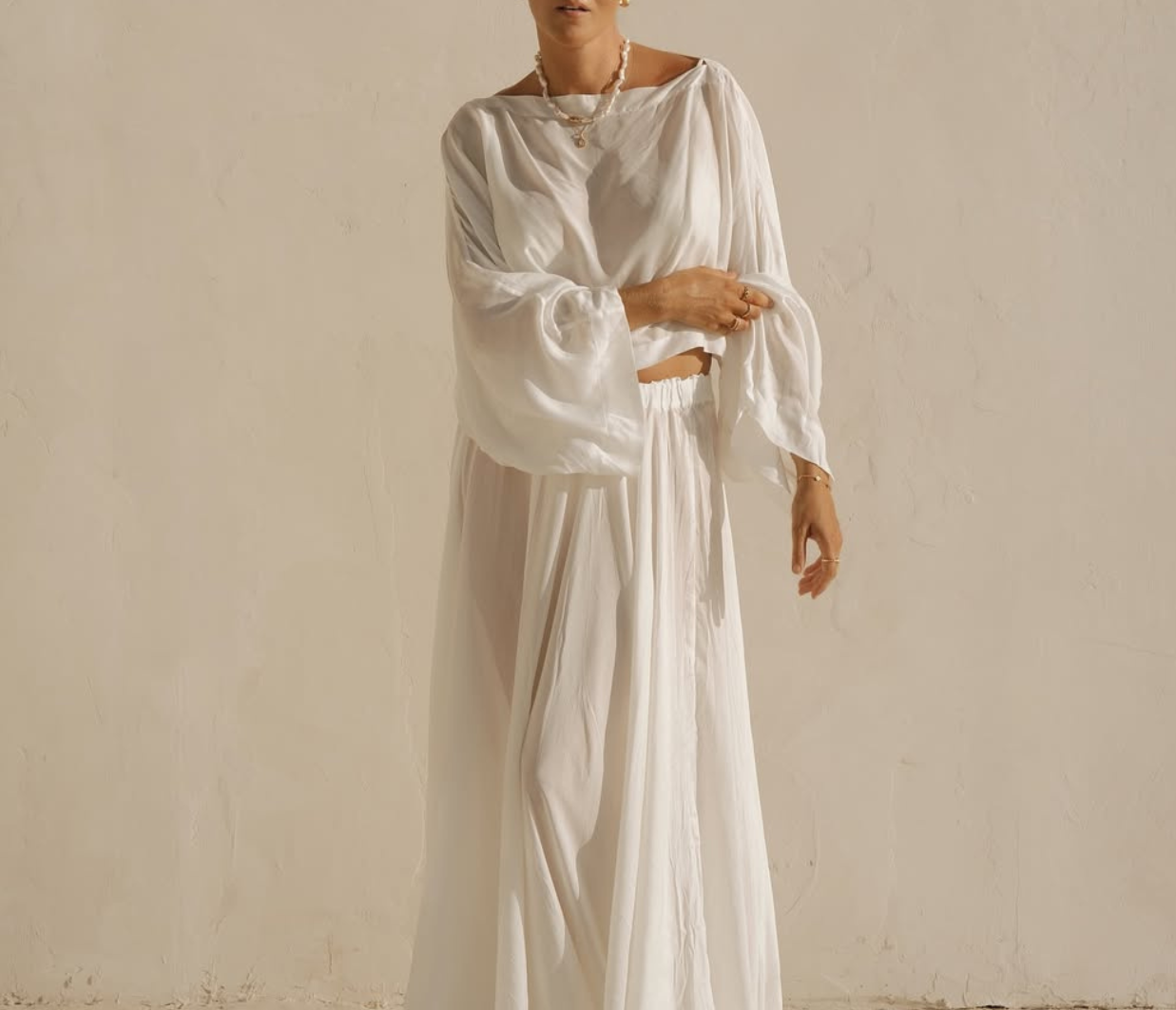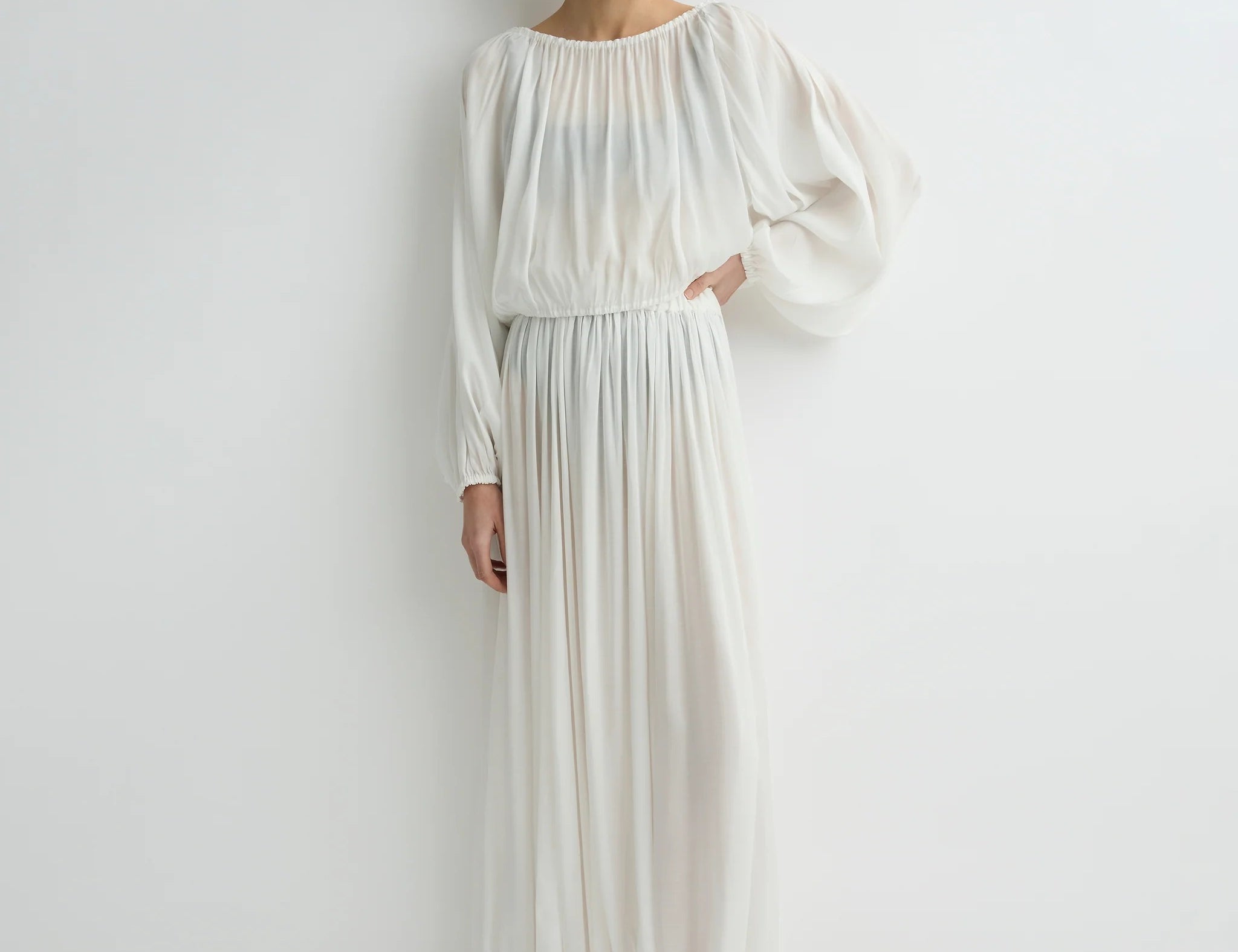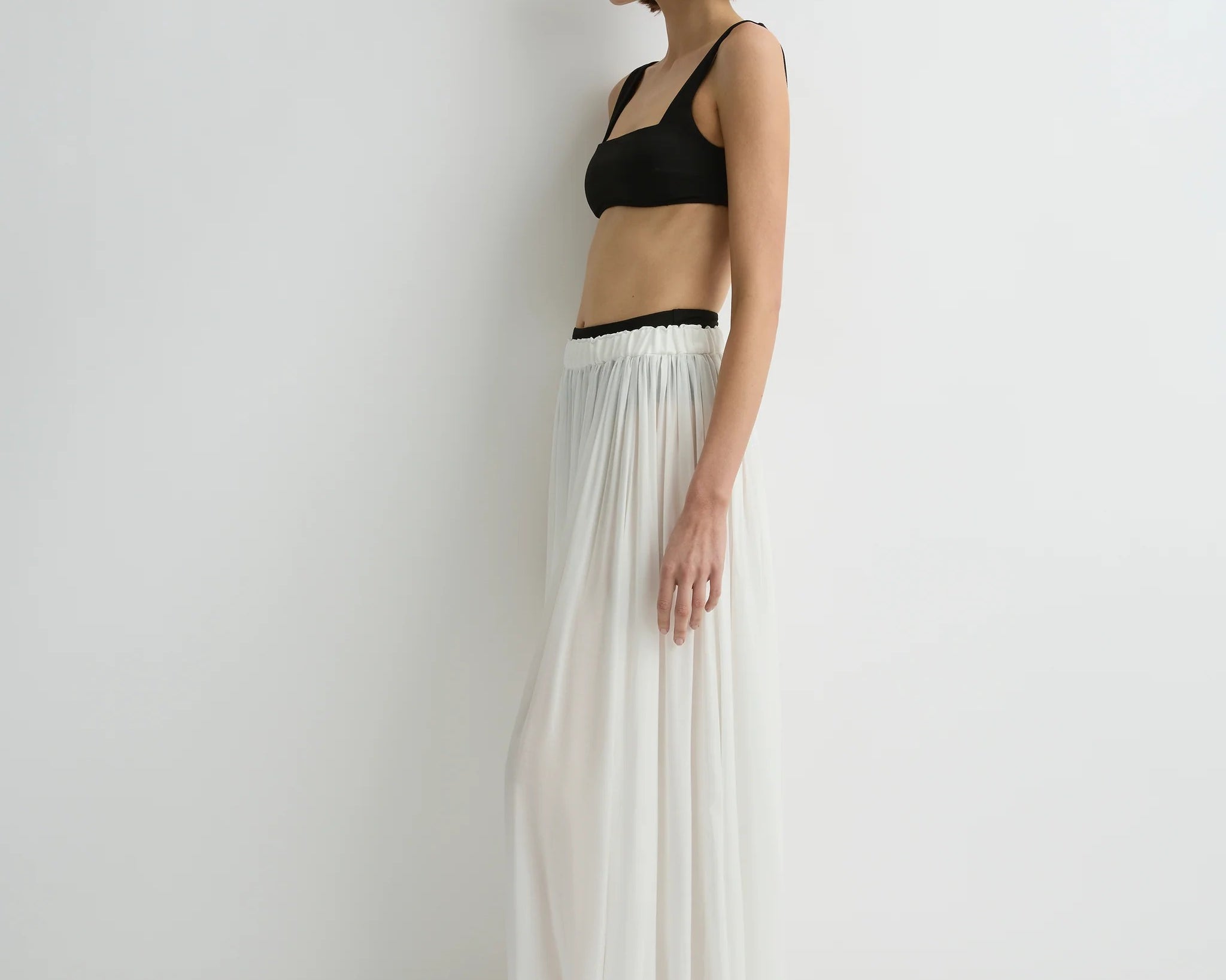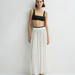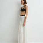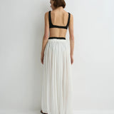 The limited-edition Cremona Balloon Skirt in white offers a modern, voluminous full-length silhouette cut from sheer European voile. Its elastic waist and hem create gentle architectural shape while maintaining effortless movement. An elevated warm-weather piece that feels both refined and weightless.