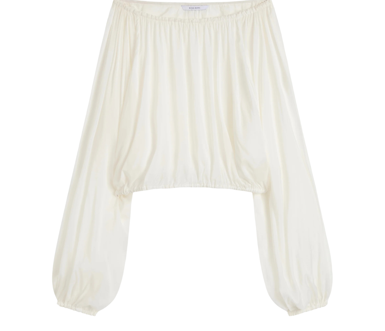 - Elasticated neck, sleeves, and hem create a softly voluminous, cropped shape