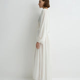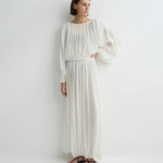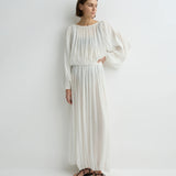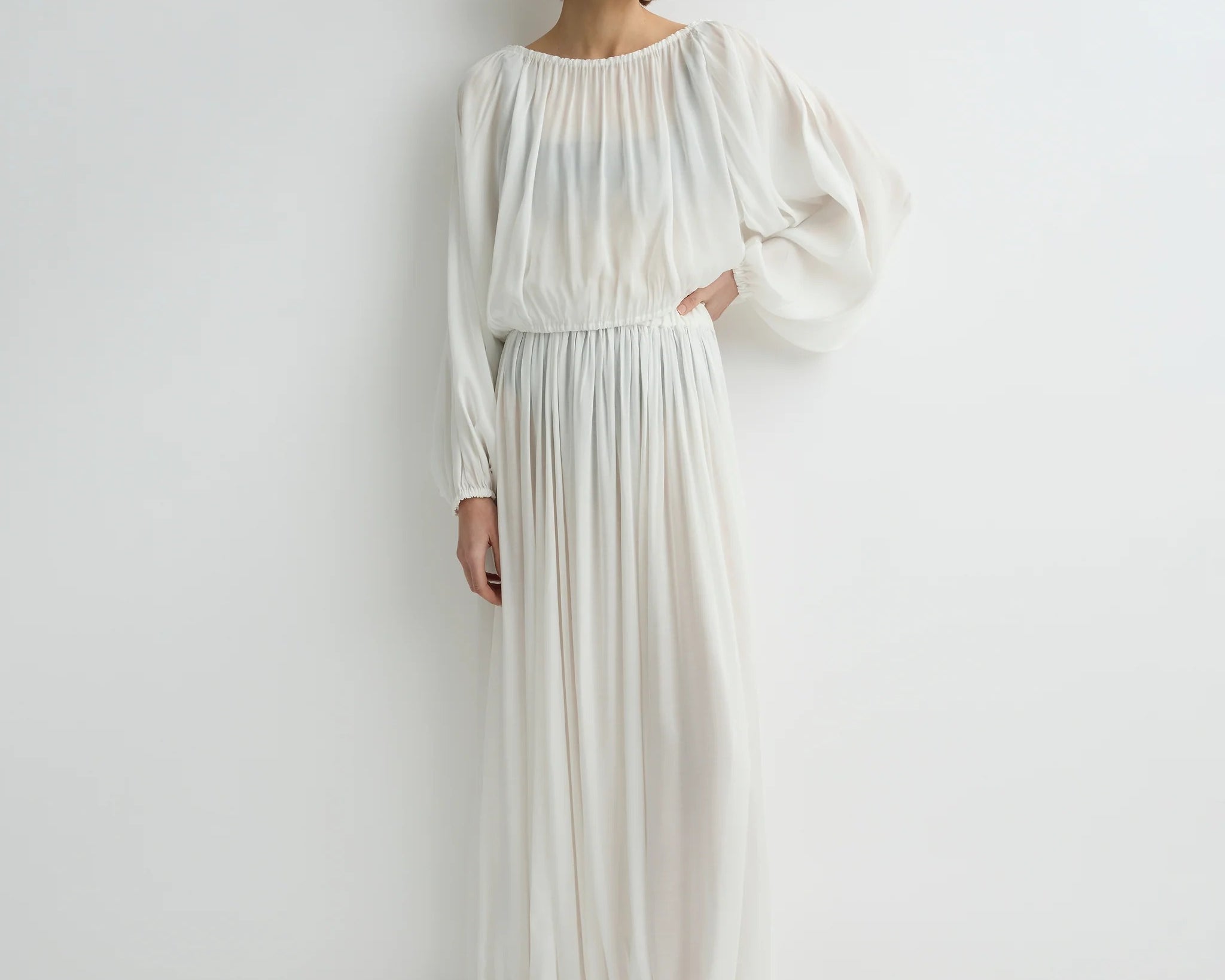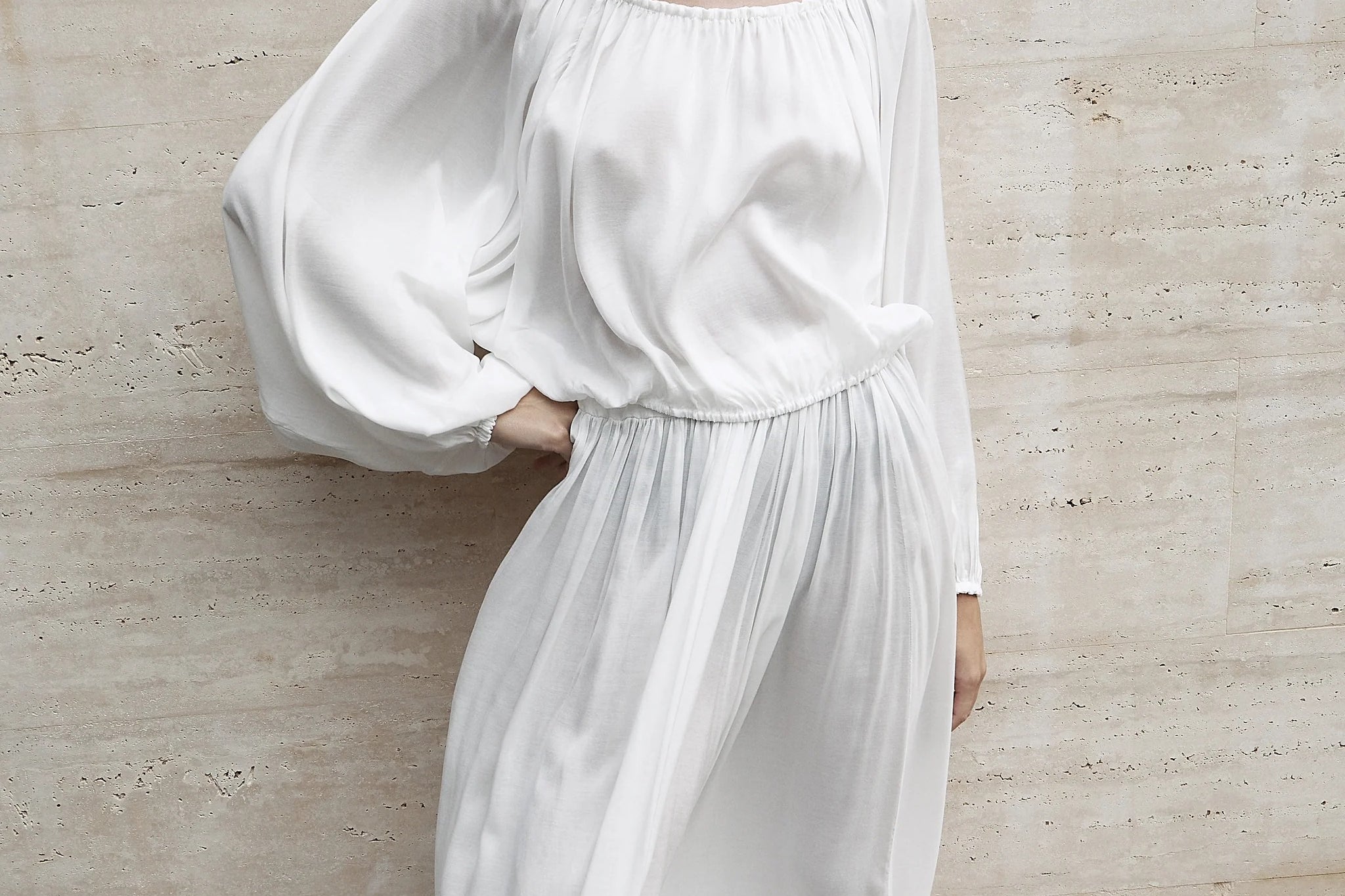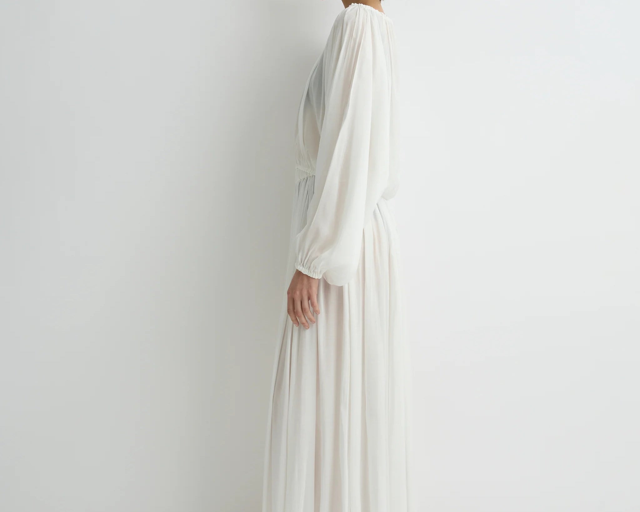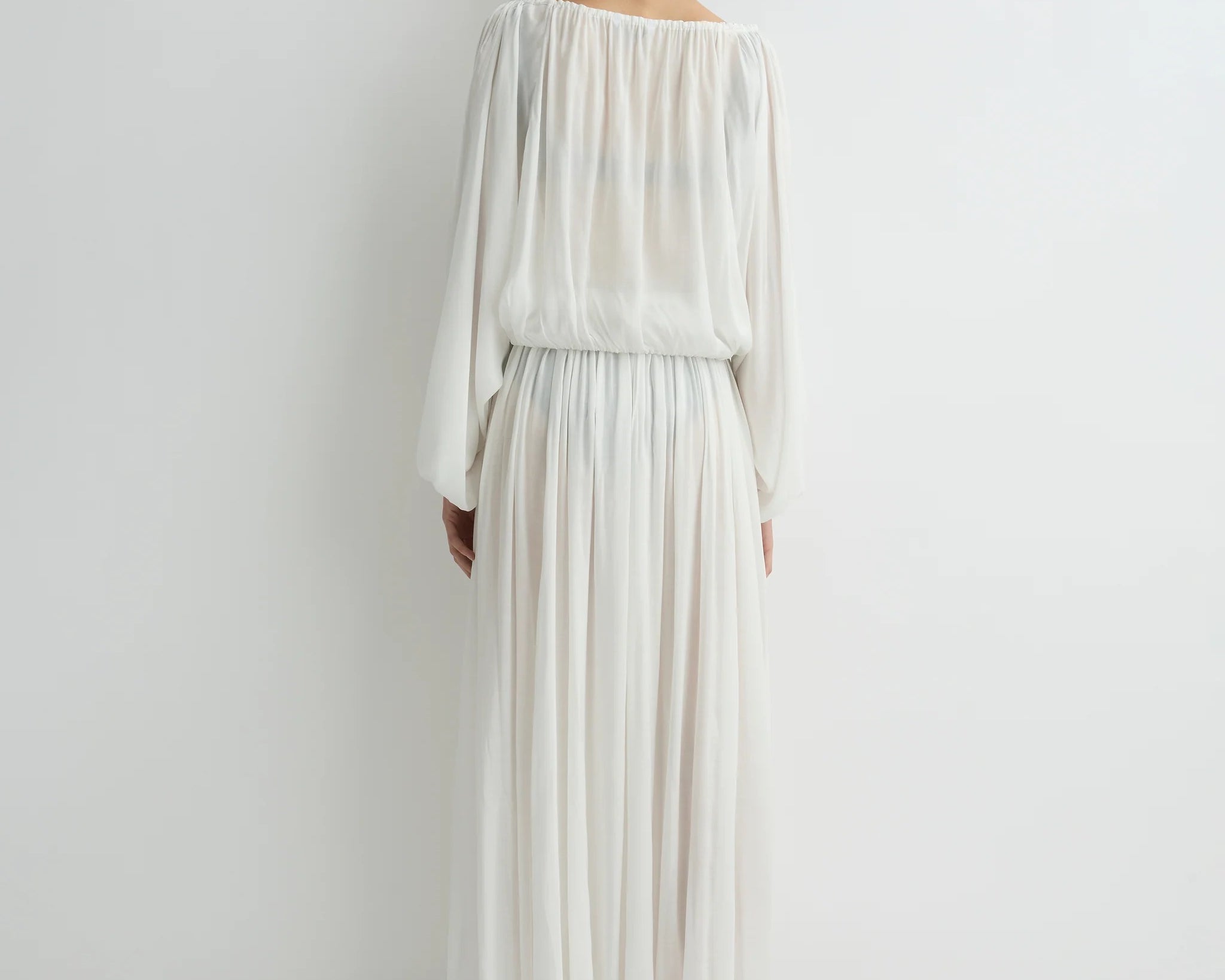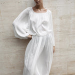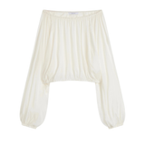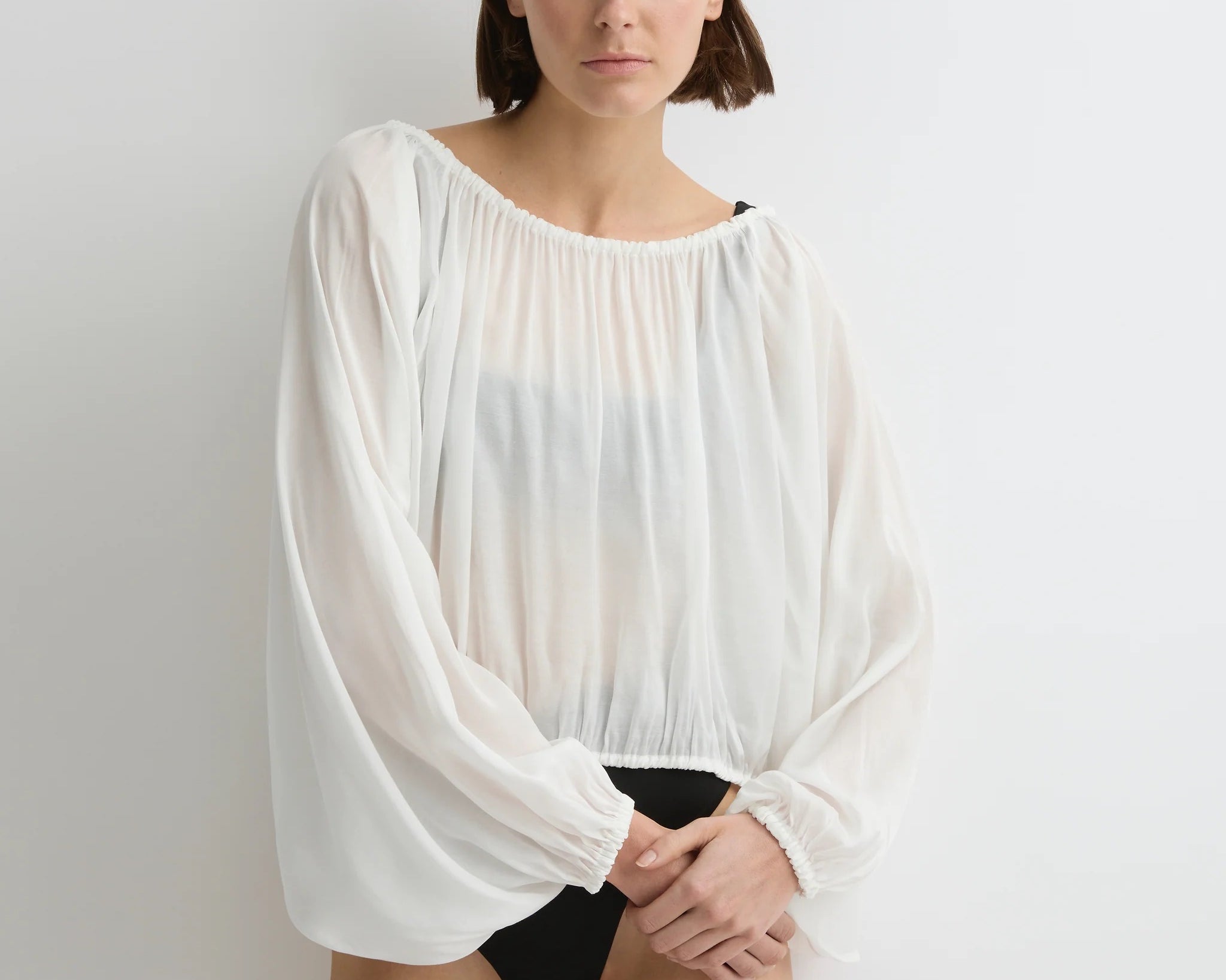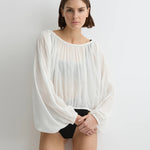 The Cremona Balloon Top in white brings soft volume and contemporary ease to summer styling. Crafted from sheer European voile, its gathered neckline, sleeves and hem create an airy, lightweight silhouette. Cropped and relaxed, it pairs effortlessly with both structured and fluid separates.