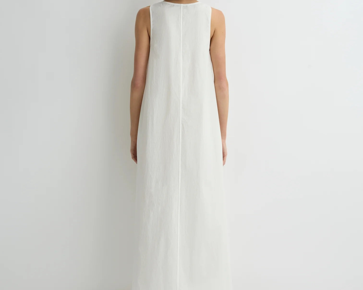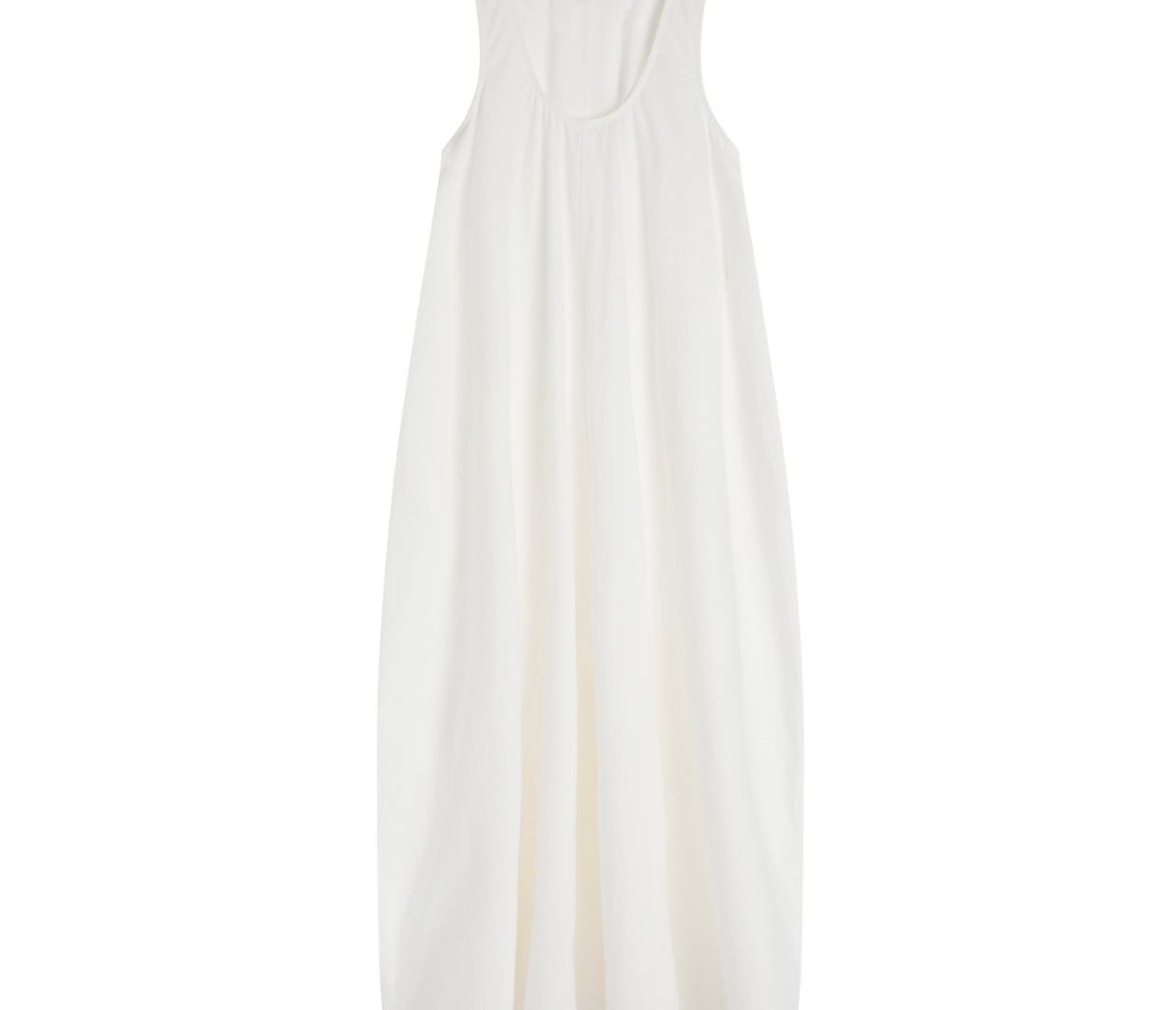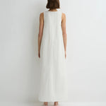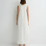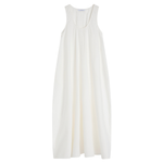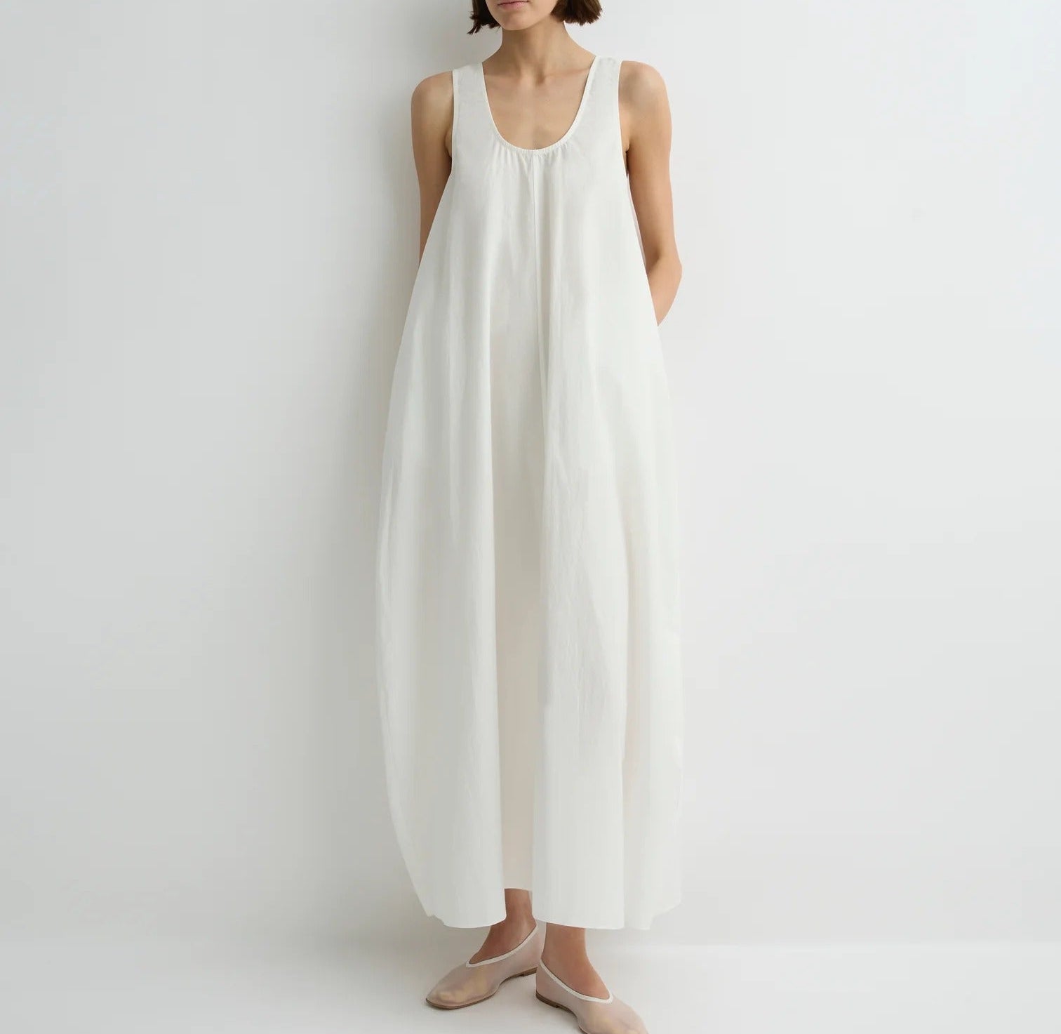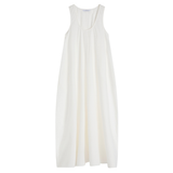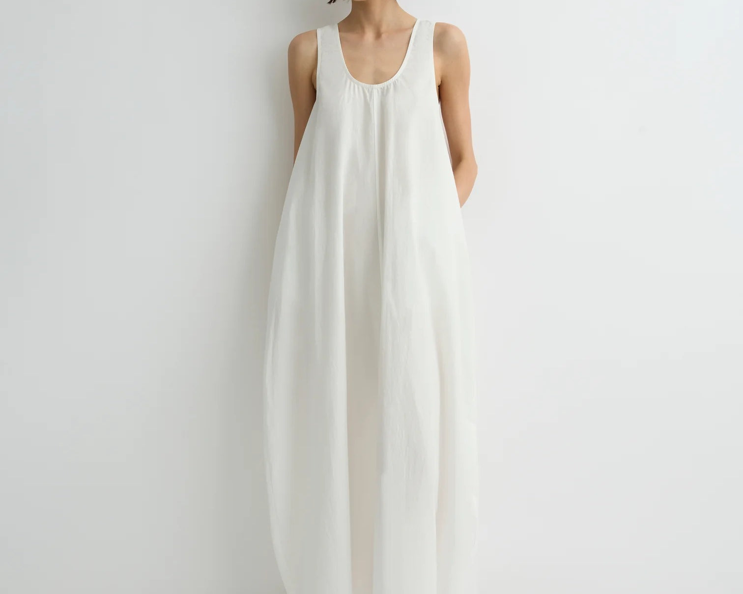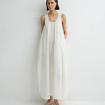 Introducing Bondi Born's Kyoto Cocoon Dress in White, a relaxed cocoon maxi-length dress silhouette in a white hue. Designed from crisp Japanese dry cotton poplin, the Kyoto dress is defined by its sculptural cocoon shape, featuring a scooped neckline and discreet side pockets. Cut with an oversized fit, it balances ease and elegance, perfect for warm-weather dressing.