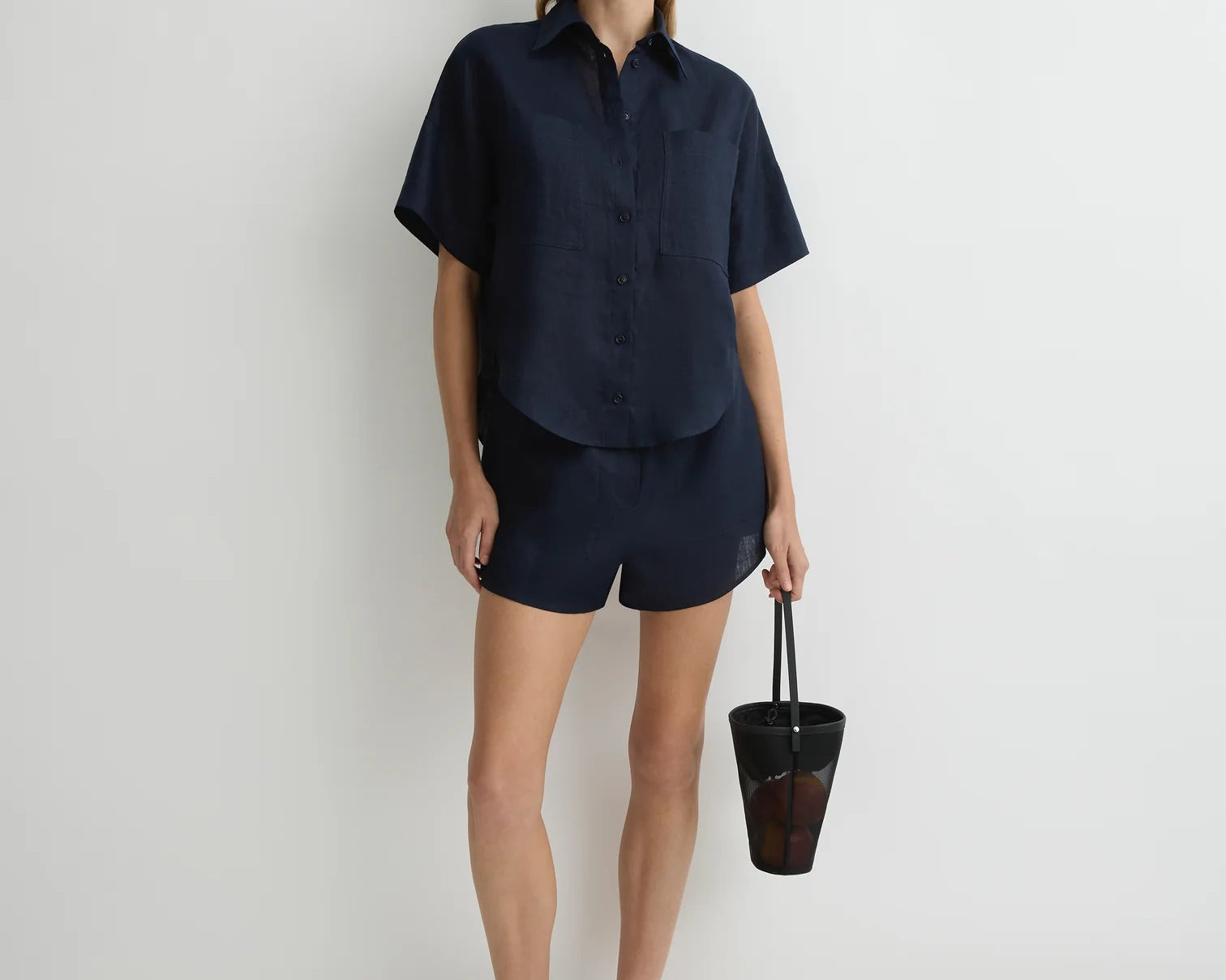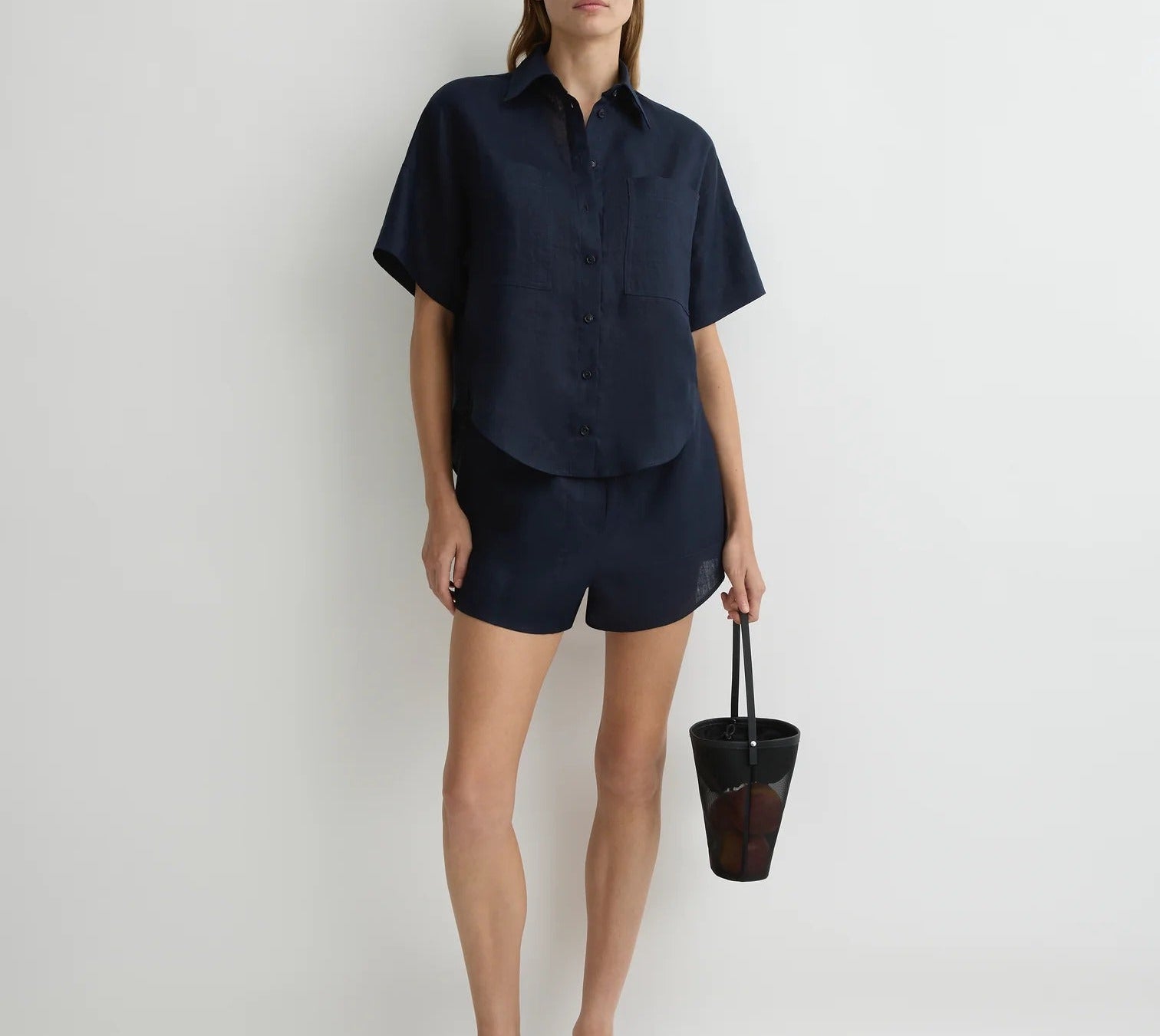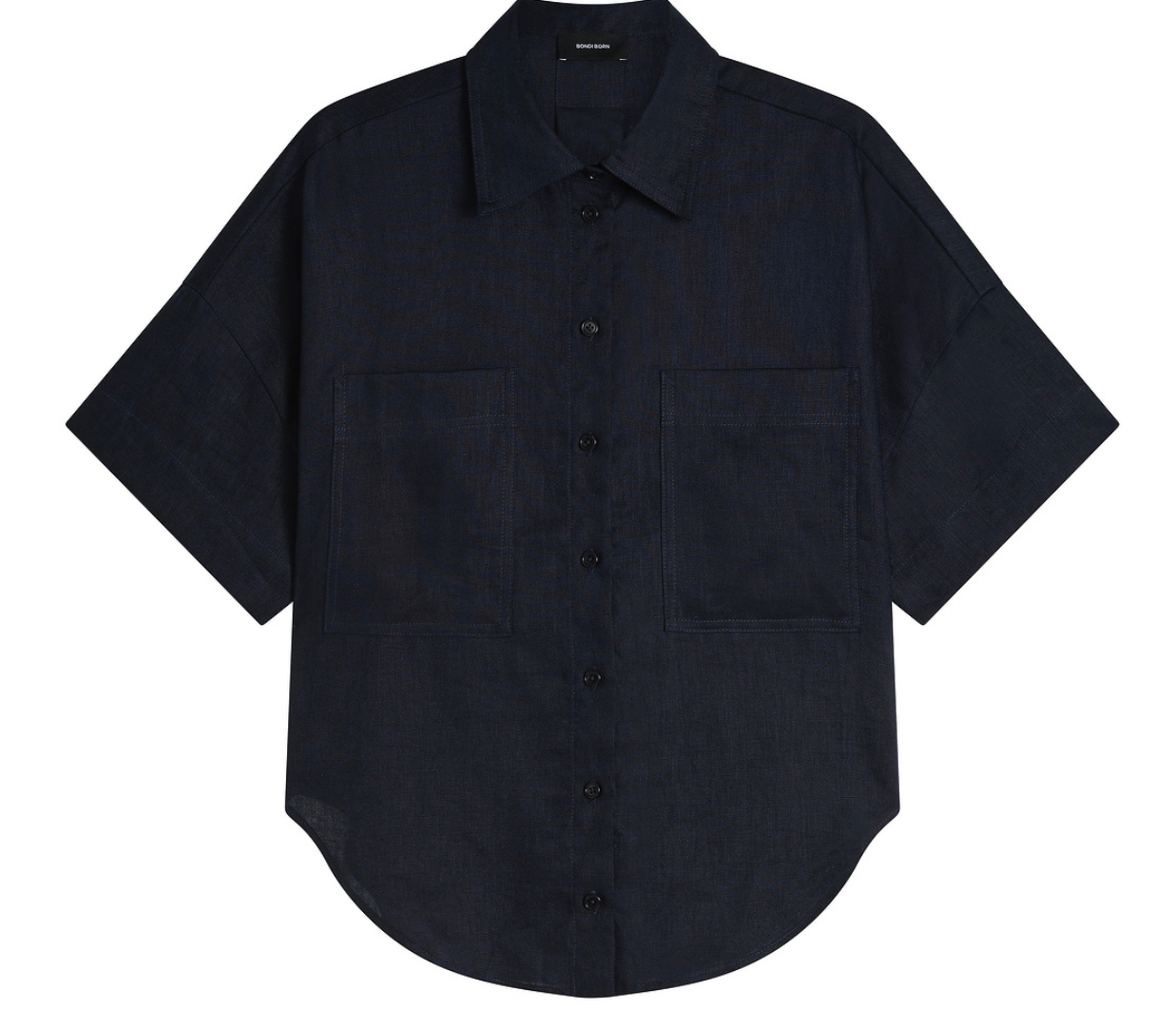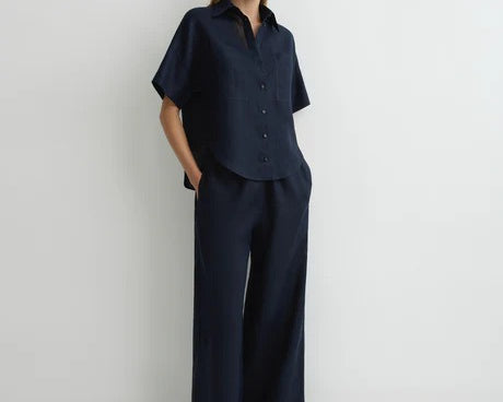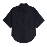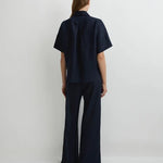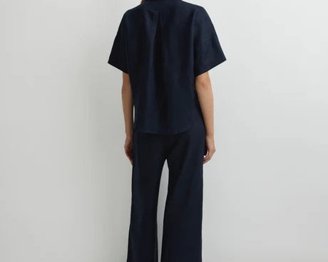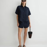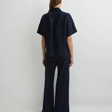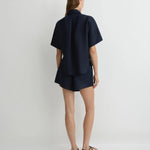Introducing Bondi Born's Leiden Short Sleeve Shirt in Navy, a relaxed, boxy short-sleeve shirt in navy blue. Designed in a classic collar silhouette with a button-front closure and shaped hem, finished with chest pockets and sustainably sourced Japanese buttons made from plant-derived material. Versatile and timeless, it can be styled with our matching Leiden Short in Navy for a chic, coordinated look.