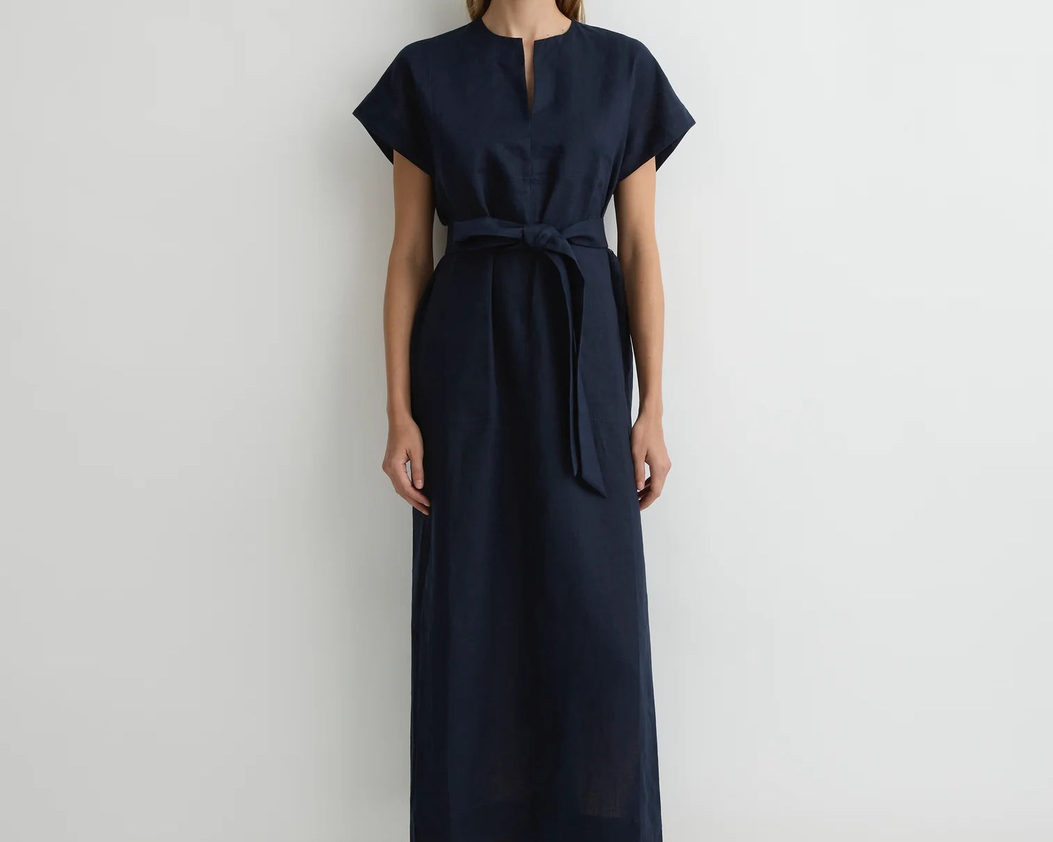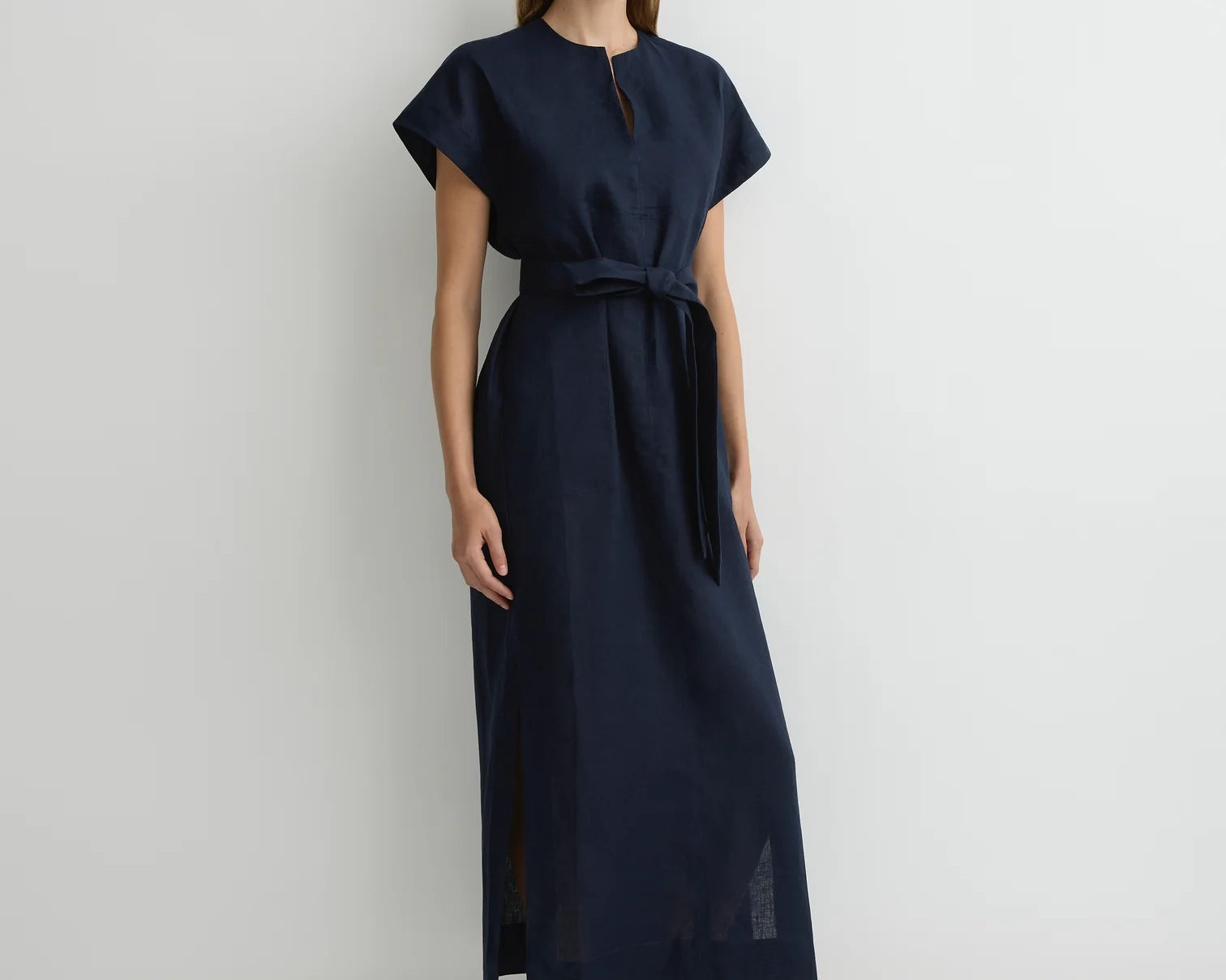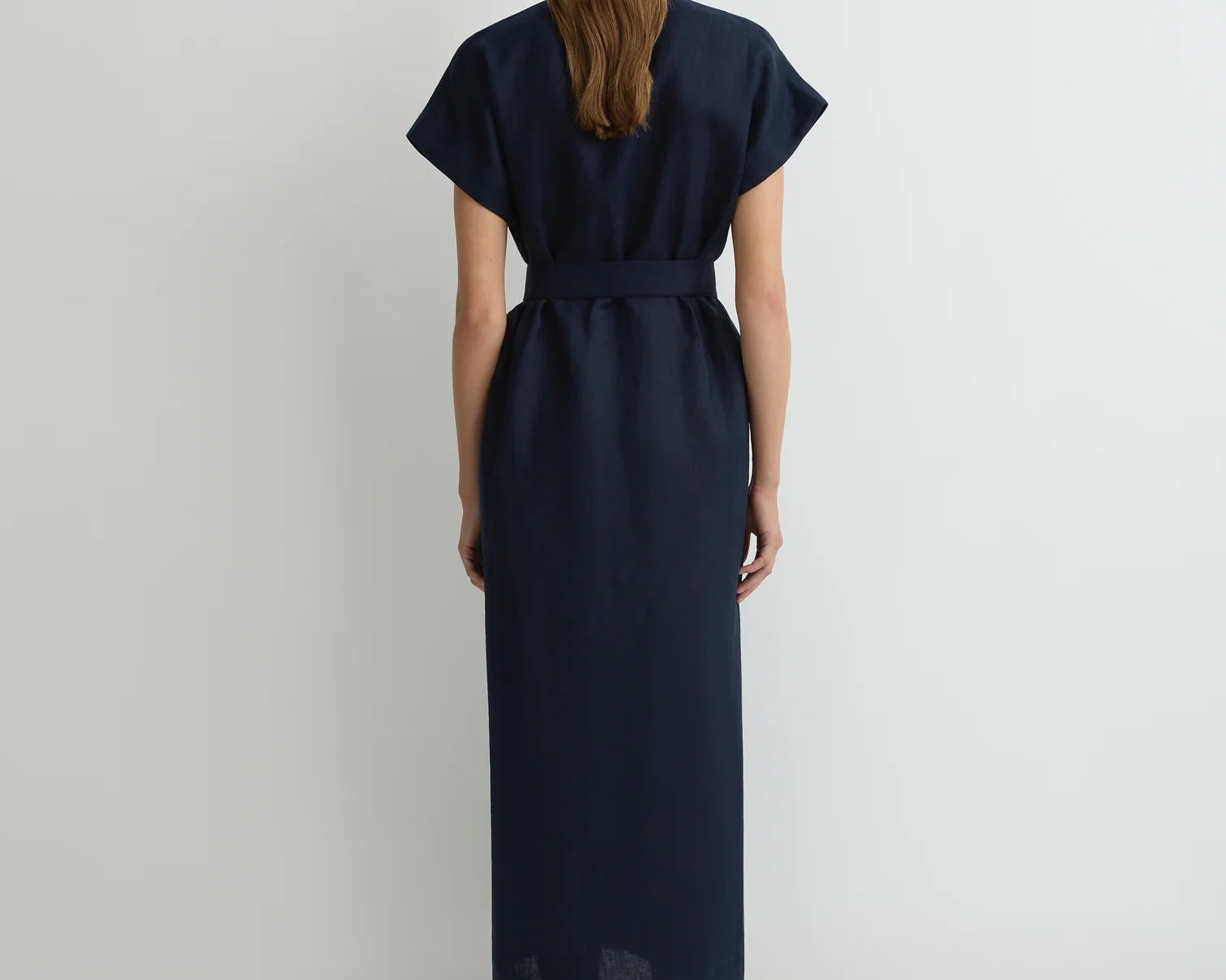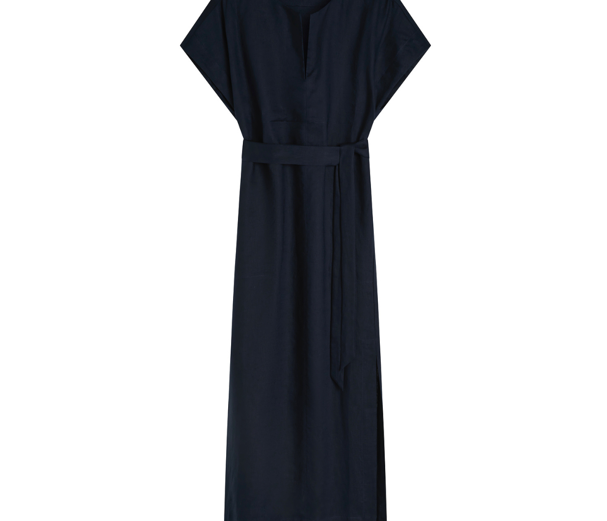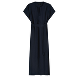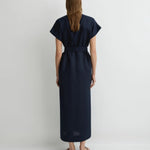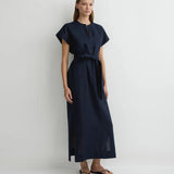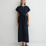 Introducing Bondi Born's Leiden Universal Tunic Dress in Navy, a short-sleeve midi dress silhouette in navy blue. The Leiden features a crew neckline with a front split, side pockets, and high side splits for ease of movement. Designed with a removable self-tie belt, it can be worn loose for effortless ease or cinched at the waist for subtle definition.