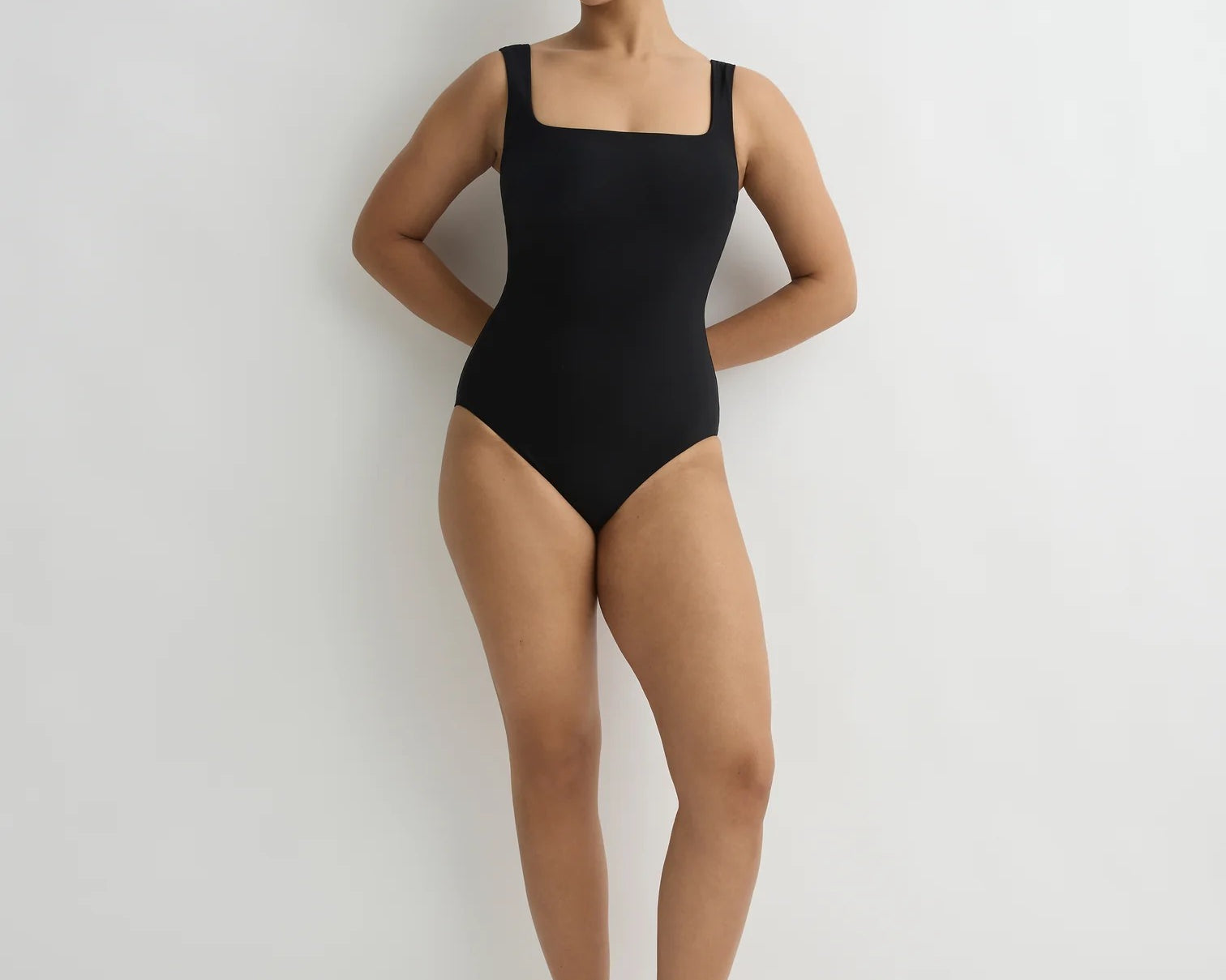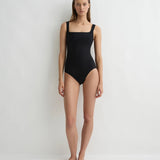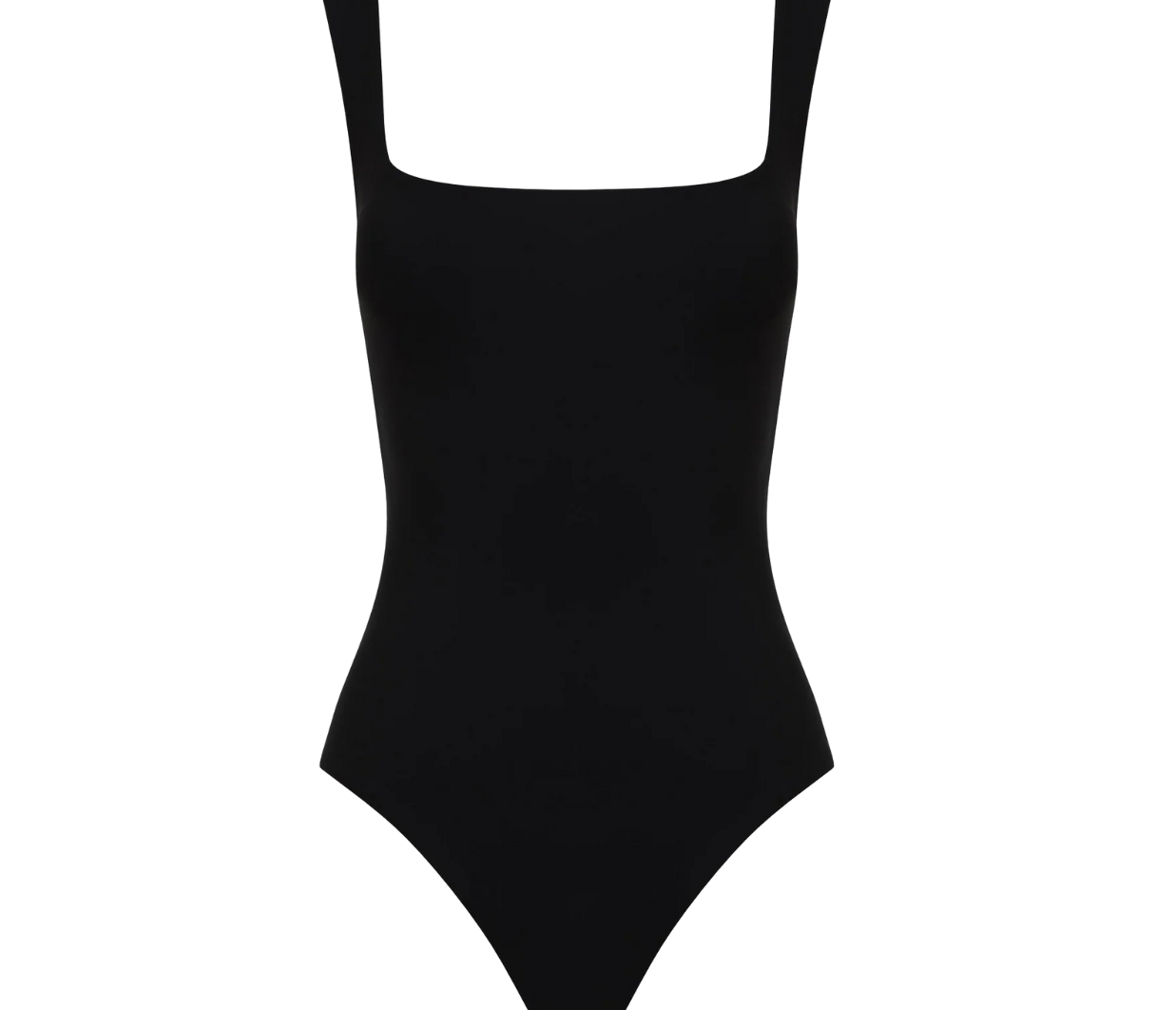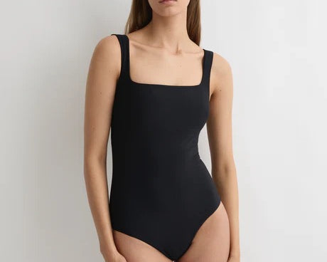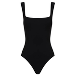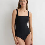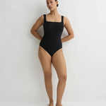 Introducing Bondi Born's Mackinley One Piece in Black, a classic one-piece swimsuit silhouette in black. The Mackinley features a refined square neckline, invisible under-bust support, removable bra cups, and a regular leg line, ideal for most body types and bust sizes from B to DD.