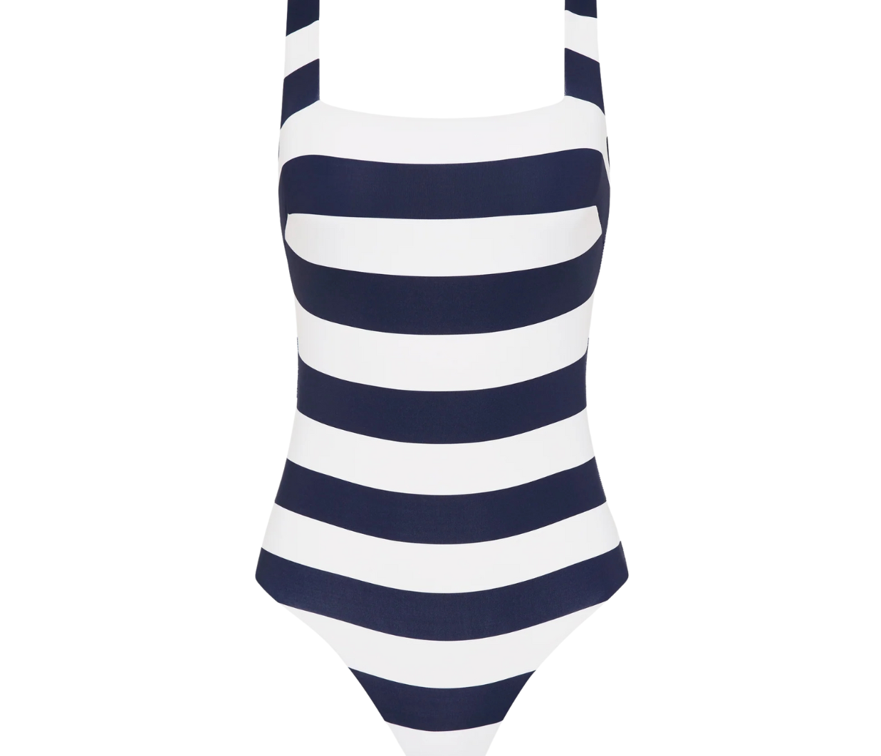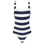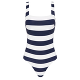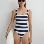 Introducing Bondi Born's Margot One Piece in Navy Stripe, a one-piece swimsuit in a white and navy stripe pattern. The Margot in Navy Stripe features a square neckline front and back, wide, soft shoulder straps, a medium-high cut leg, and regular bottom coverage. Perfect summer weather day.