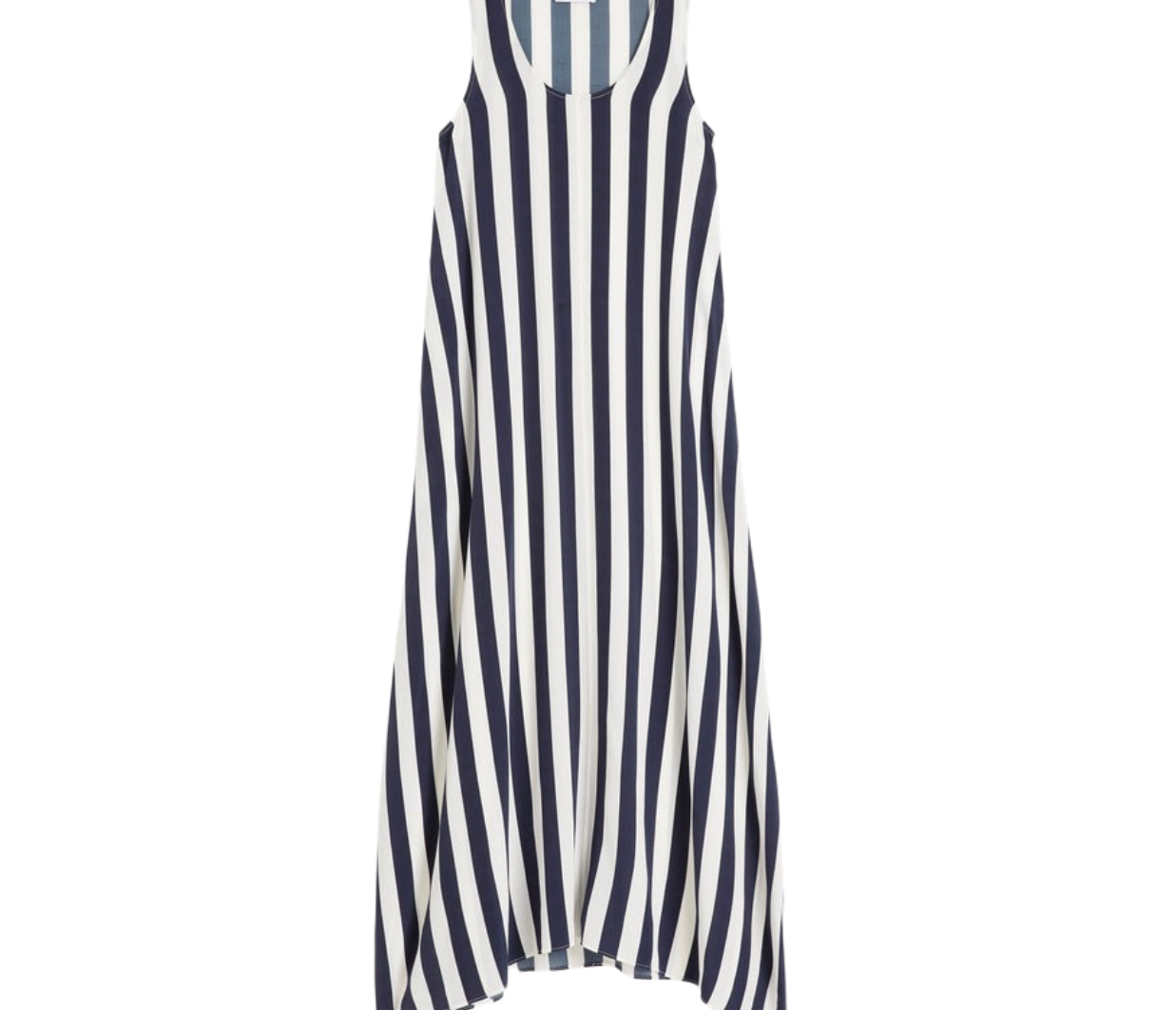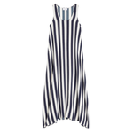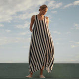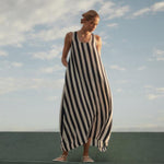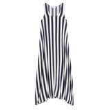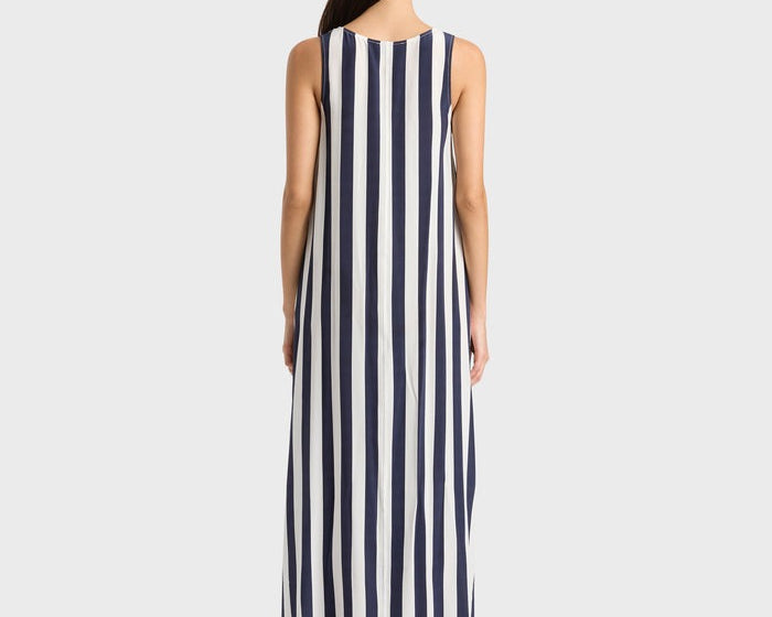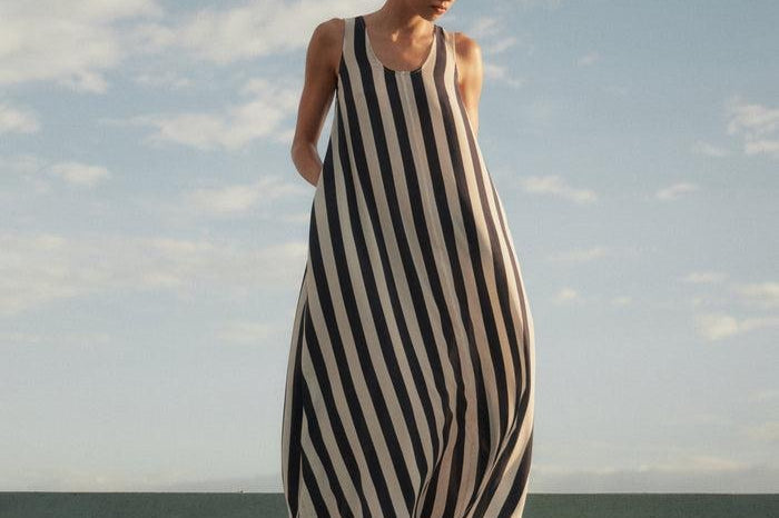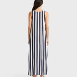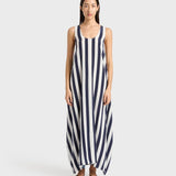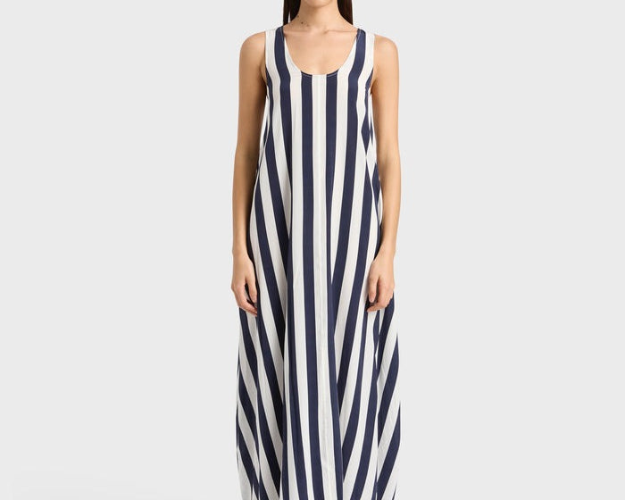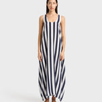 Introducing Bondi Born's Orta Silk Cocoon Dress in Navy Stripe, a relaxed cocoon maxi-length dress silhouette in a white hue. Designed from crisp Japanese dry cotton poplin, the Kyoto dress is defined by its sculptural cocoon shape, featuring a scooped neckline and discreet side pockets. Cut with an oversized fit, it balances ease and elegance, perfect for warm-weather dressing.