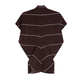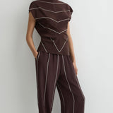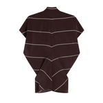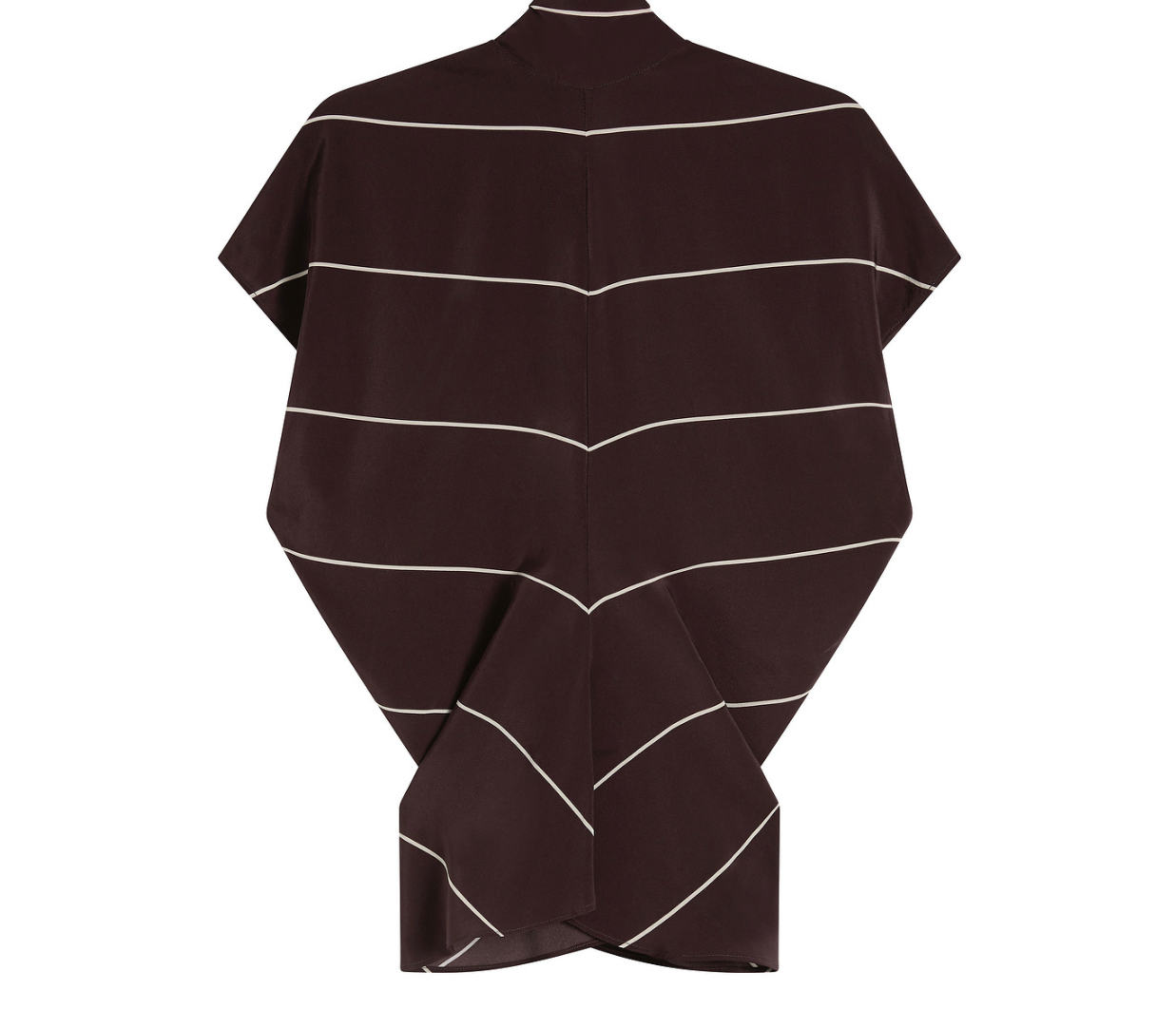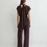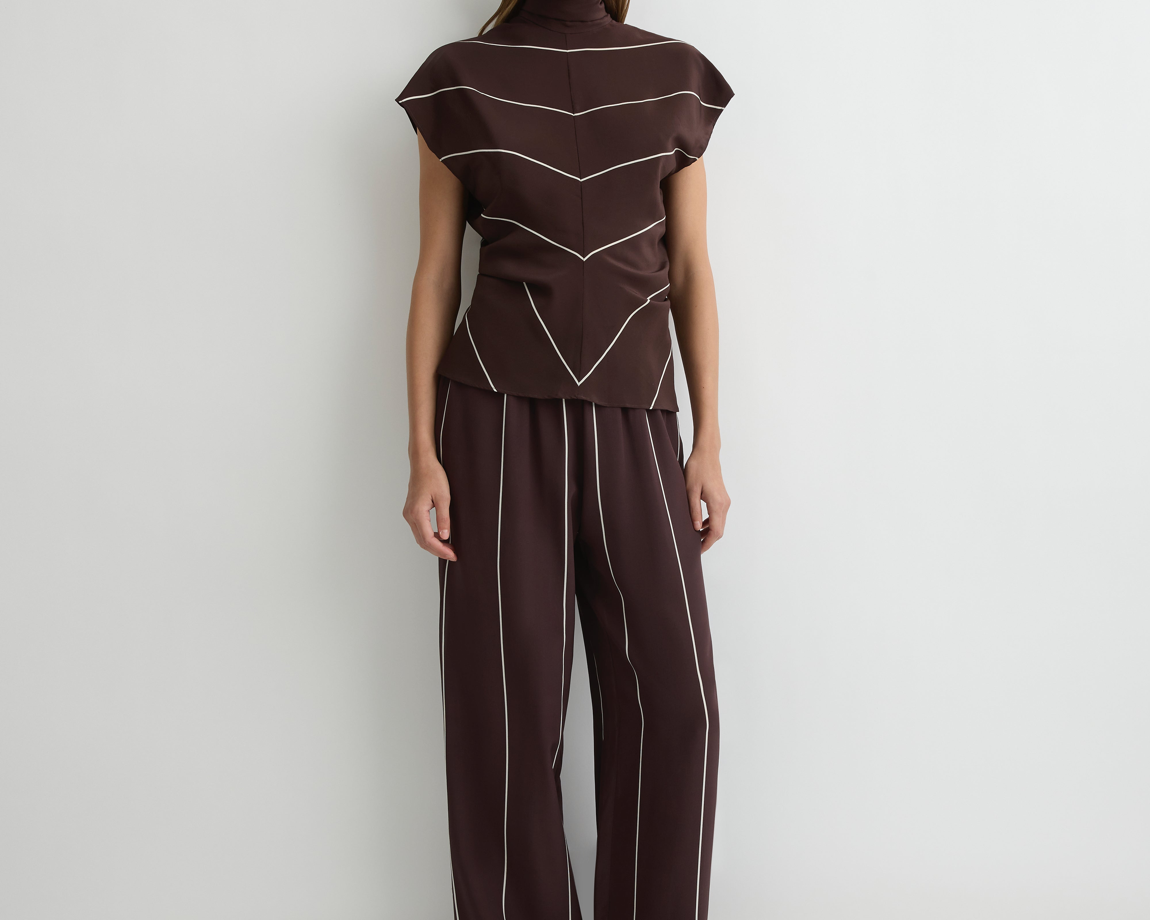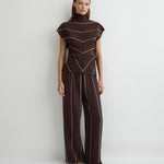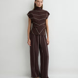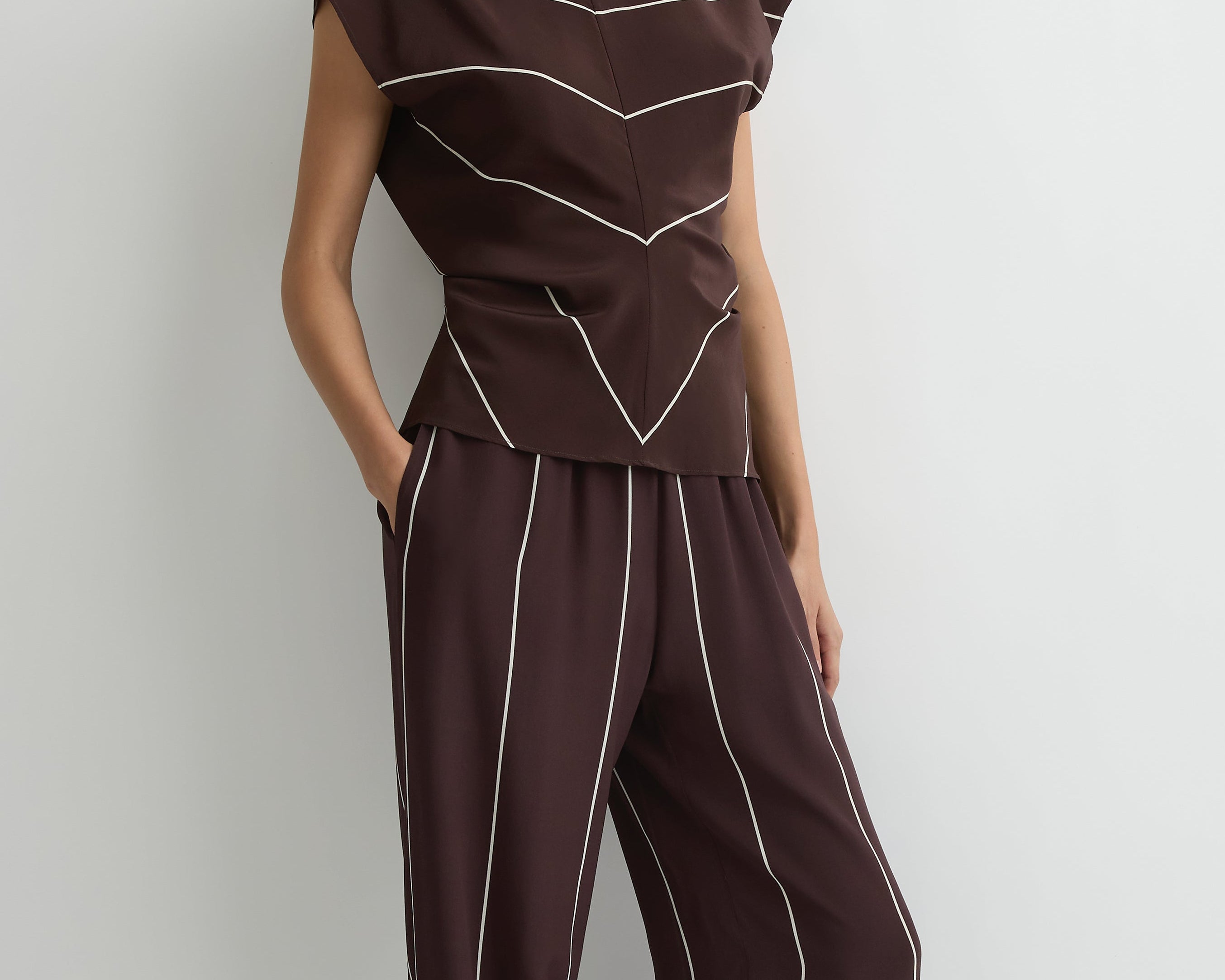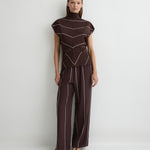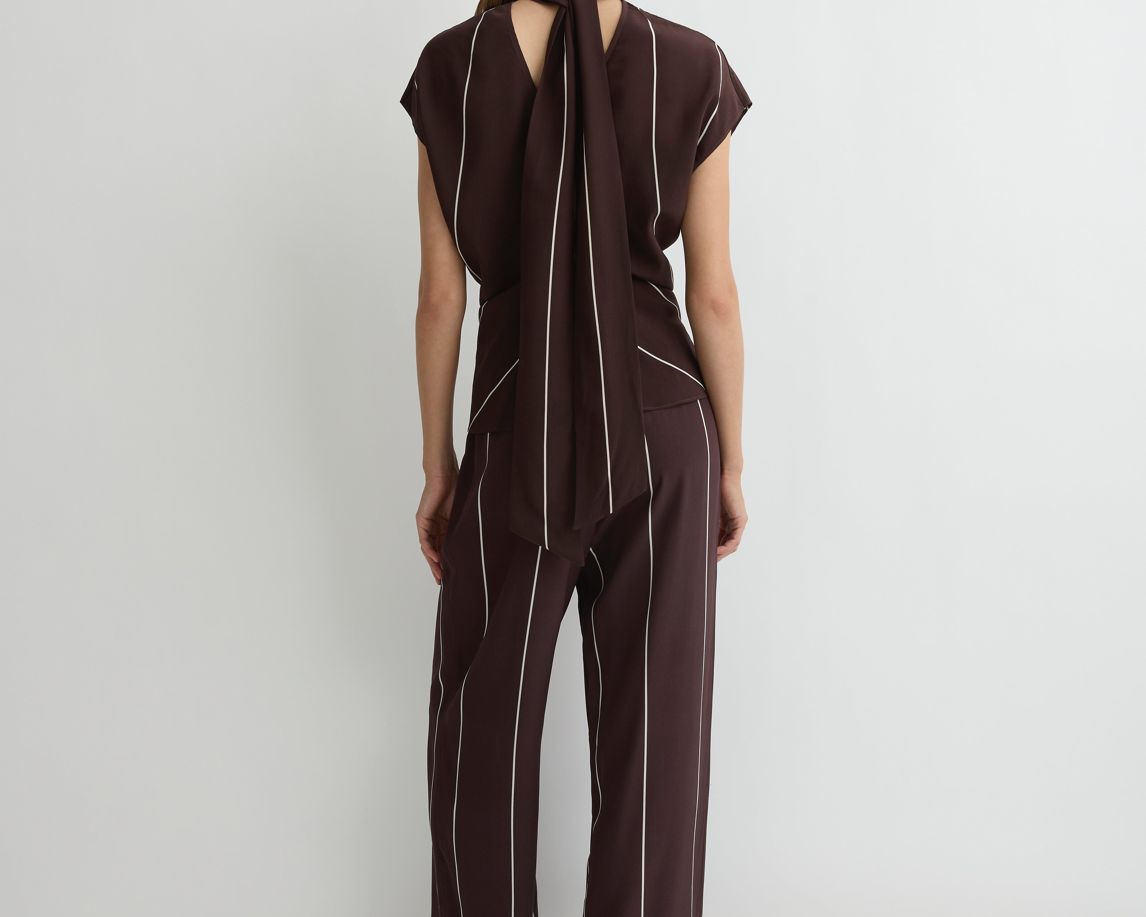 Introducing Bondi Born's Orta Silk Tie Neck Top in Mocha Stripe, a high-neck sleeveless top in rich mocha stripe. The Orta Tie Neck top is designed with a tailored silhouette through the waist, subtly flaring at the hem to flatter the figure, a sculptural high neckline, and is finished with capped shoulders and paneling for a balanced, minimalistic look.