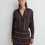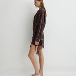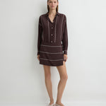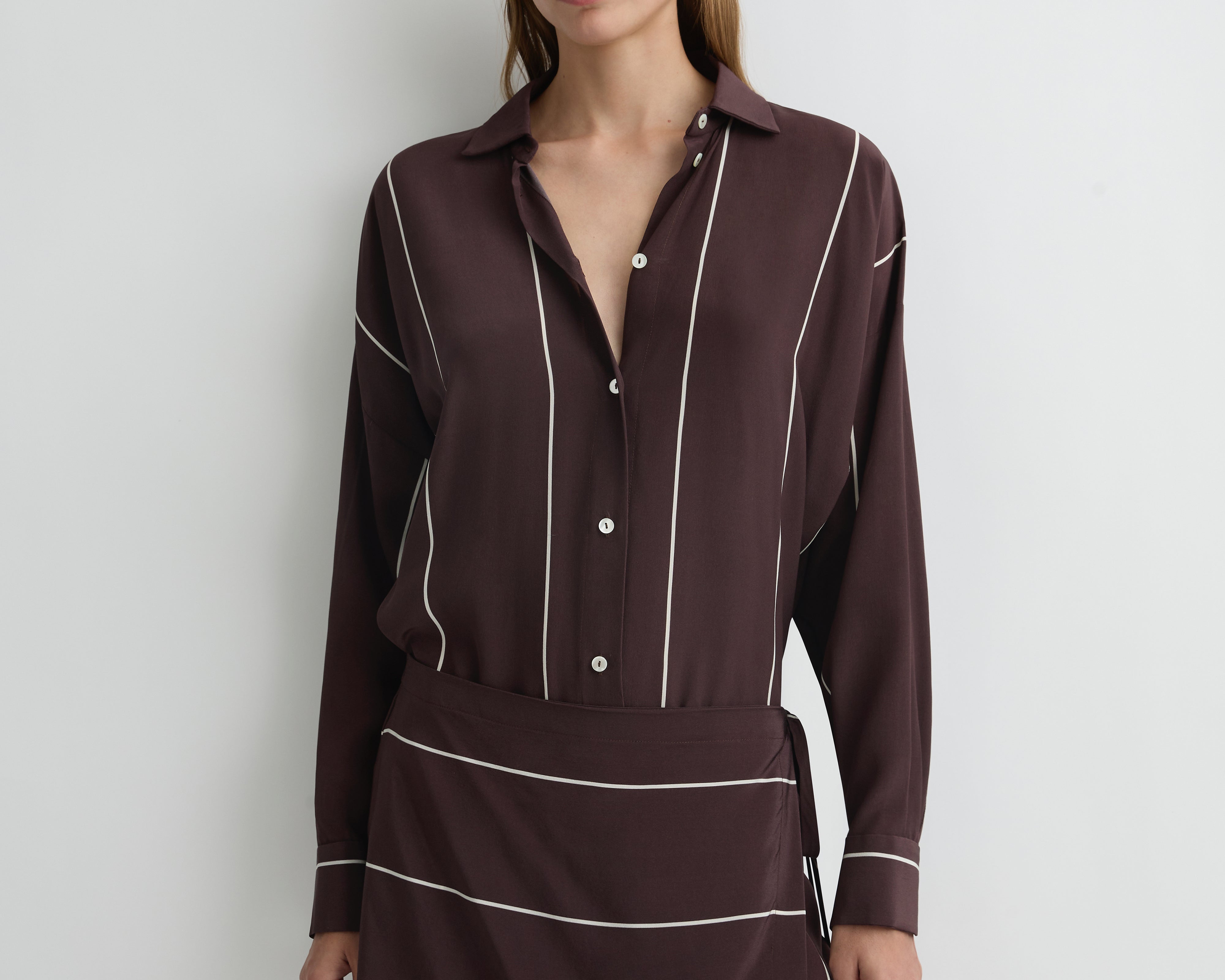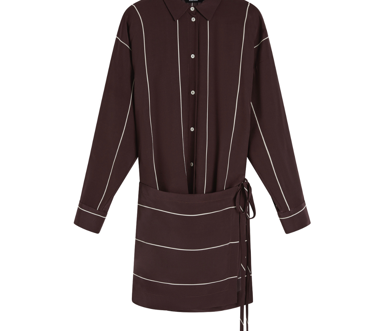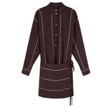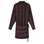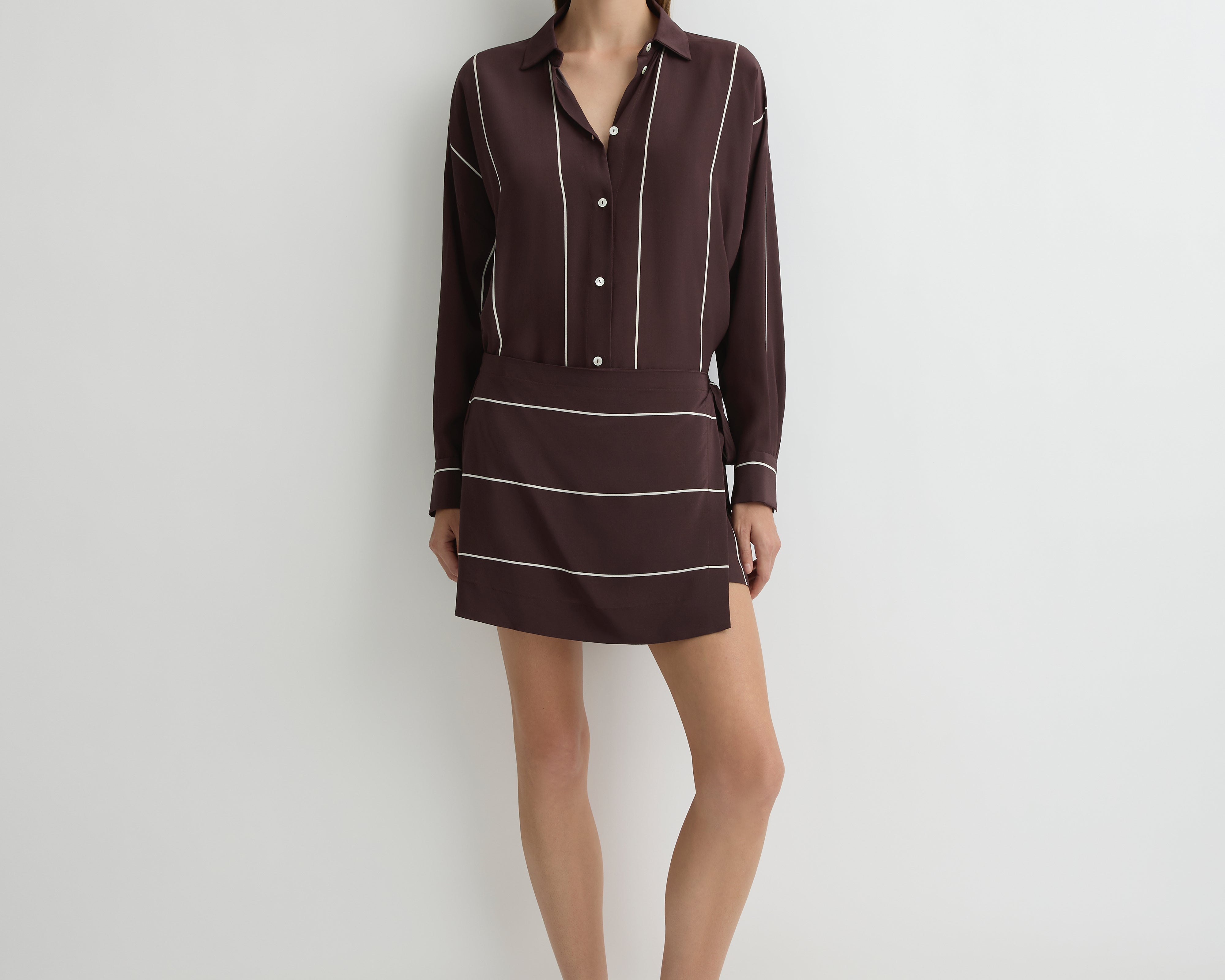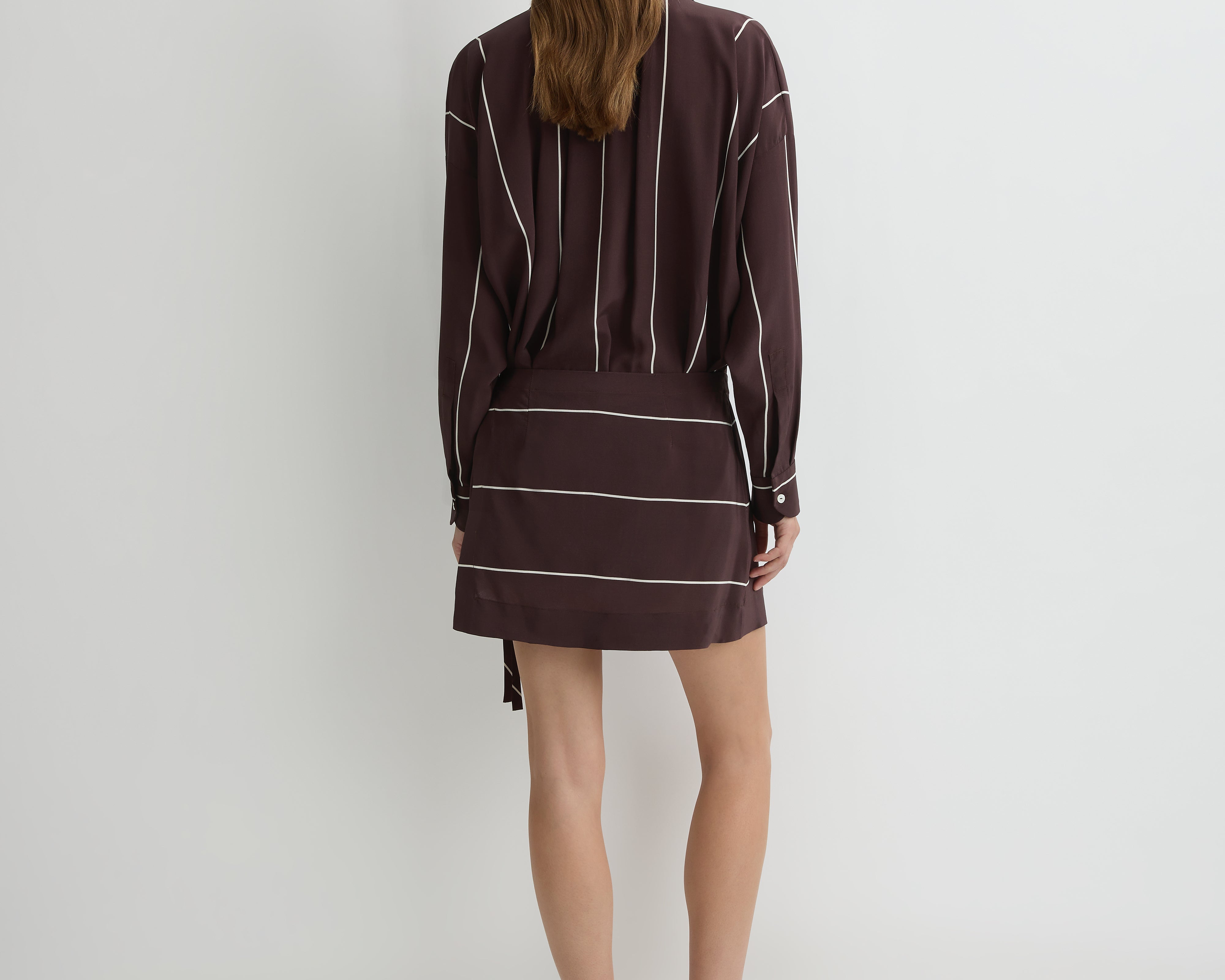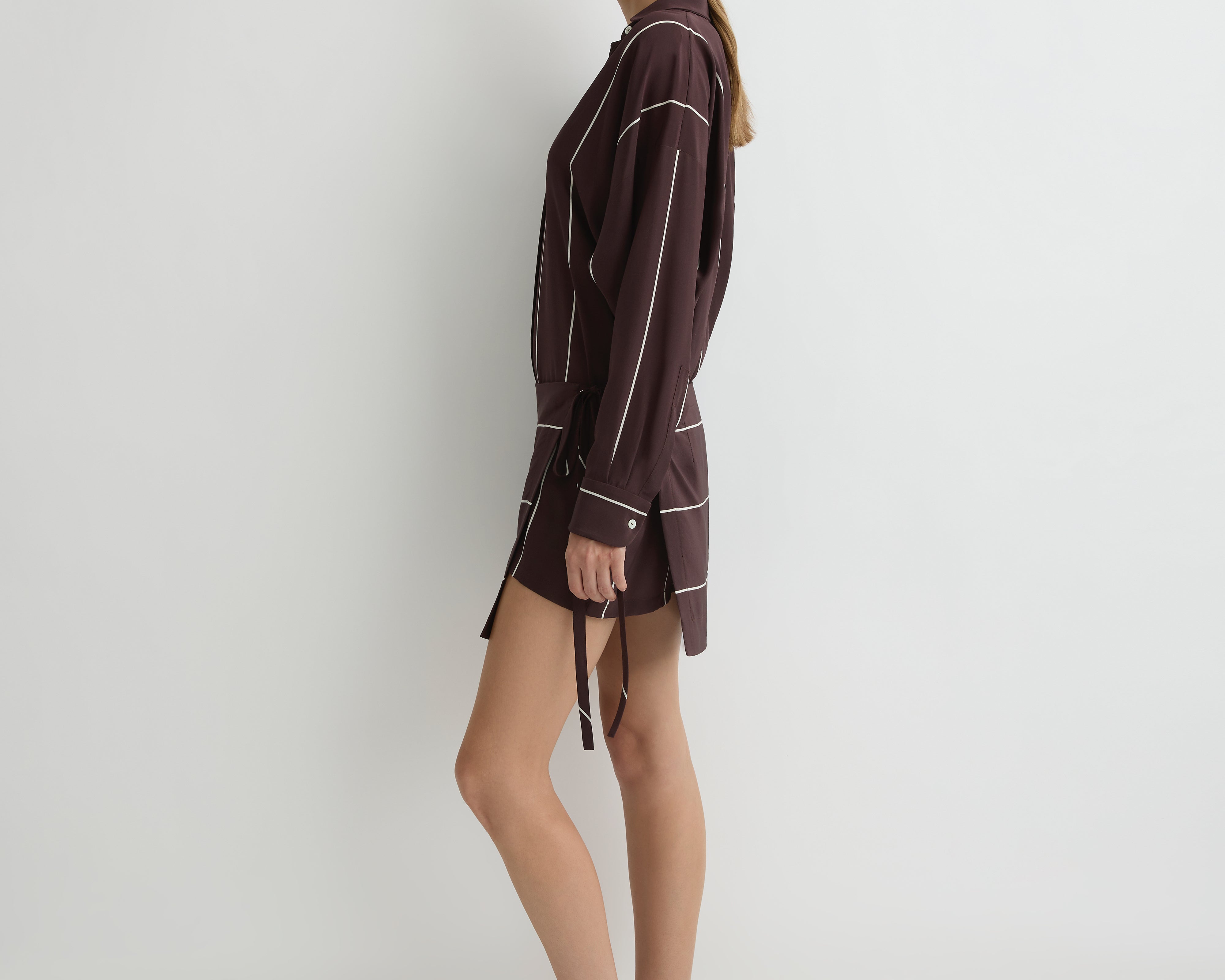 Introducing Bondi Born's Orta Silk Wrap Mini Dress in Stripe, a long-sleeve wrap mini dress silhouette in mocha stripe. The Orta mini dress features a classic long-sleeve button-up t-shirt bodice, while the bottom is a take on a cover-up that wraps across the body with a tie detail on the side of the hip. Perfect for a summer day or vacation-style dressing.