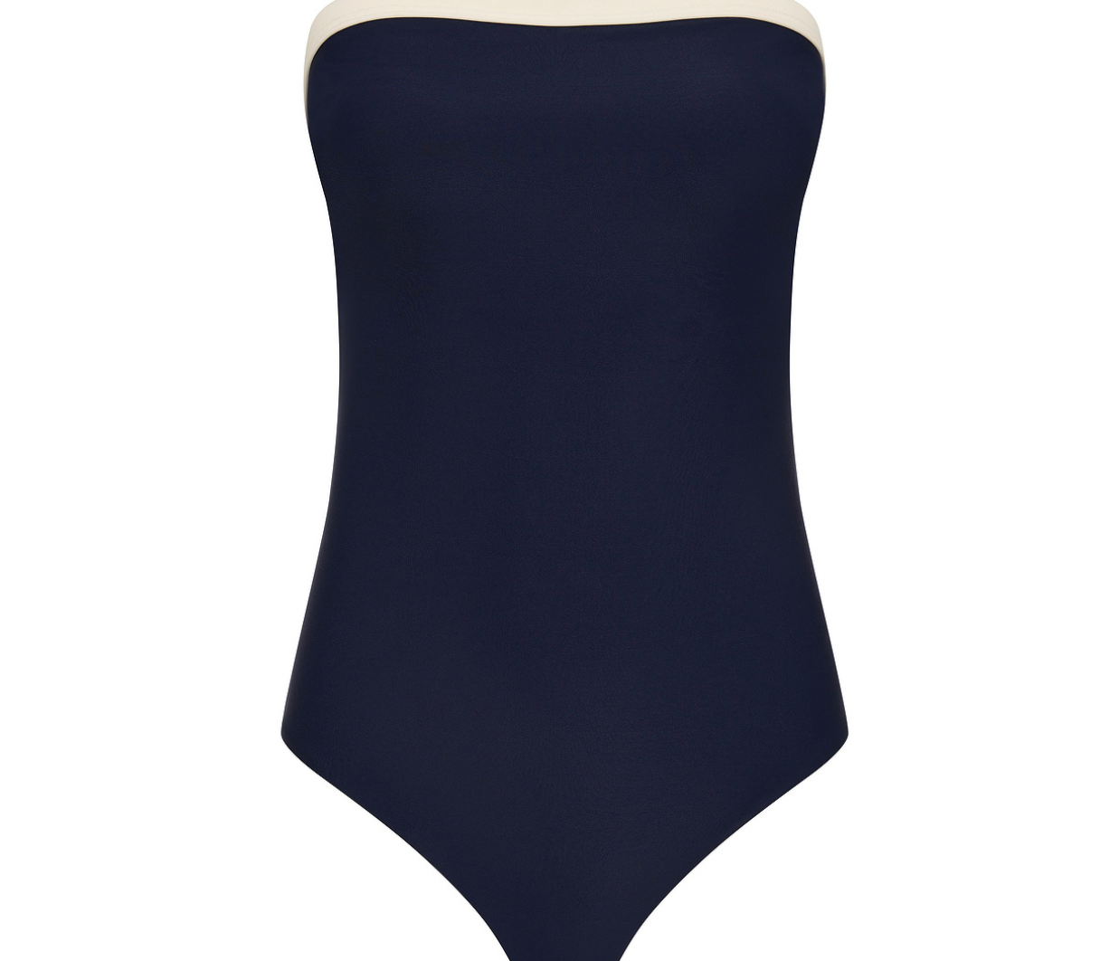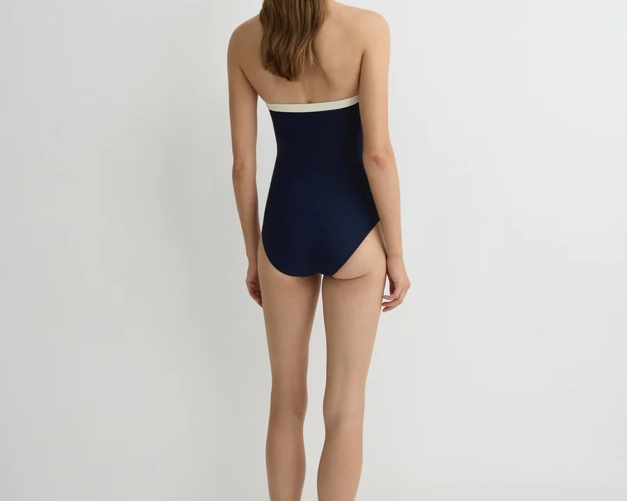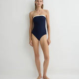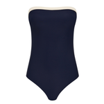 Introducing Bondi Born's Romy One Piece in Navy Pearl, a one-piece bandeau swimsuit in navy with pearl contrast edge lining. Designed with a contrast neckline and optional removable cups, the strapless silhouette is secured with gripper tape for a confident fit. Engineered with advanced 3D stretch technology, Sculpteur® sculpts and supports the body while remaining cool and breathable.